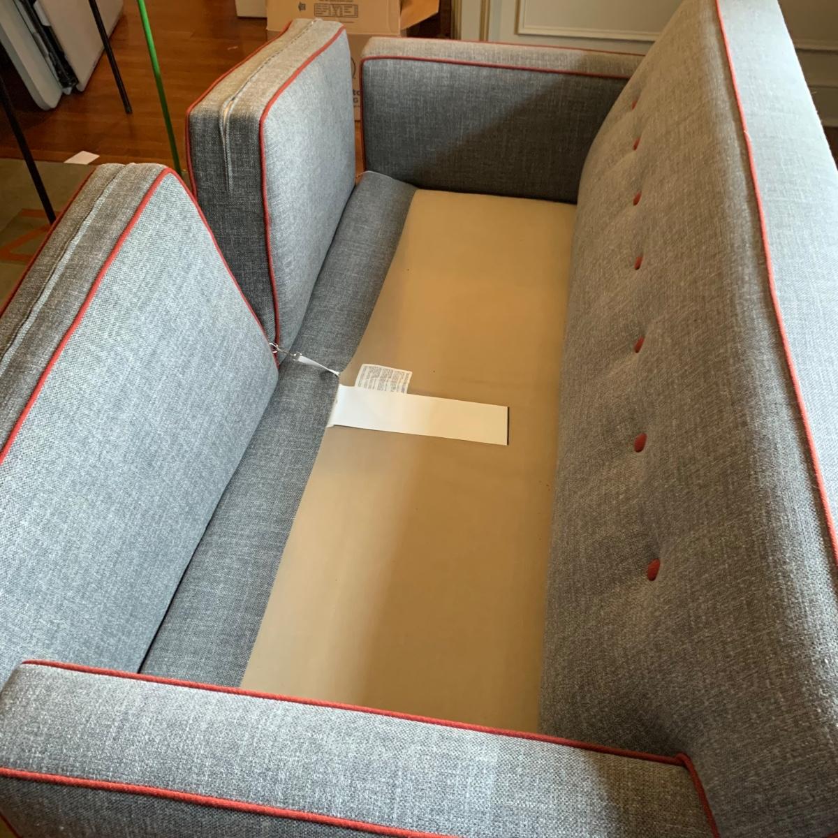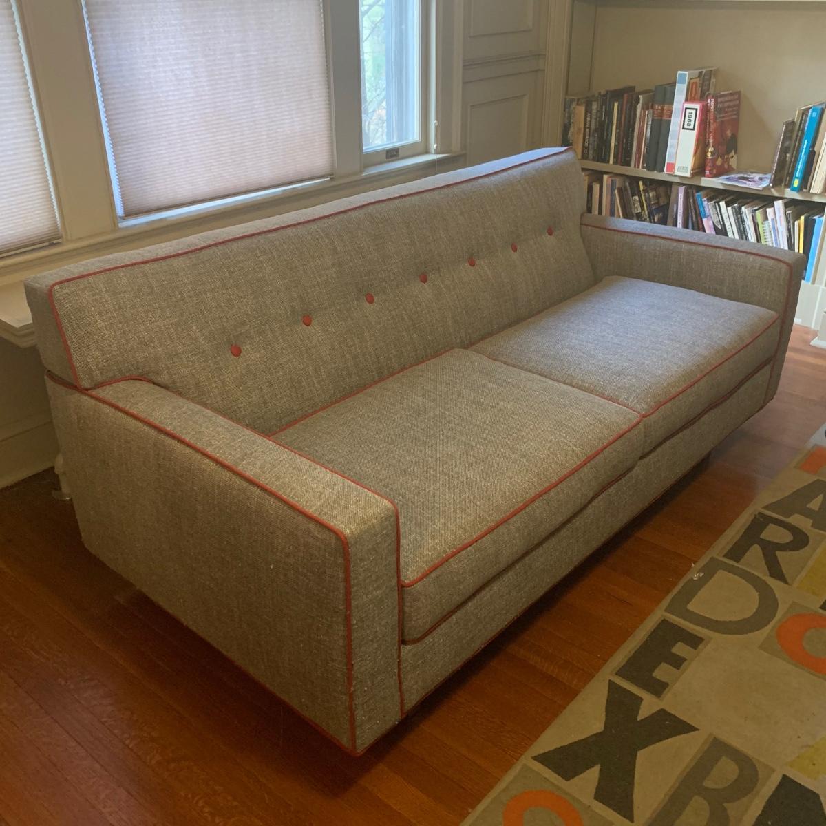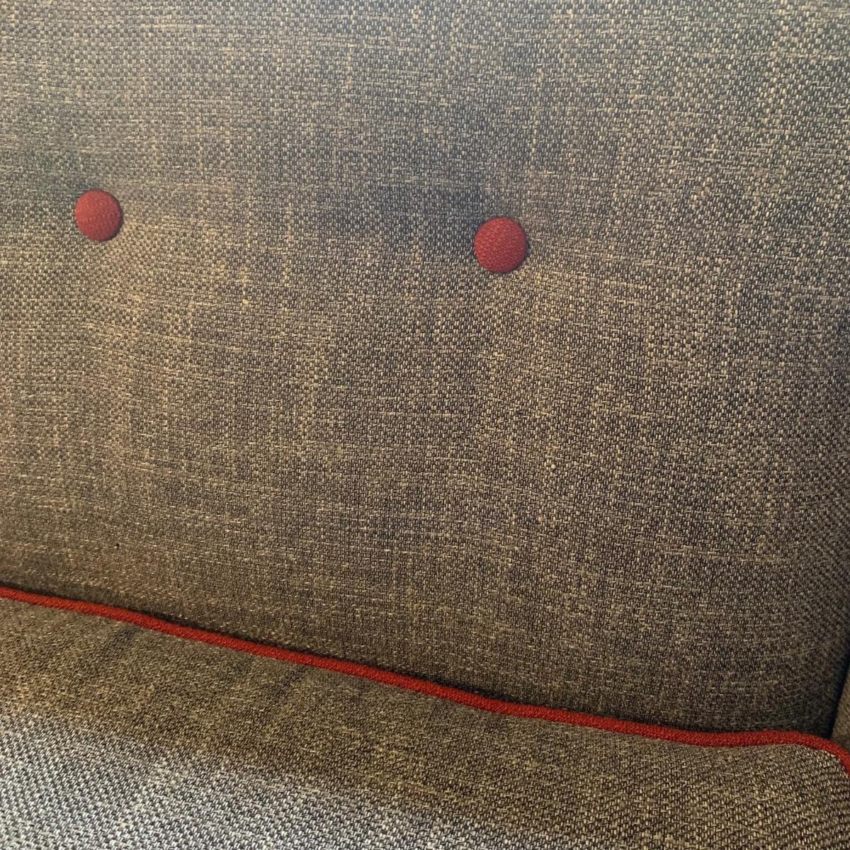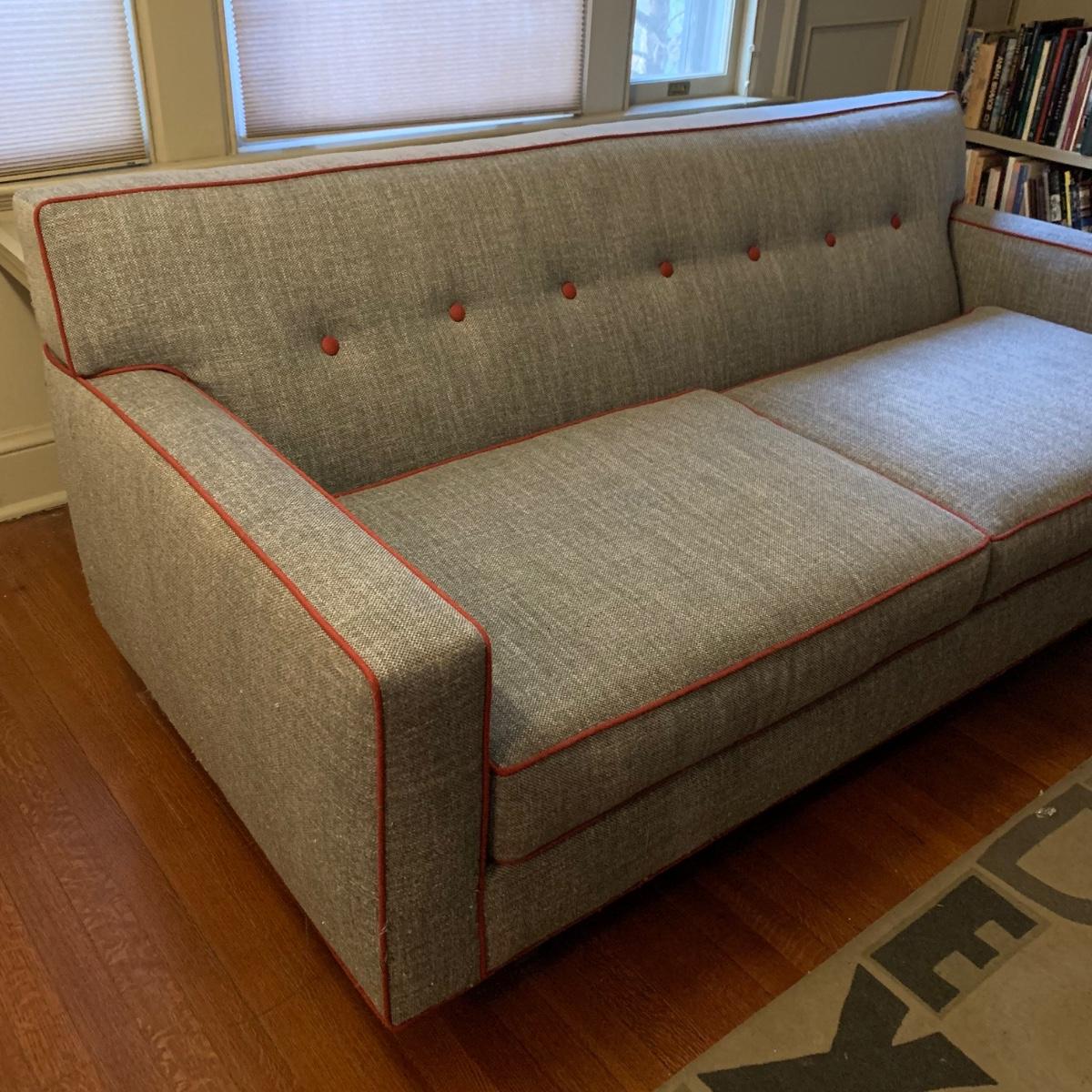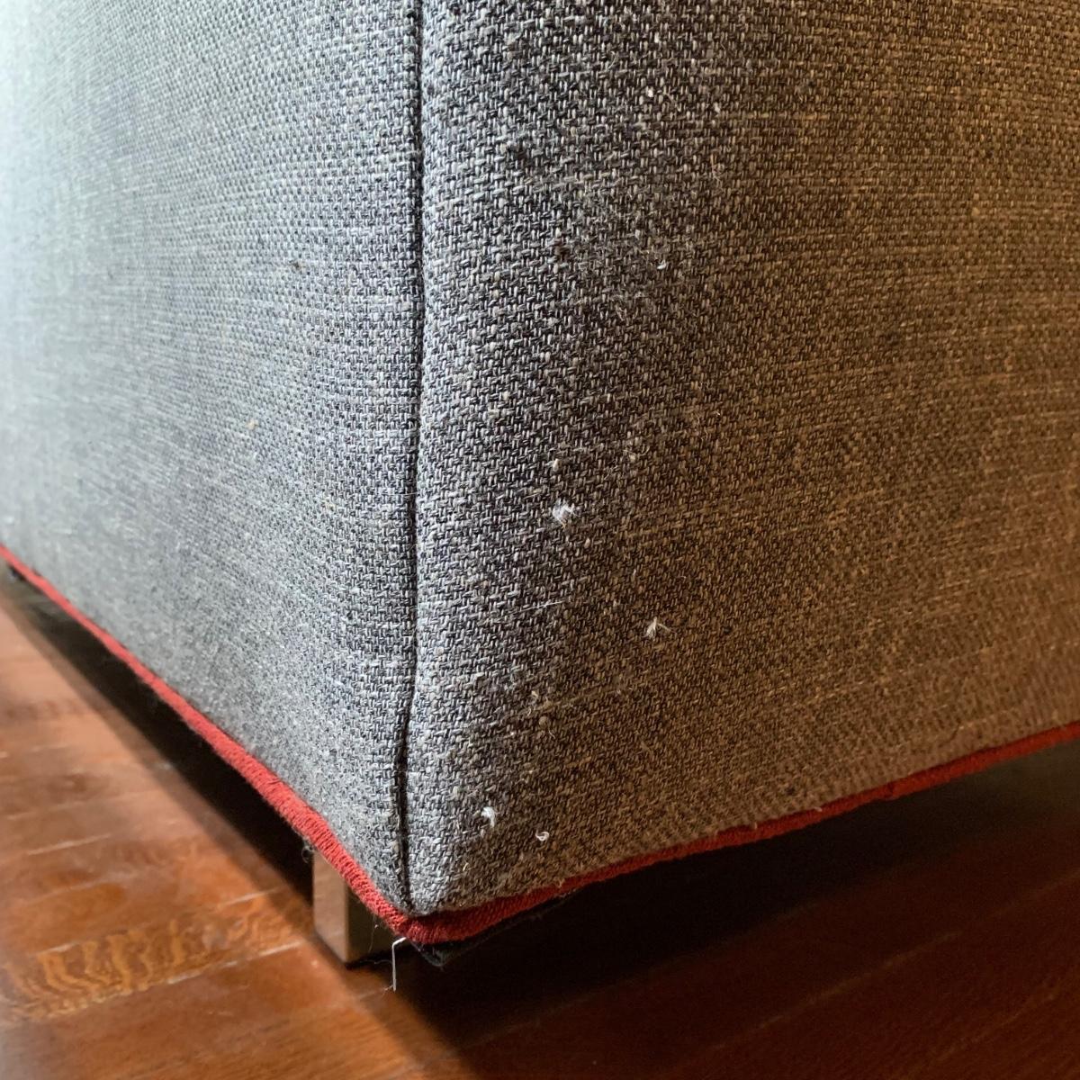 This stylish two-cushion sofa is from Rowe Furniture’s Dorset collection. It is a dark gray tweed material with a red button tufted back and eye-catching red welt cords. It features flat track arms, plush removable cushions, and exposed chrome legs. The sofa measures 73” x 36” x 32”H with a 19” seat height. Some loose threads and fraying apparent, see photos.
