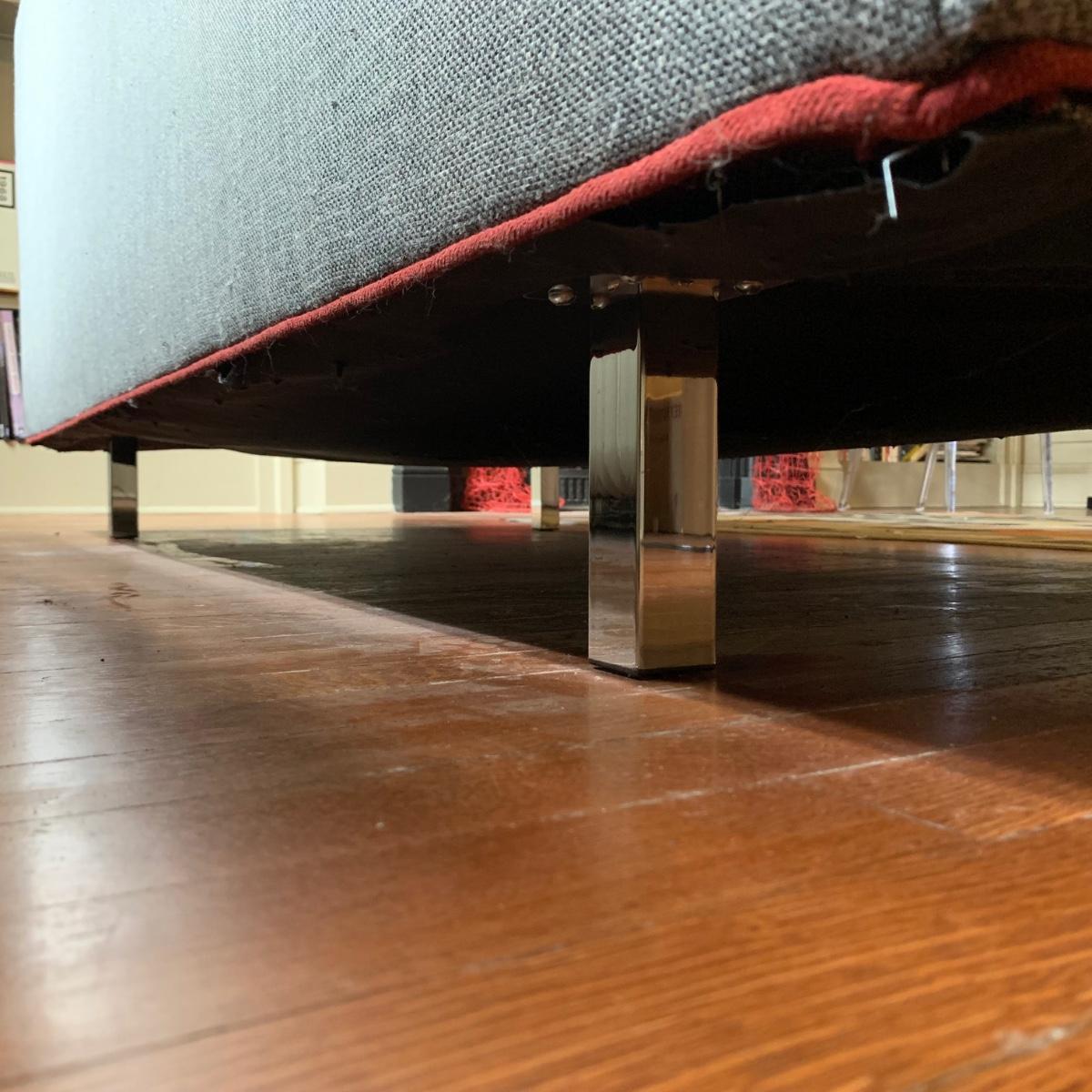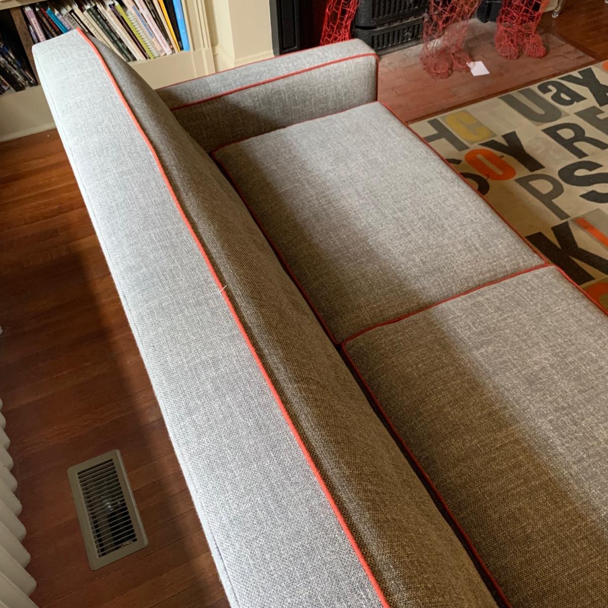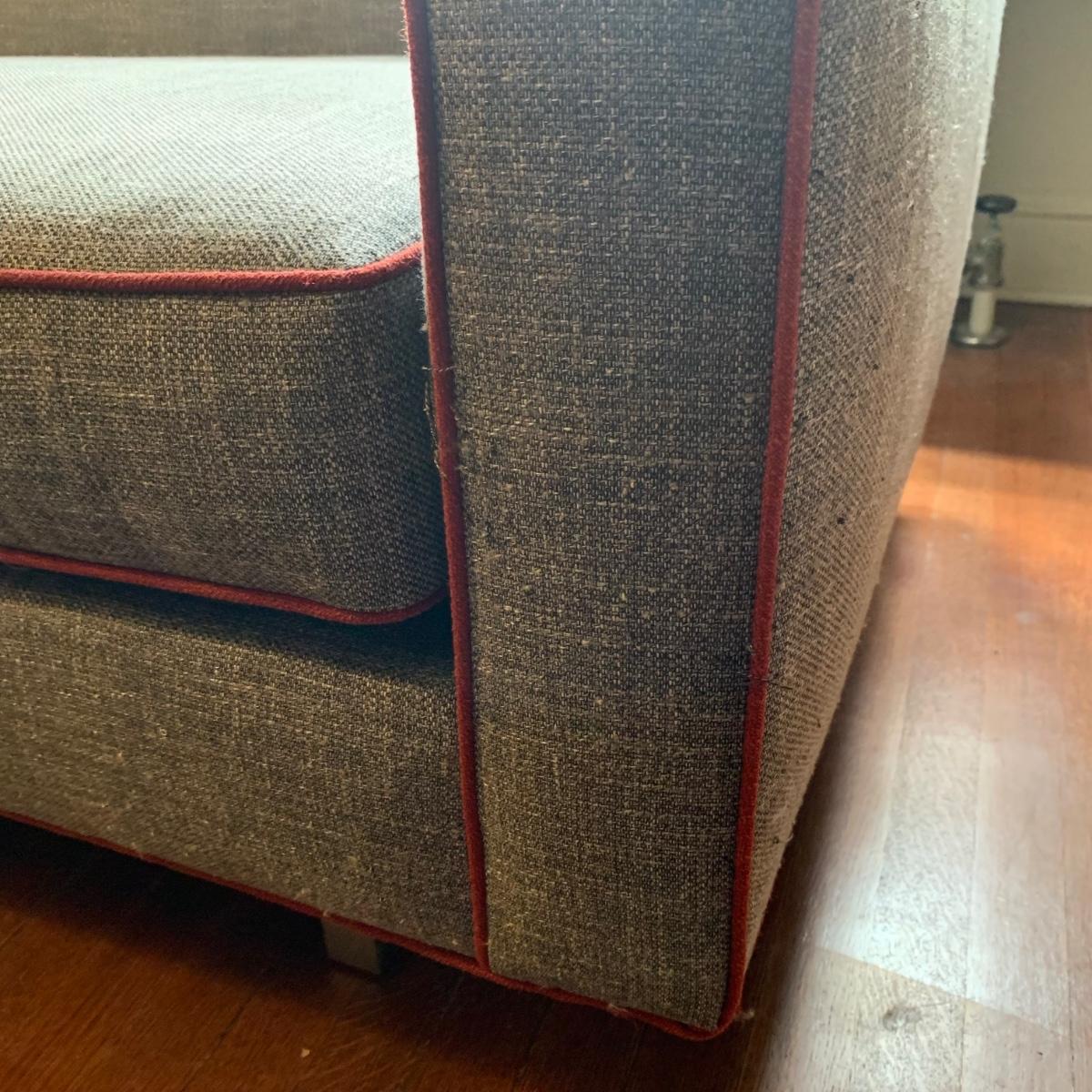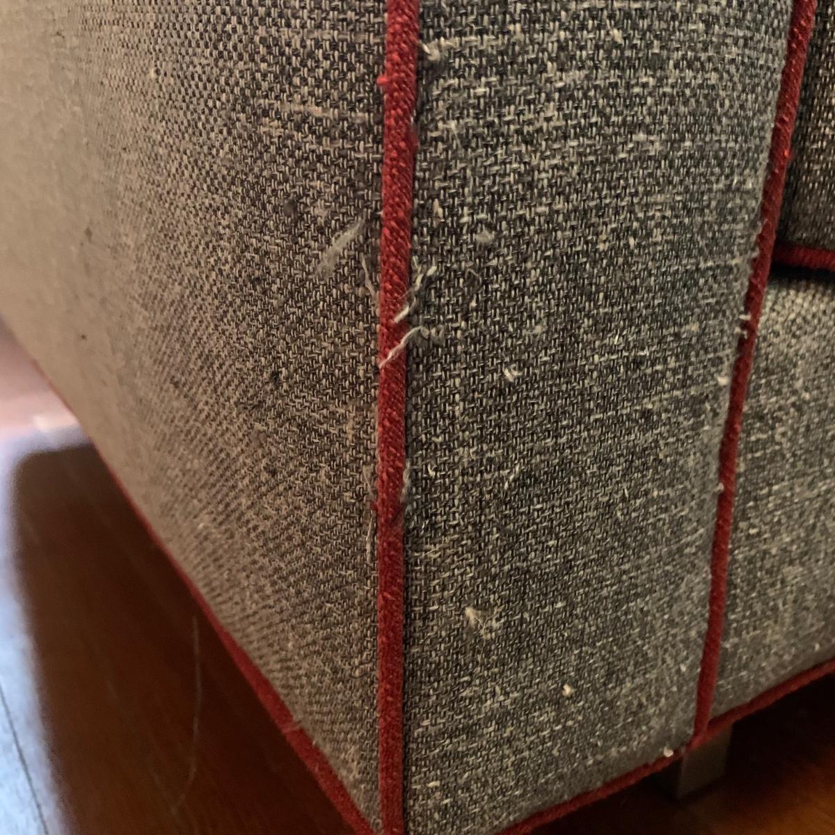 This stylish two-cushion sofa is from Rowe Furniture’s Dorset collection. It is a dark gray tweed material with a red button tufted back and eye-catching red welt cords. It features flat track arms, plush removable cushions, and exposed chrome legs. The sofa measures 73” x 36” x 32”H with a 19” seat height. Some loose threads and fraying apparent, see photos.