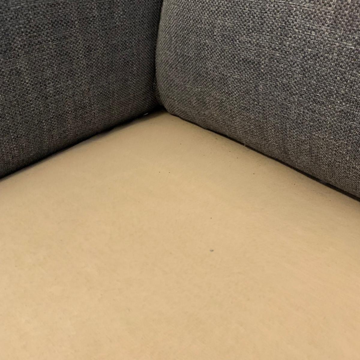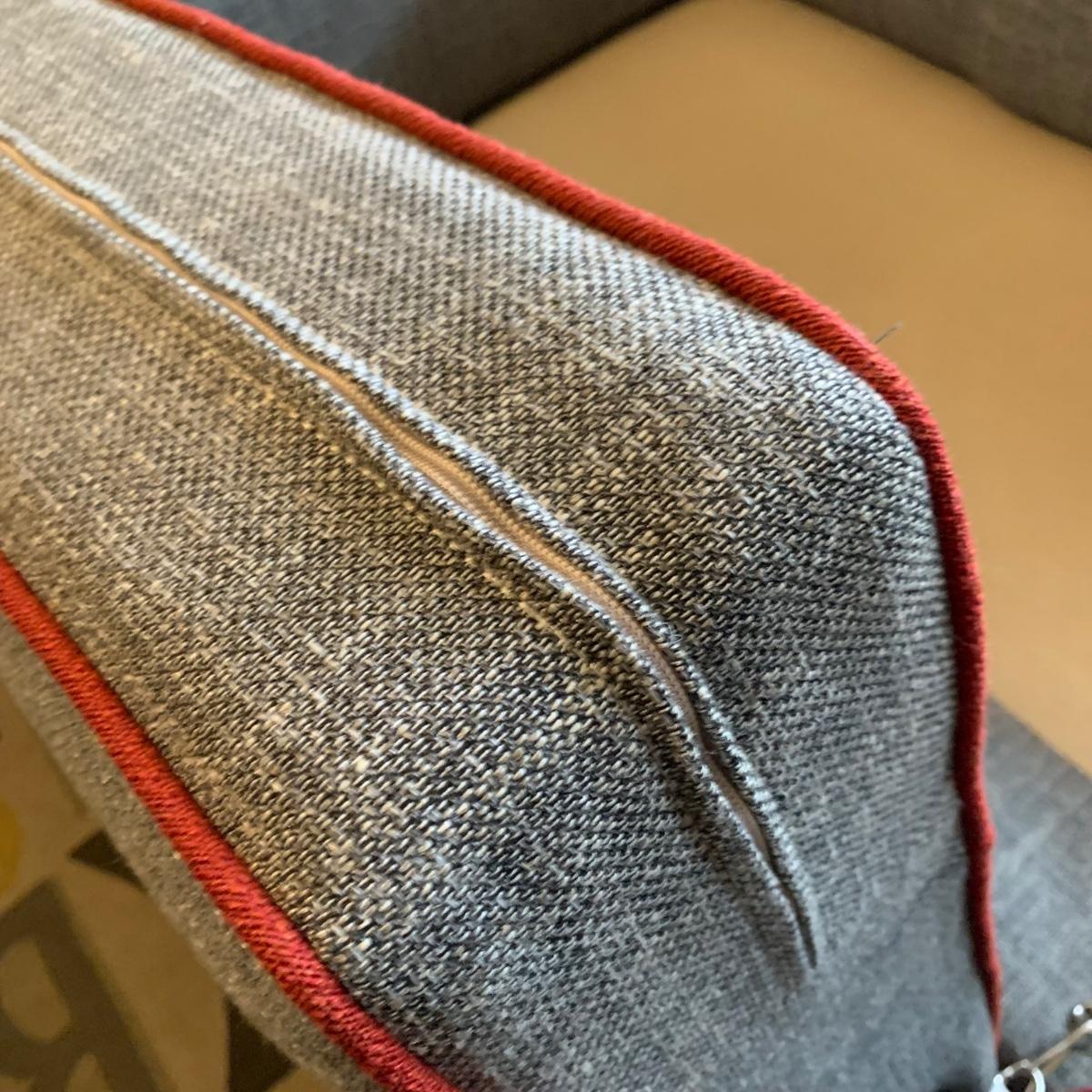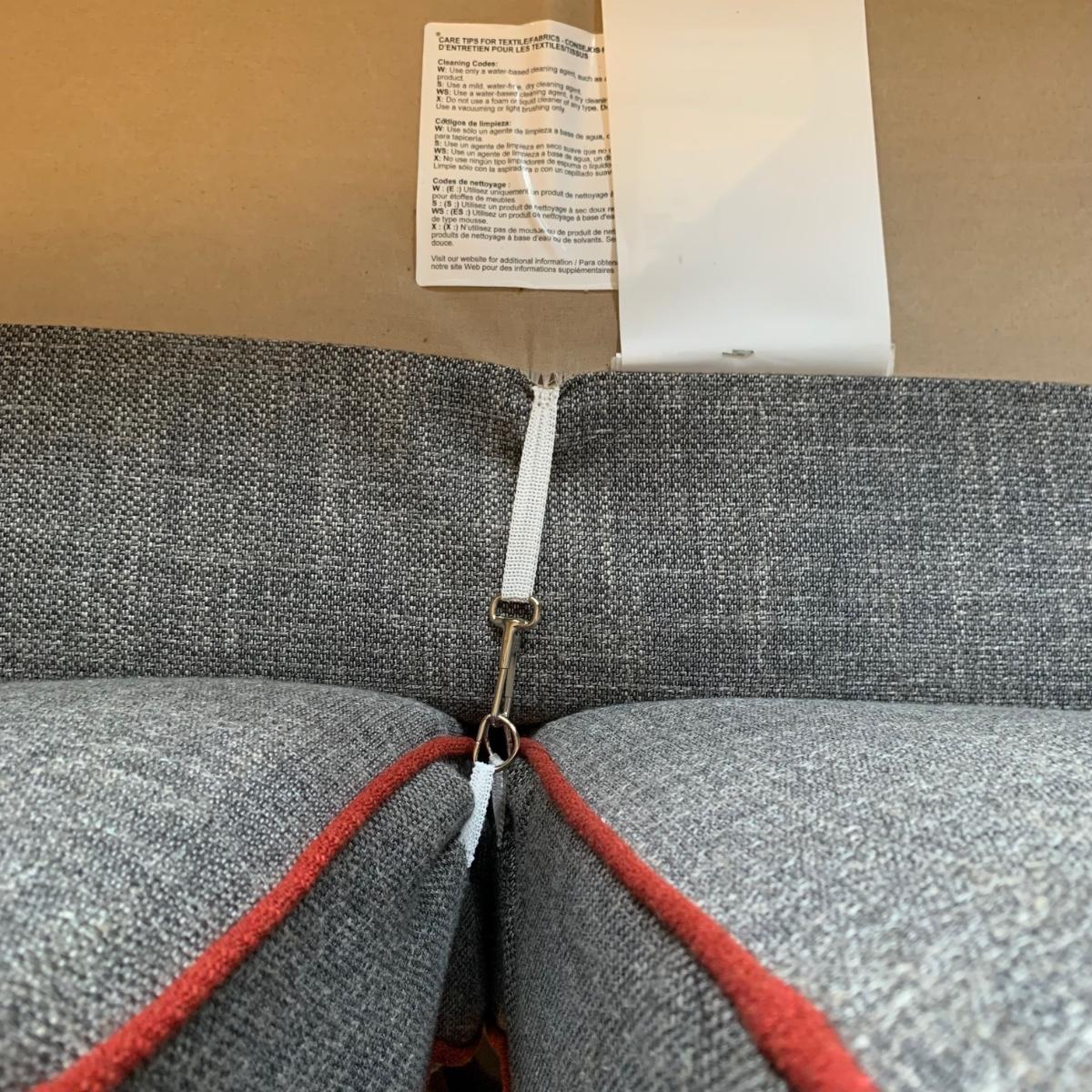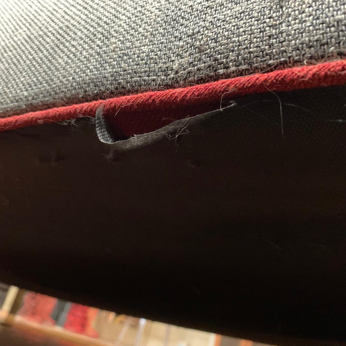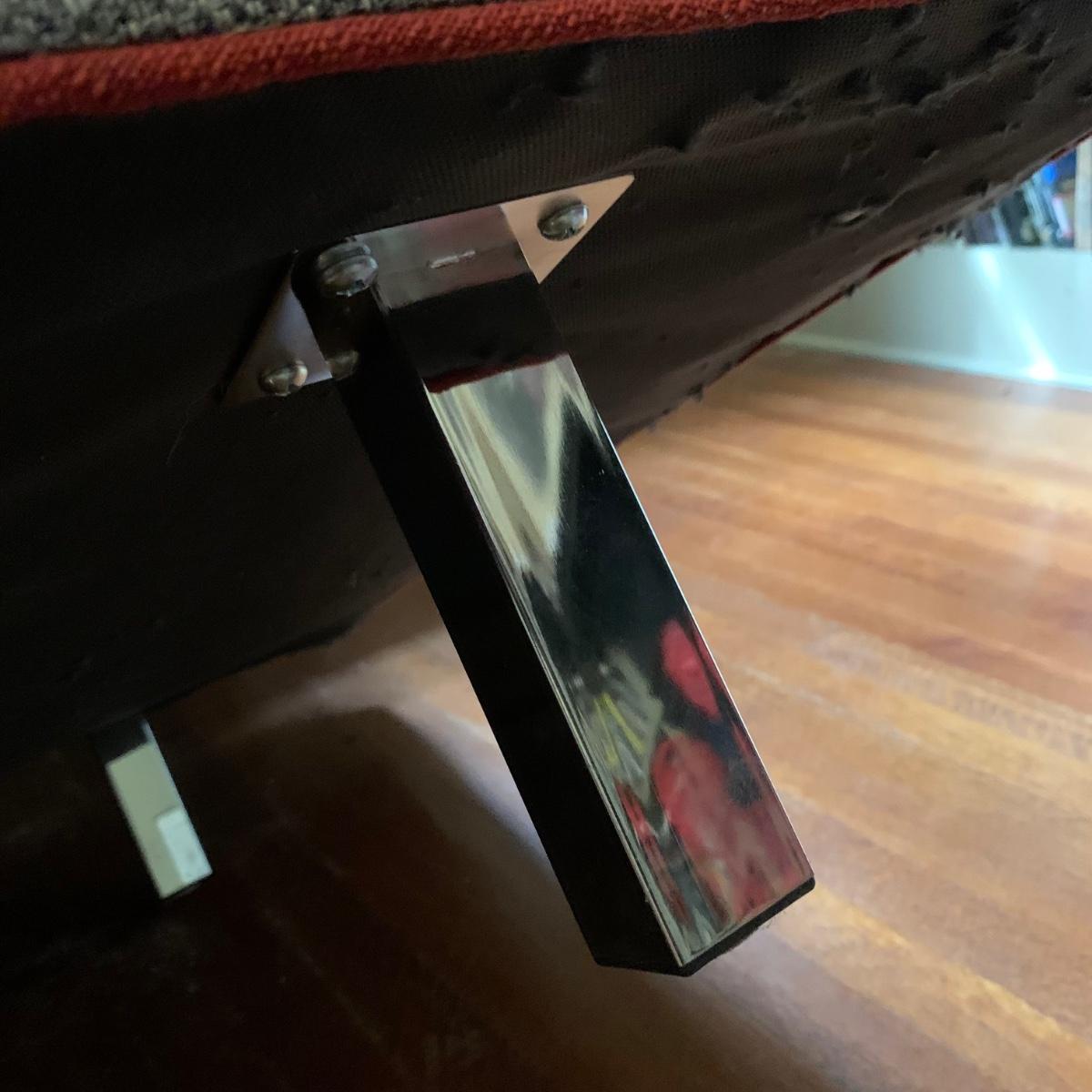 This stylish two-cushion sofa is from Rowe Furniture’s Dorset collection. It is a dark gray tweed material with a red button tufted back and eye-catching red welt cords. It features flat track arms, plush removable cushions, and exposed chrome legs. The sofa measures 73” x 36” x 32”H with a 19” seat height. Some loose threads and fraying apparent, see photos.