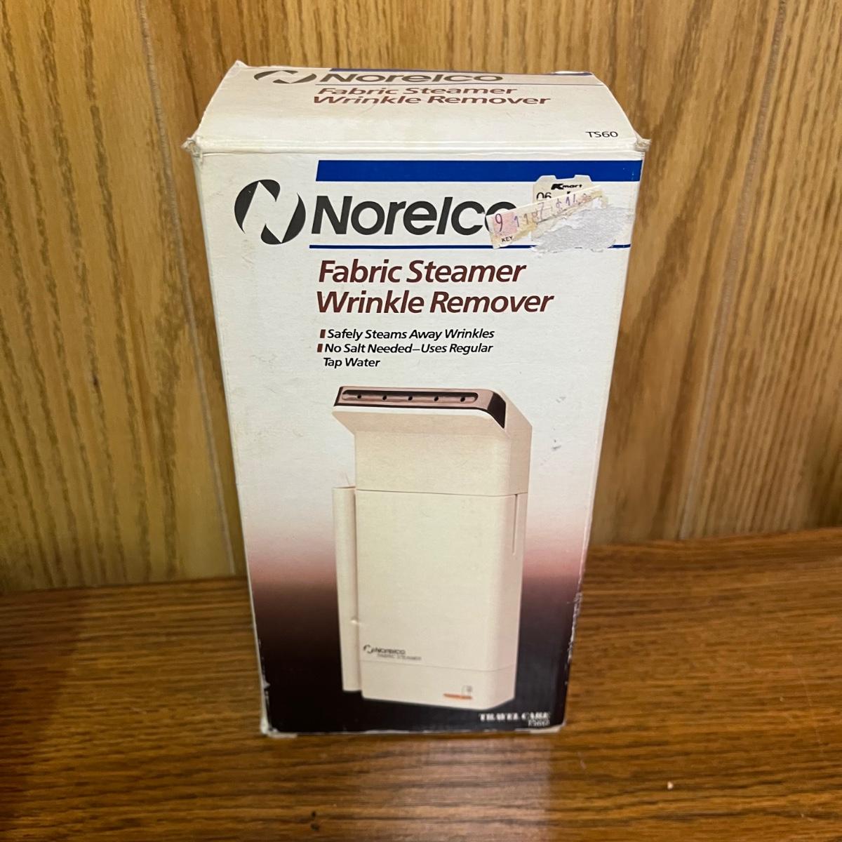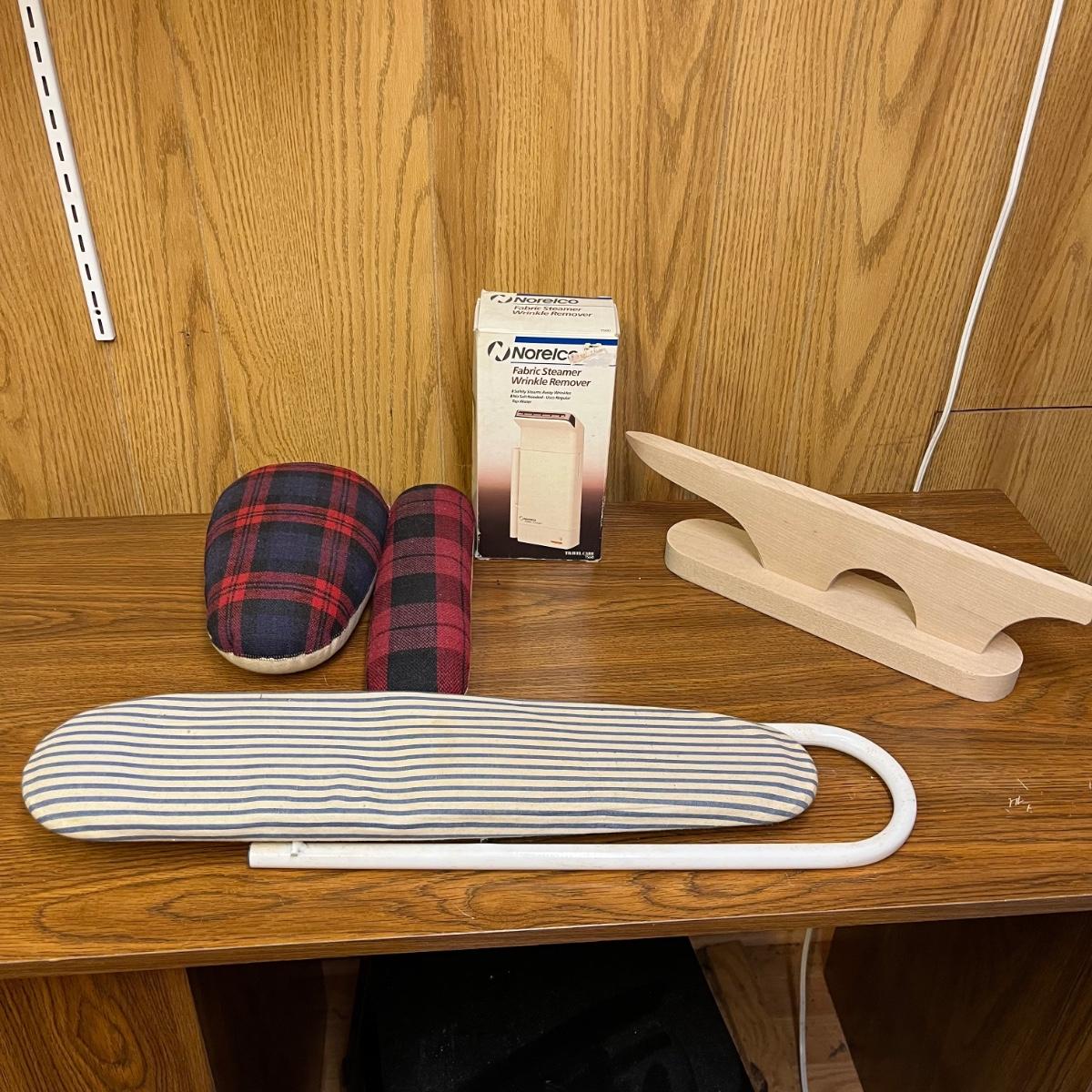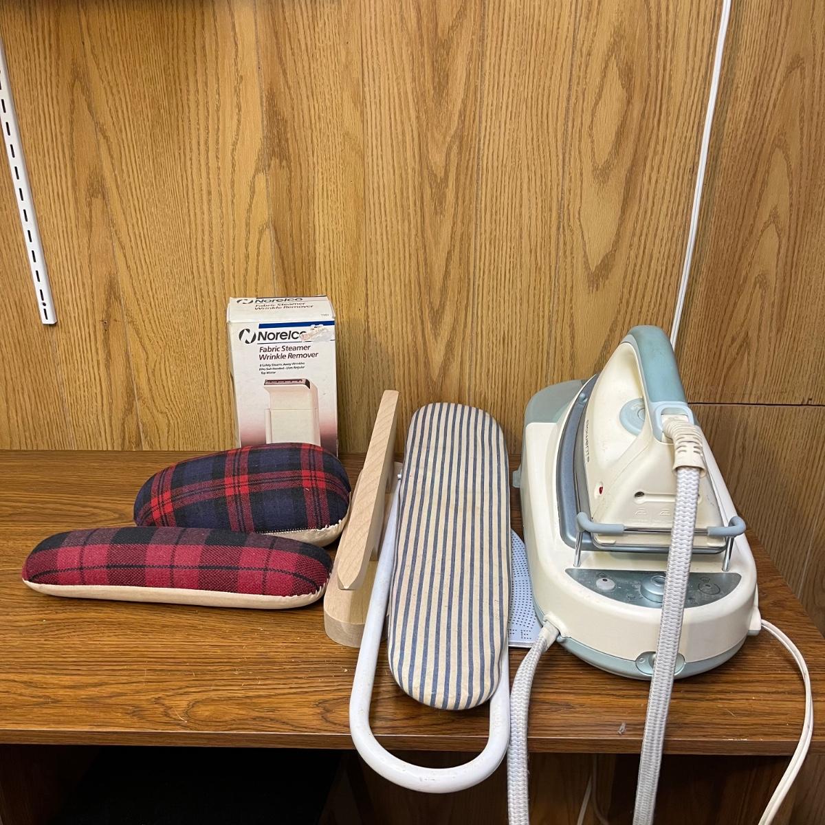 Lot includes a Rowenta Expert industrial steam iron with ironing board, Norelce steamer, wood point presser/clapper, tailors ham and seam roll. Machines powered on when tested.