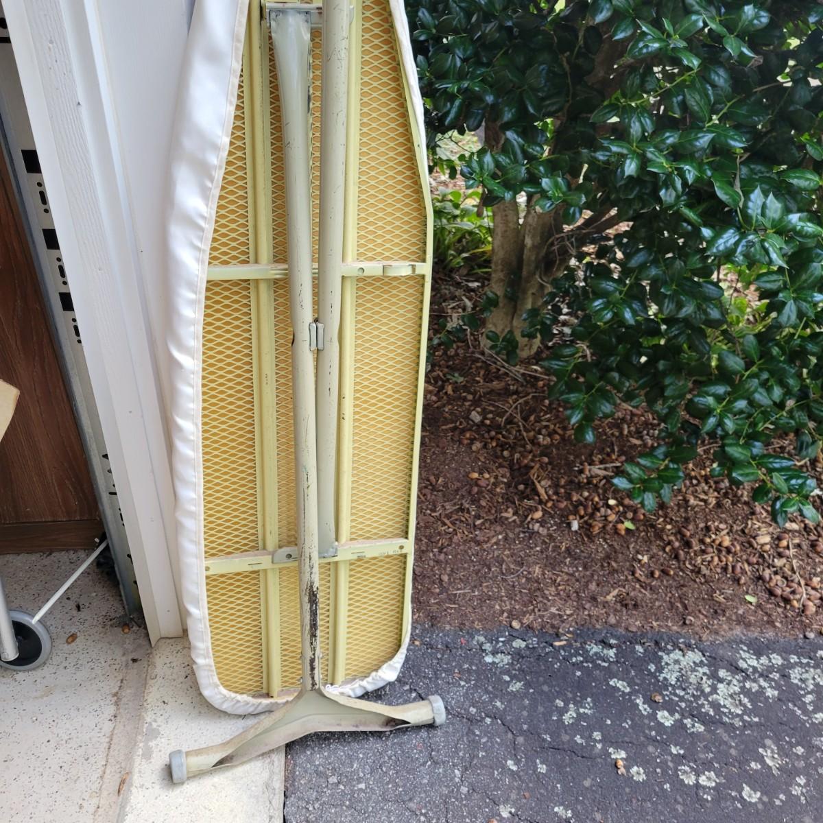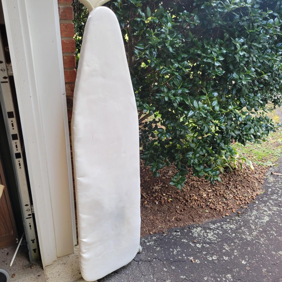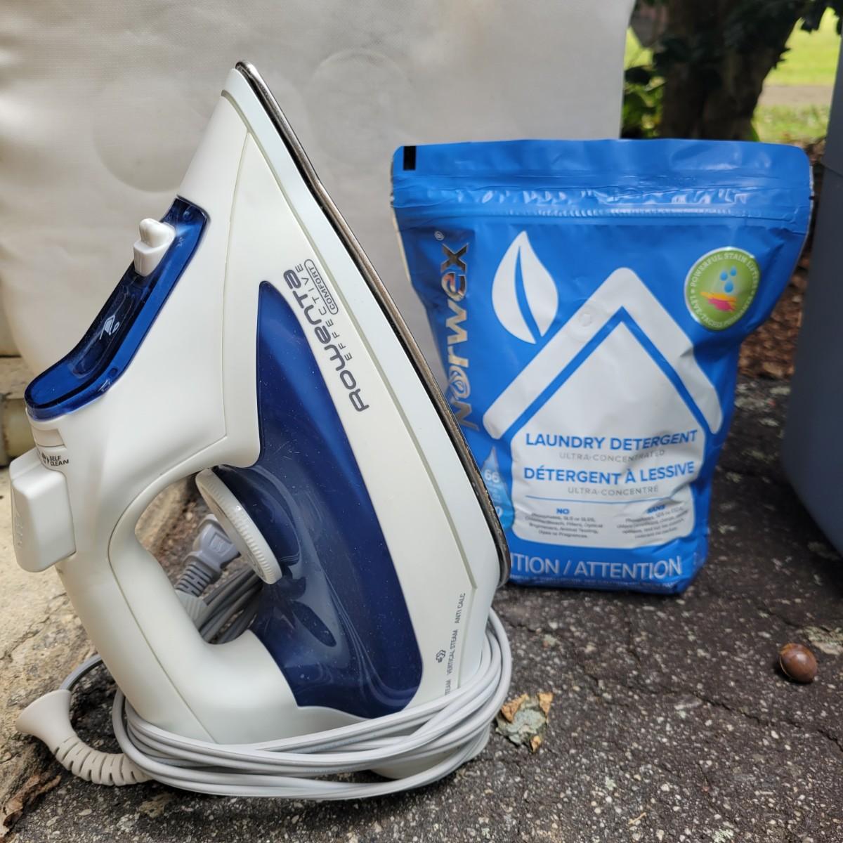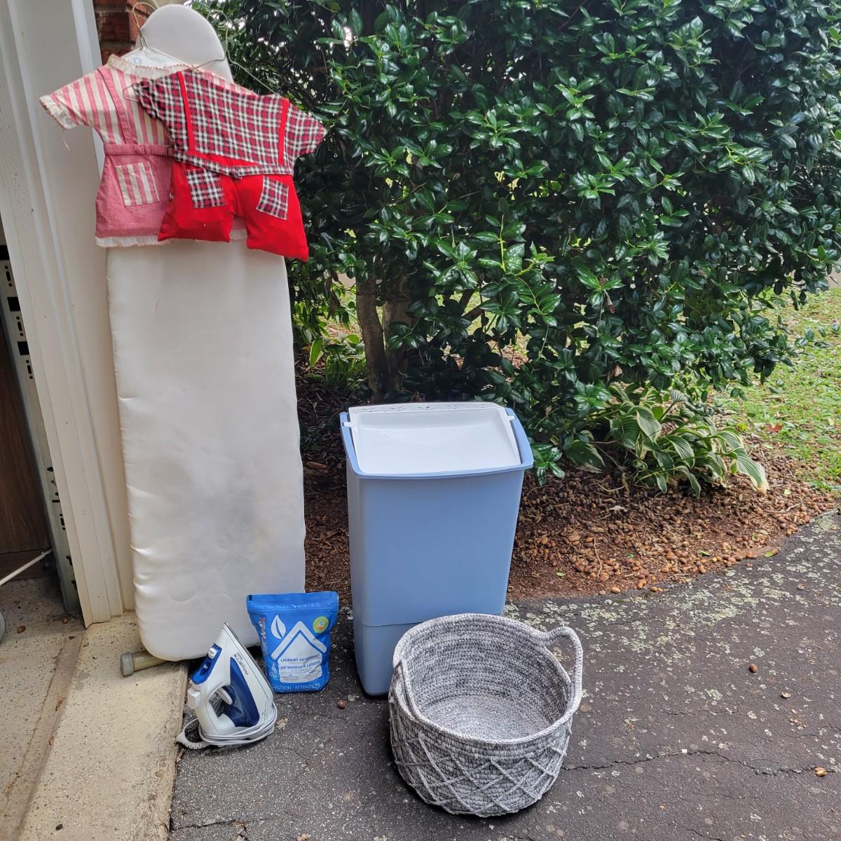A grouping of laundry accessories that includes a Rowenta iron that powered on when plugged in. It has some smudges on the iron face. Also included are a full size ironing board, an unopened bag of Norwex laundry detergent, a small woven basket, a trashcan and two cute little clothes pin hangers. Local pickup only