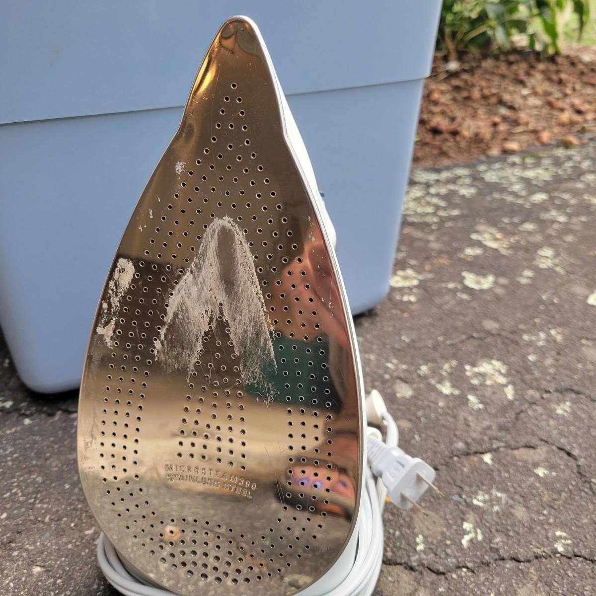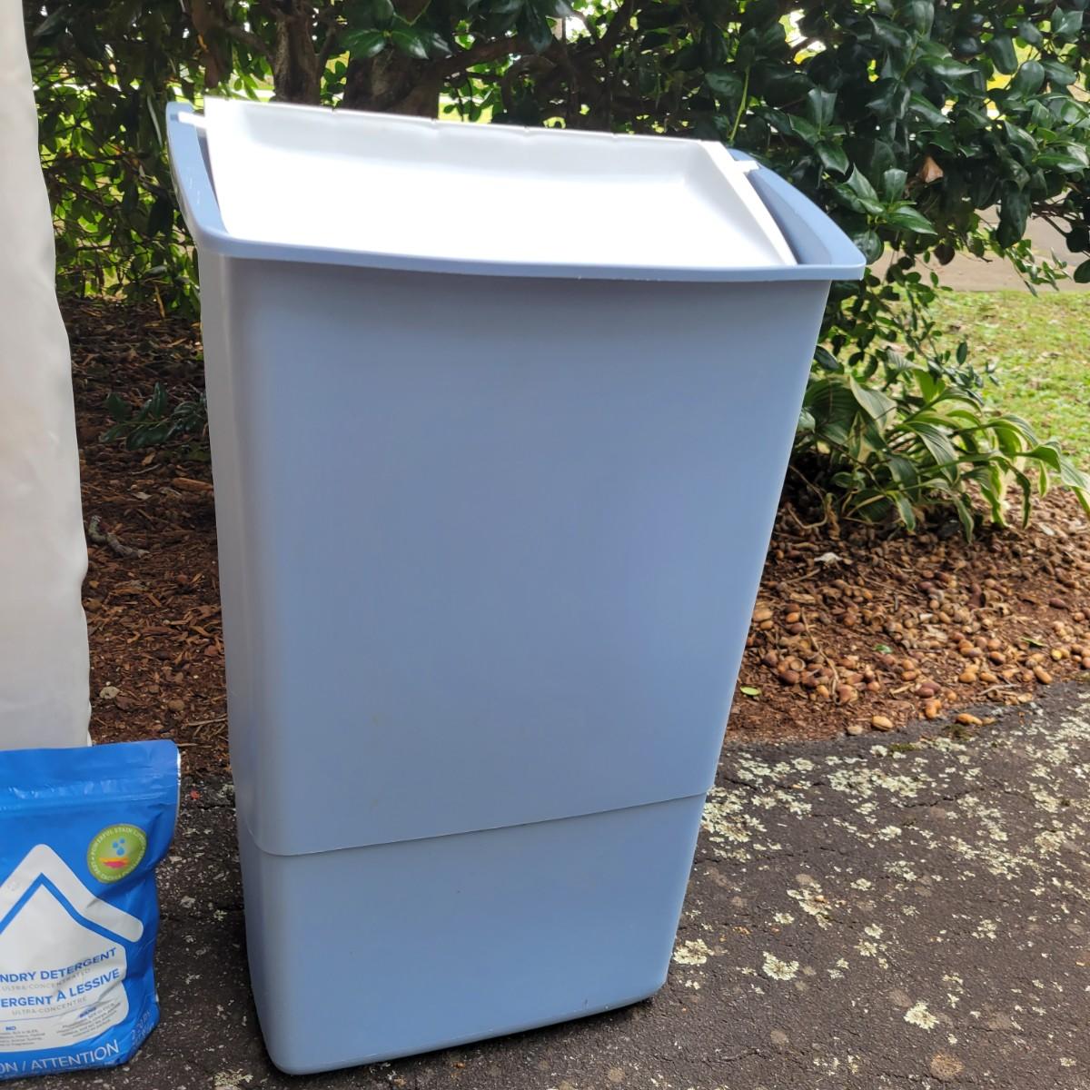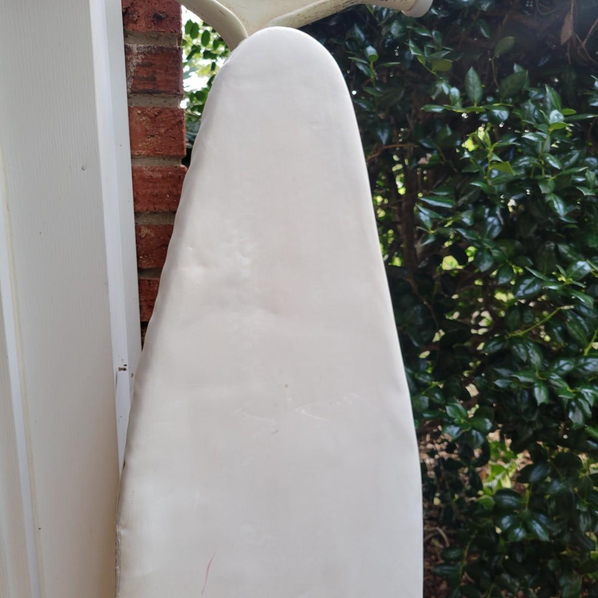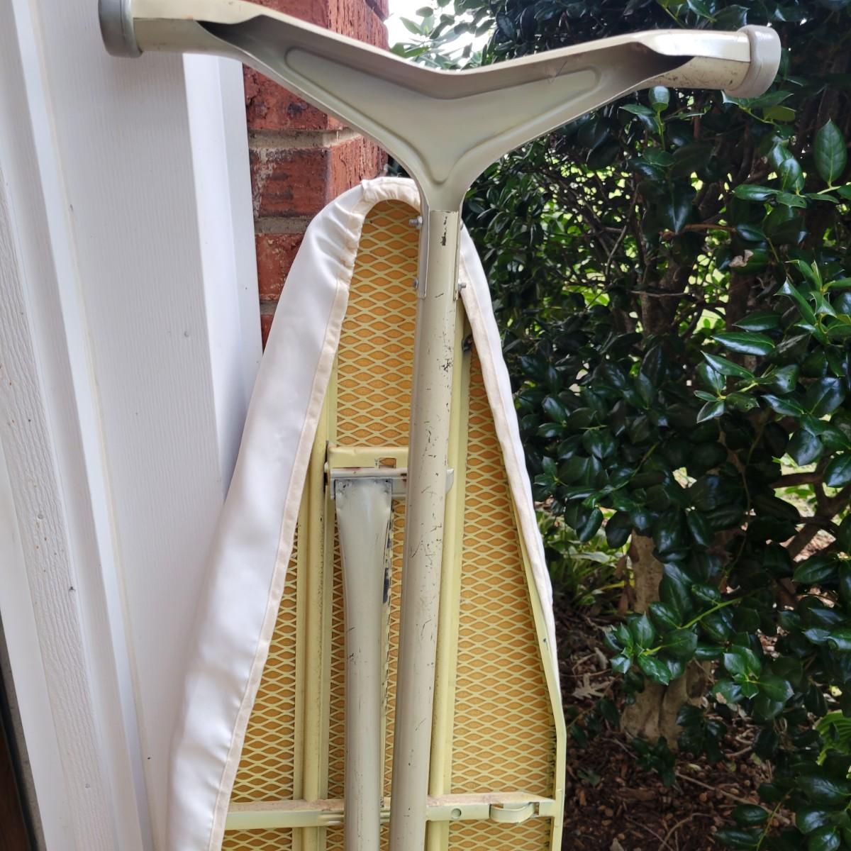 A grouping of laundry accessories that includes a Rowenta iron that powered on when plugged in. It has some smudges on the iron face. Also included are a full size ironing board, an unopened bag of Norwex laundry detergent, a small woven basket, a trashcan and two cute little clothes pin hangers. Local pickup only