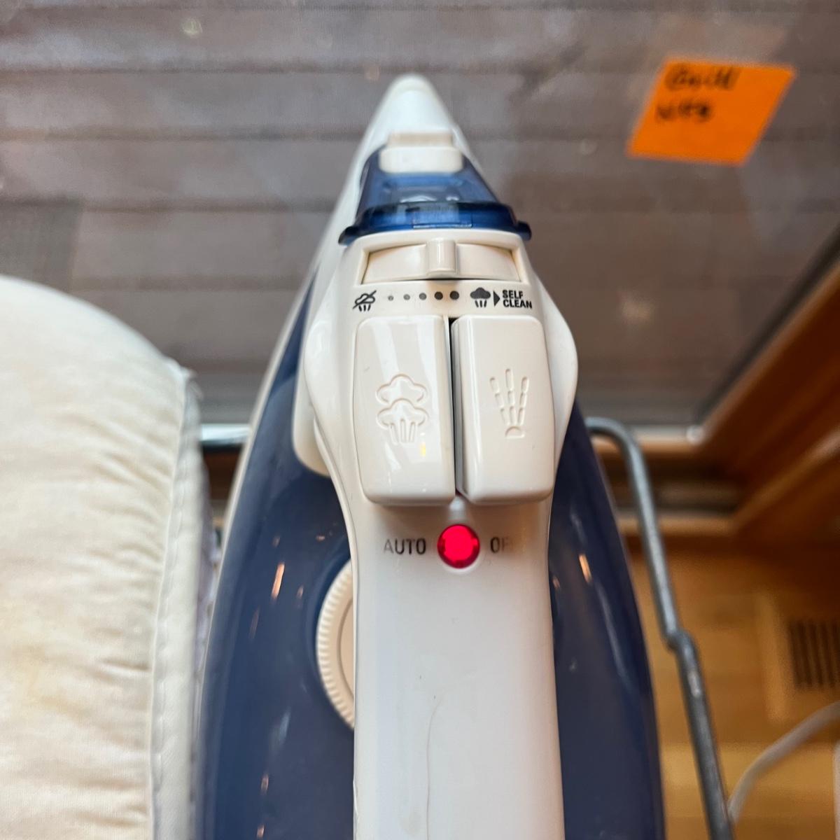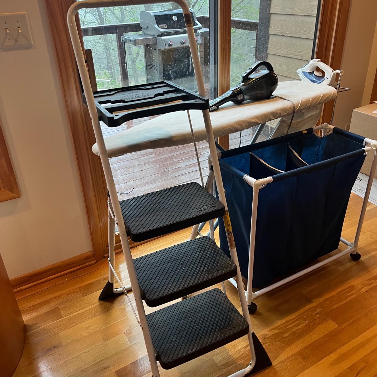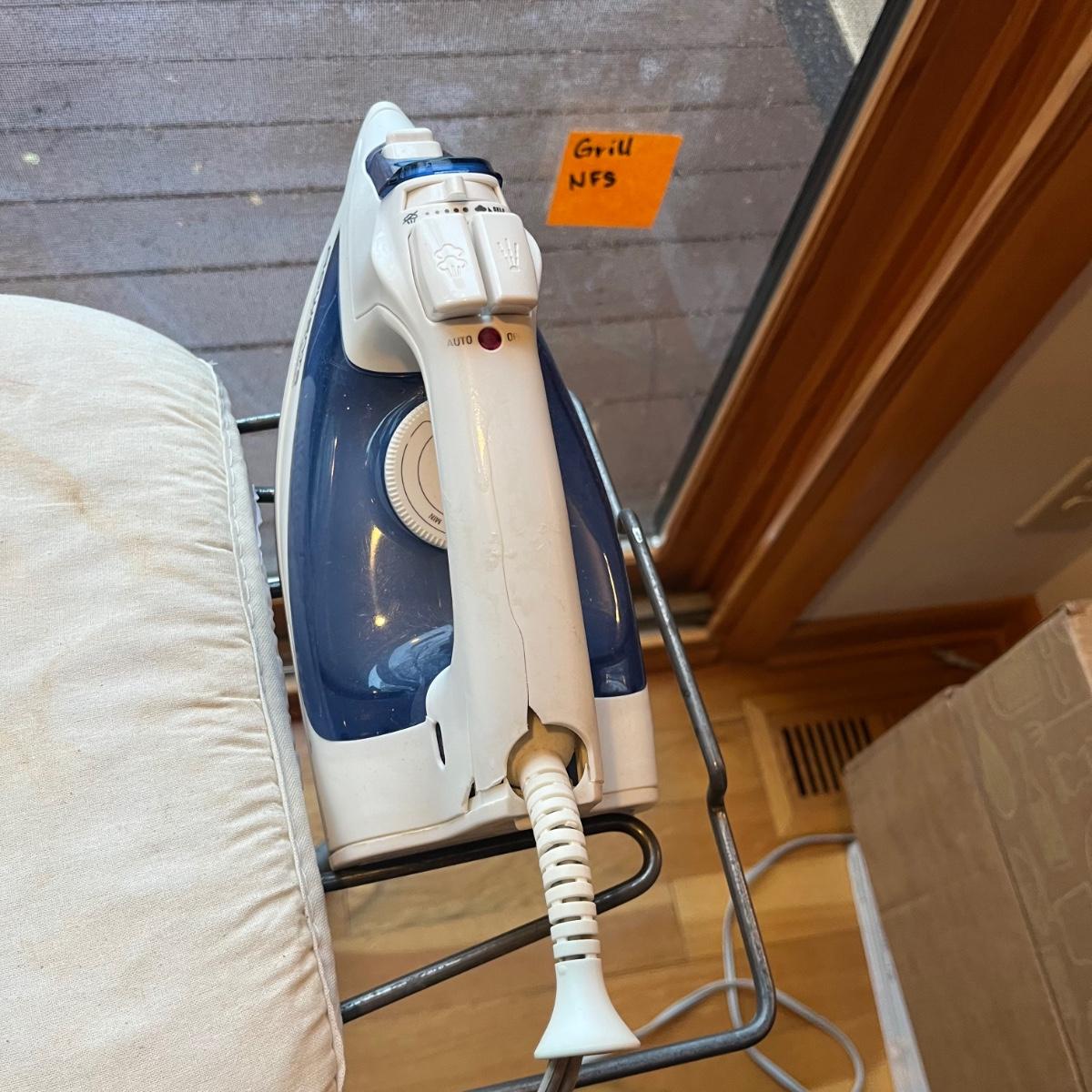 Lot includes Rowenta iron, ironing board, Cosco stepladder, Black & Decker lithium vacuum and a wheeled laundry basket. Both electrical items powered on when plugged in.