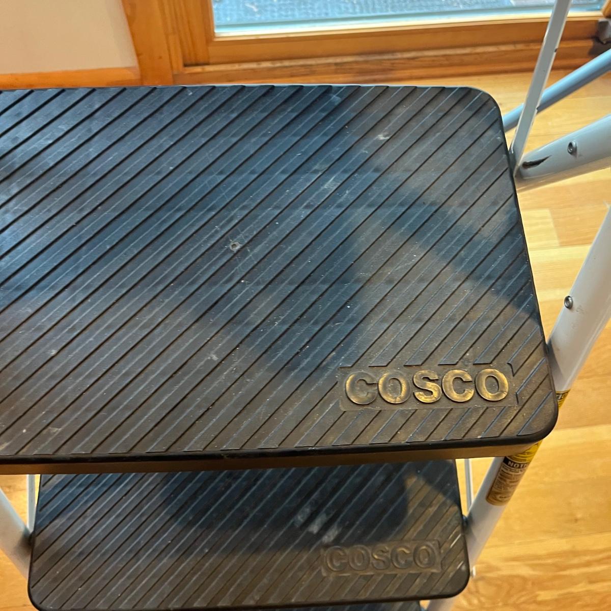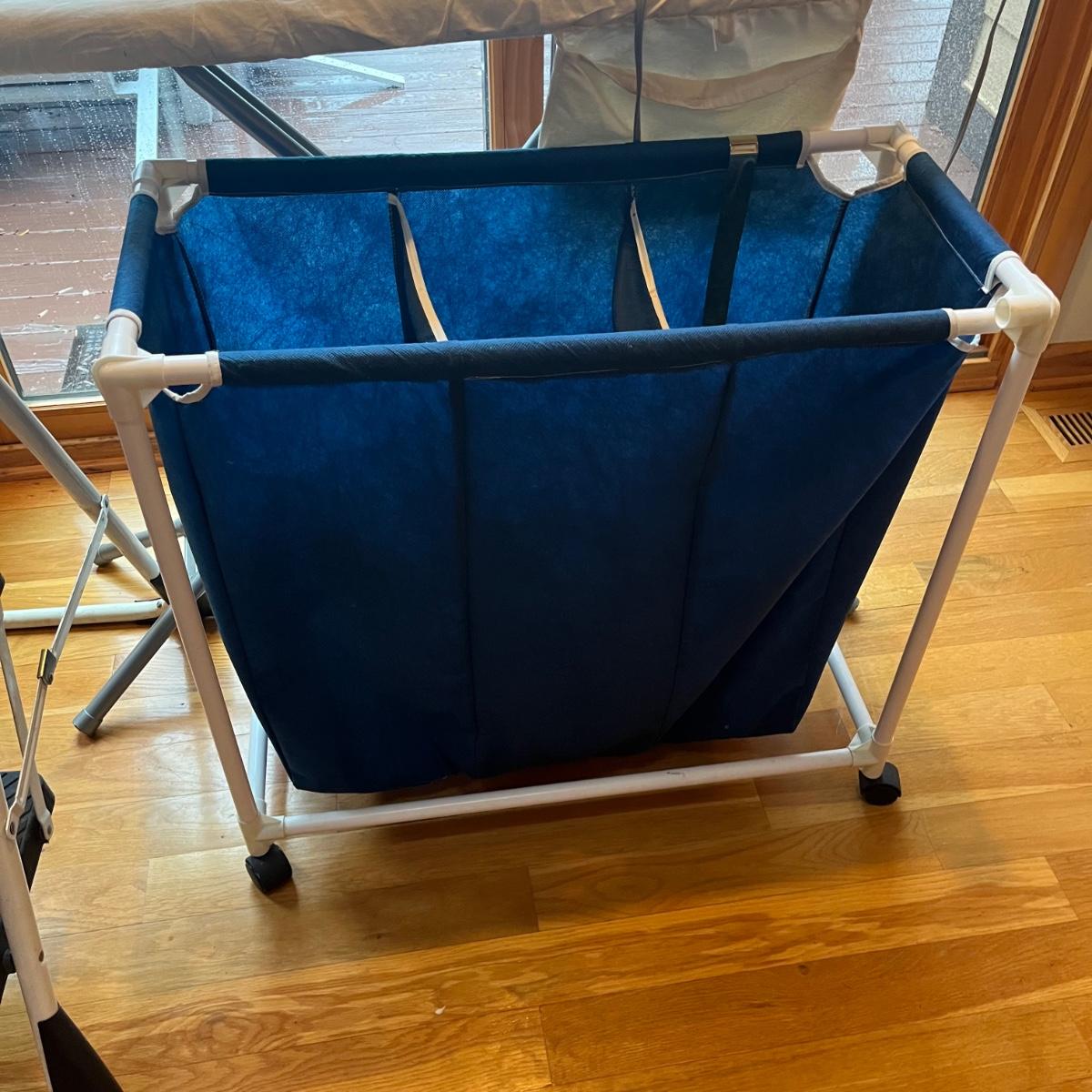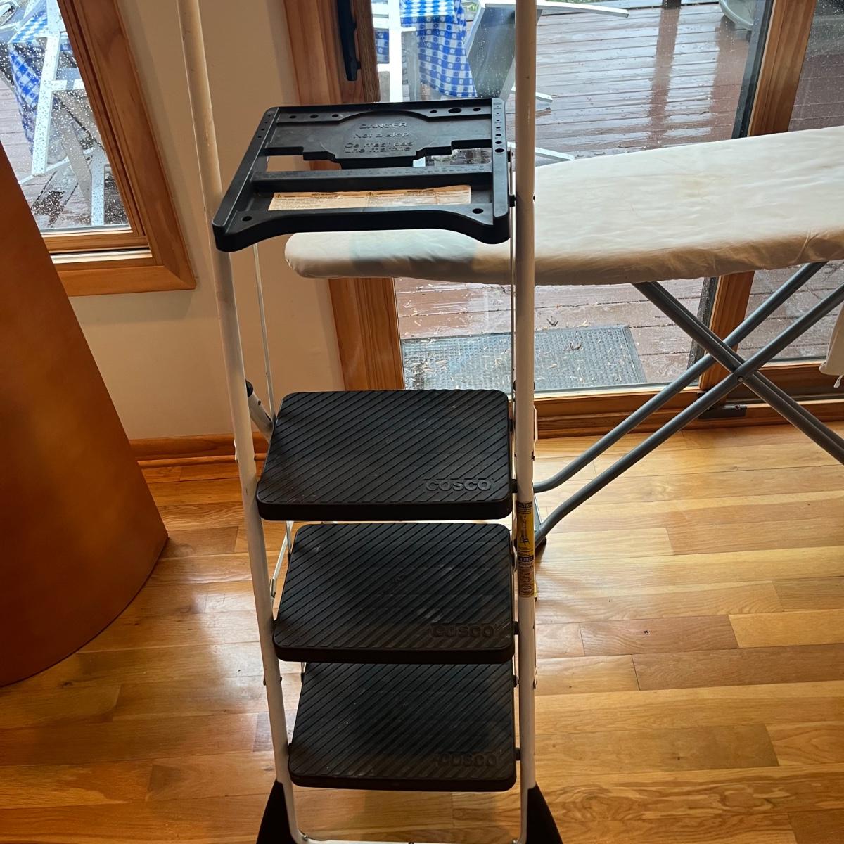 Lot includes Rowenta iron, ironing board, Cosco stepladder, Black & Decker lithium vacuum and a wheeled laundry basket. Both electrical items powered on when plugged in.