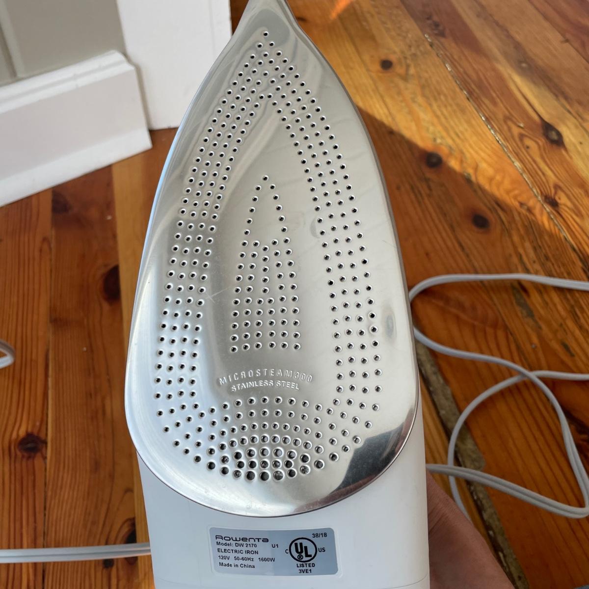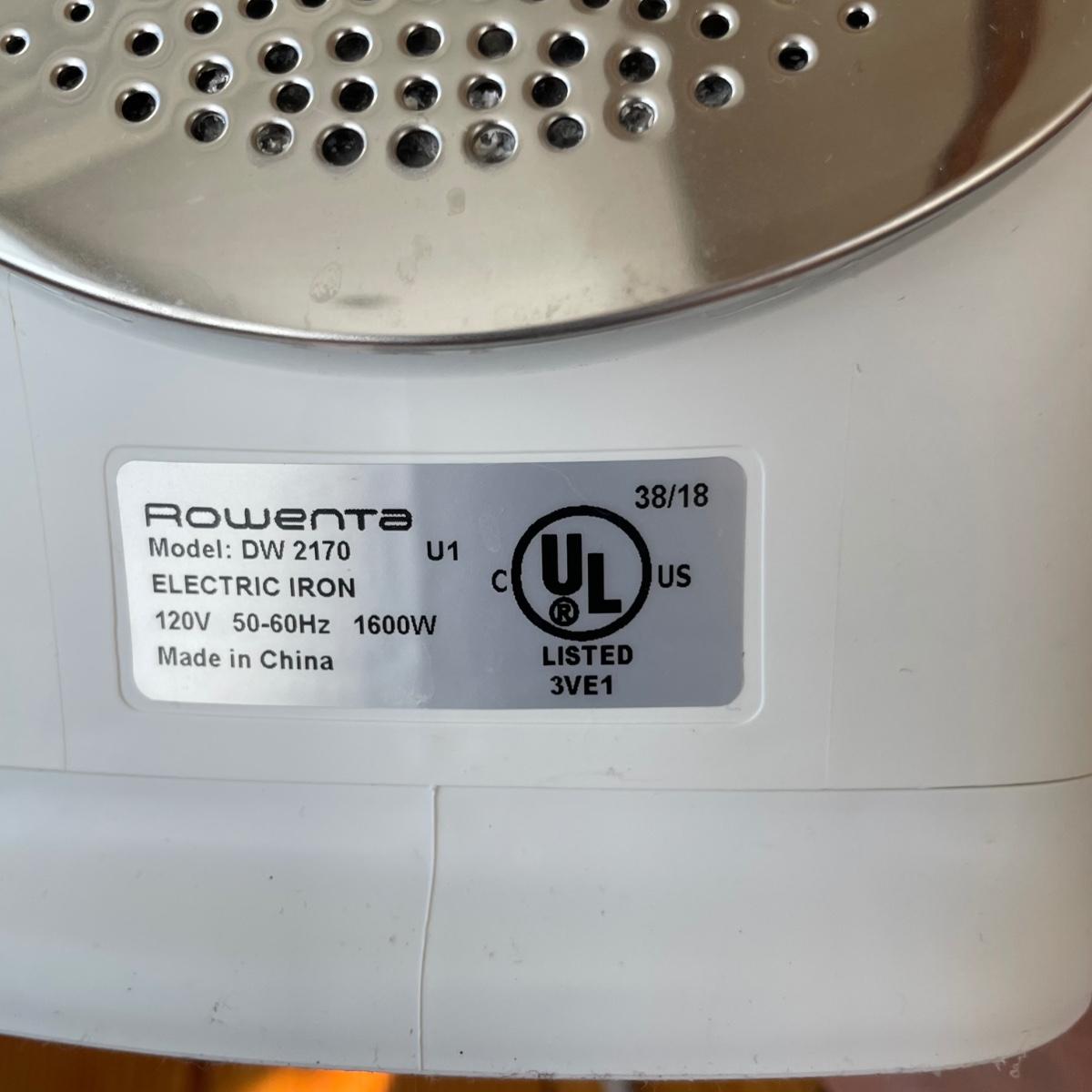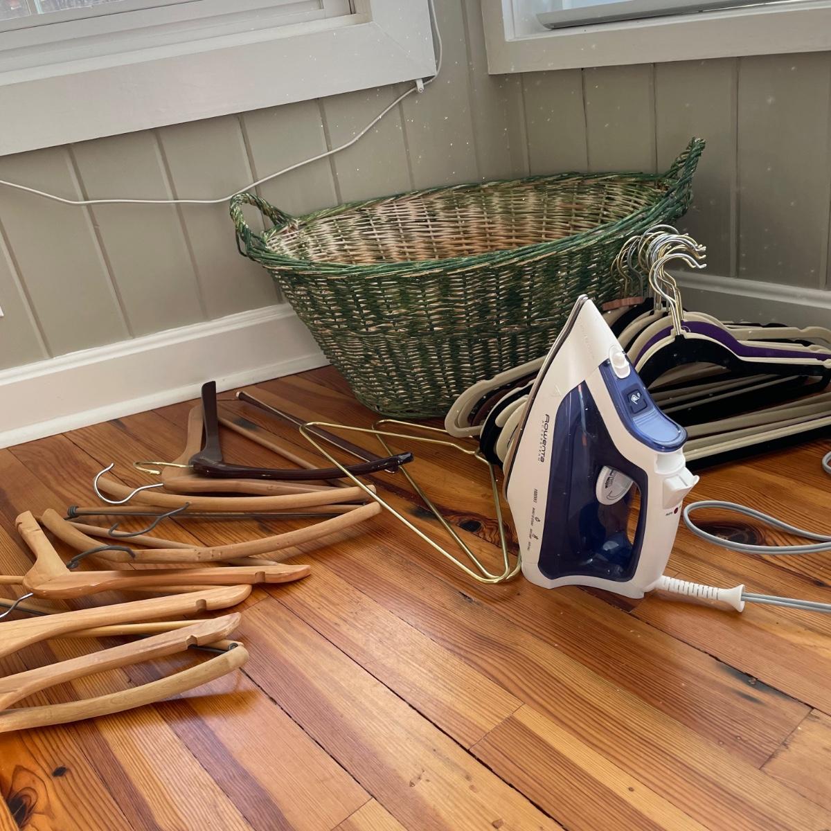 Rowenta iron heated up when tested, see image for model information. Also included are a range of 20 plus clothes hangers (some wood, felt lined and a couple of metal) and a wicker laundry basket that measures 19” x 25” x 9”.
