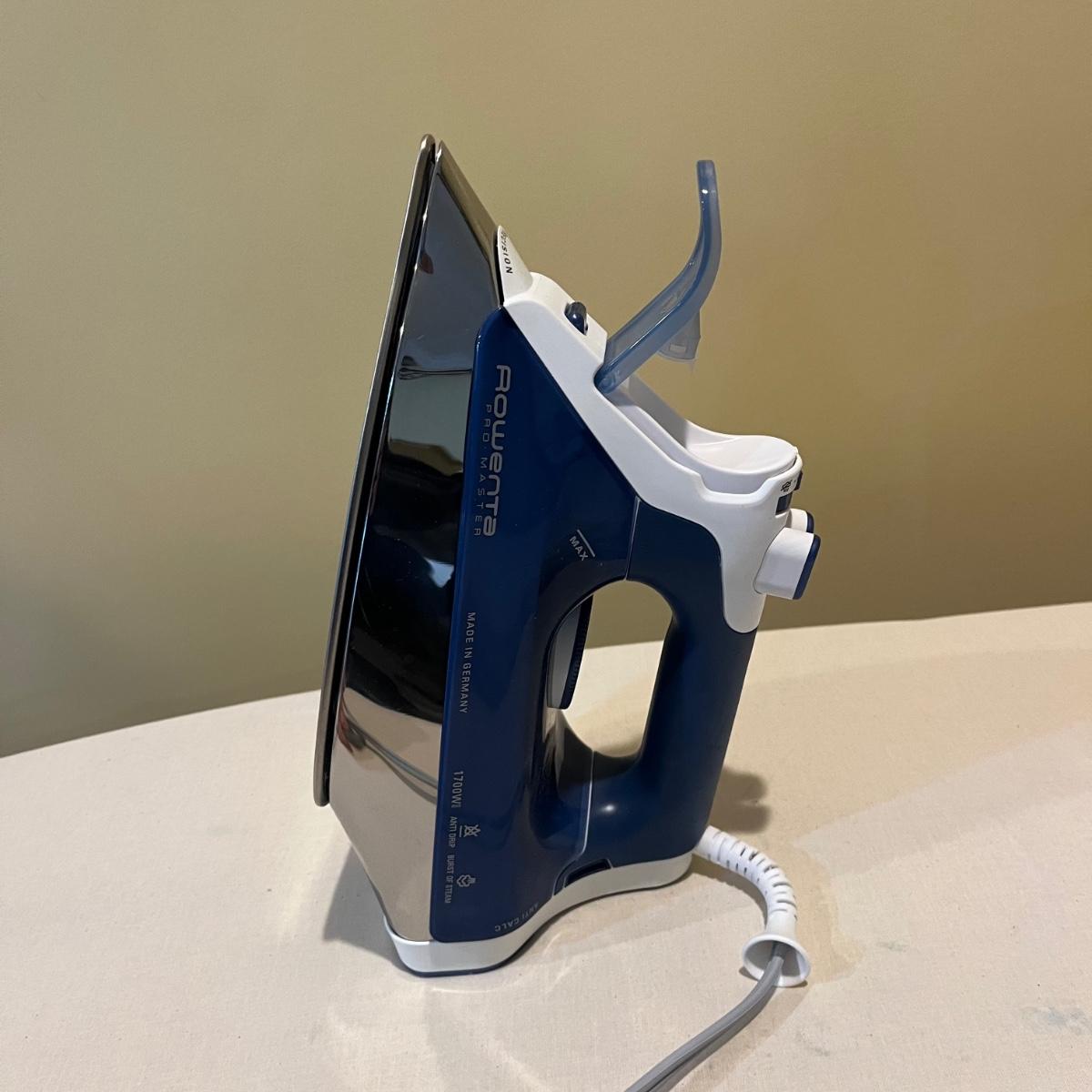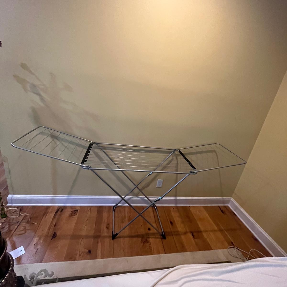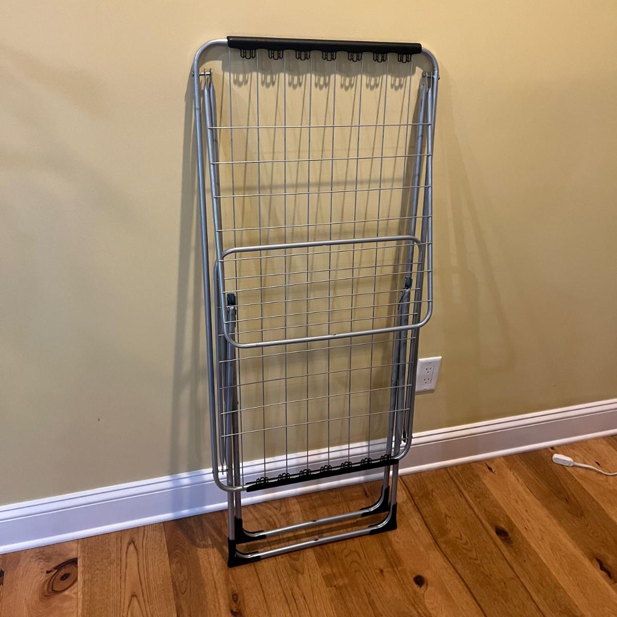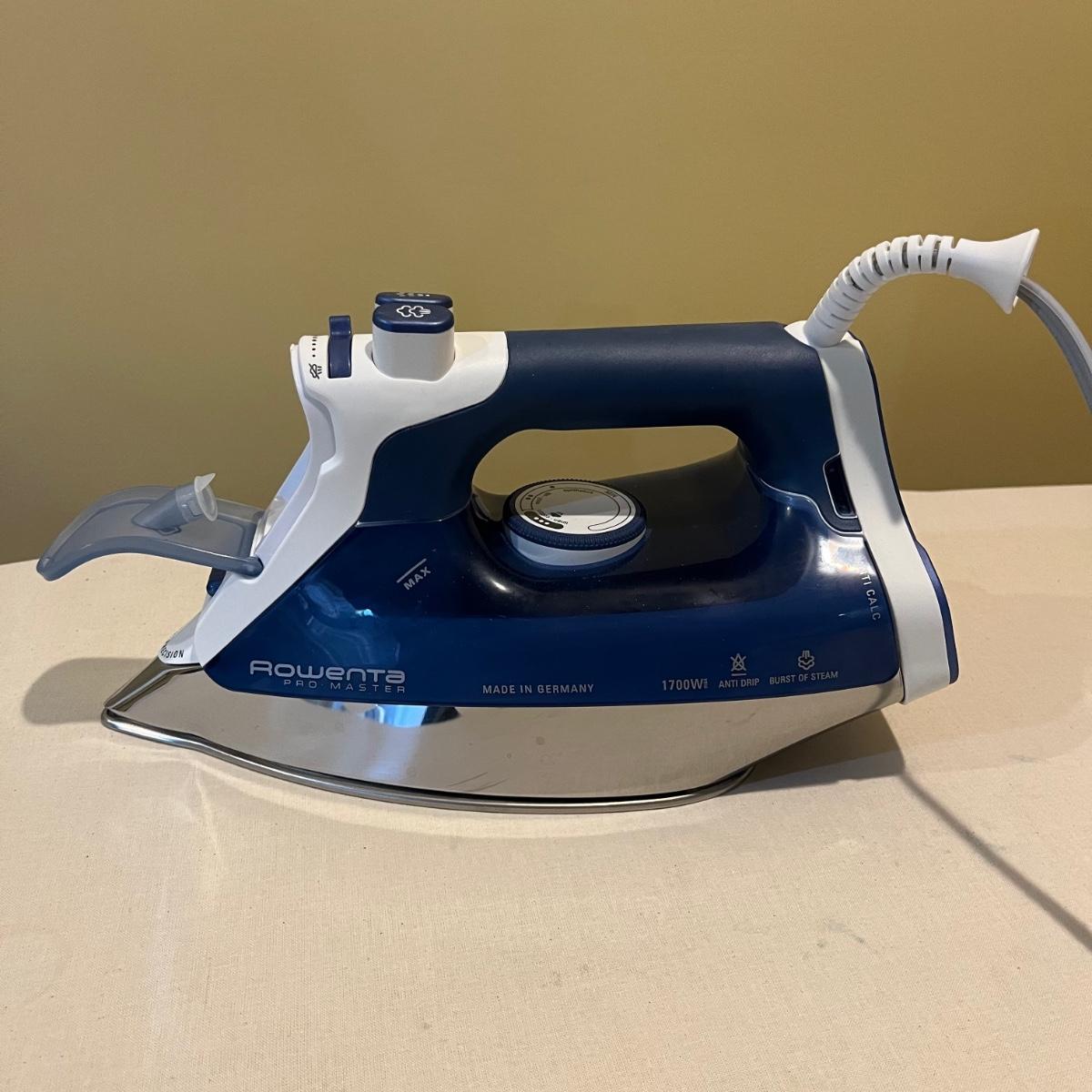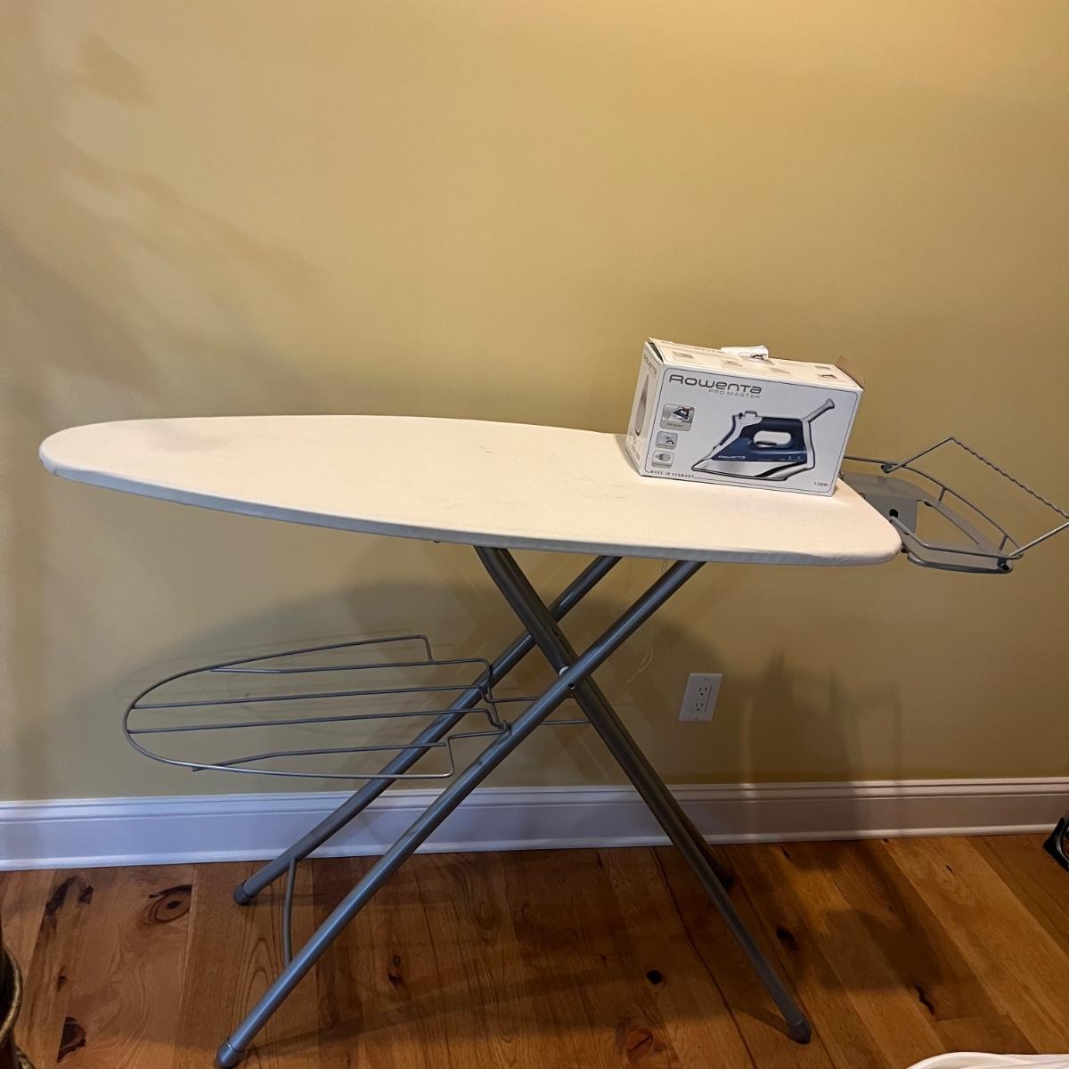 Lot includes a Rowenta Pro Mater iron model # DW 8090 that powered on when plugged in. Also includes an ironing board, cover and pad and a folding metal drying rack that measures 82” x 22” x 42”H.