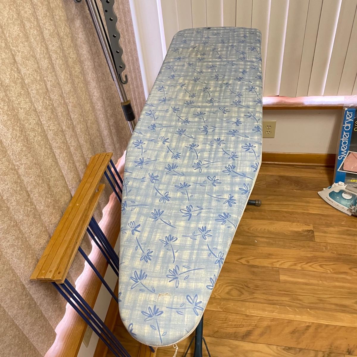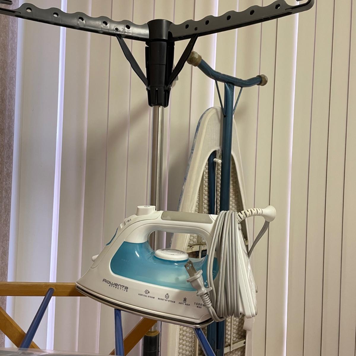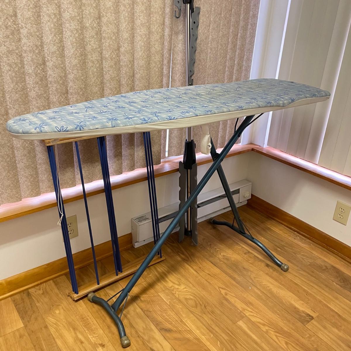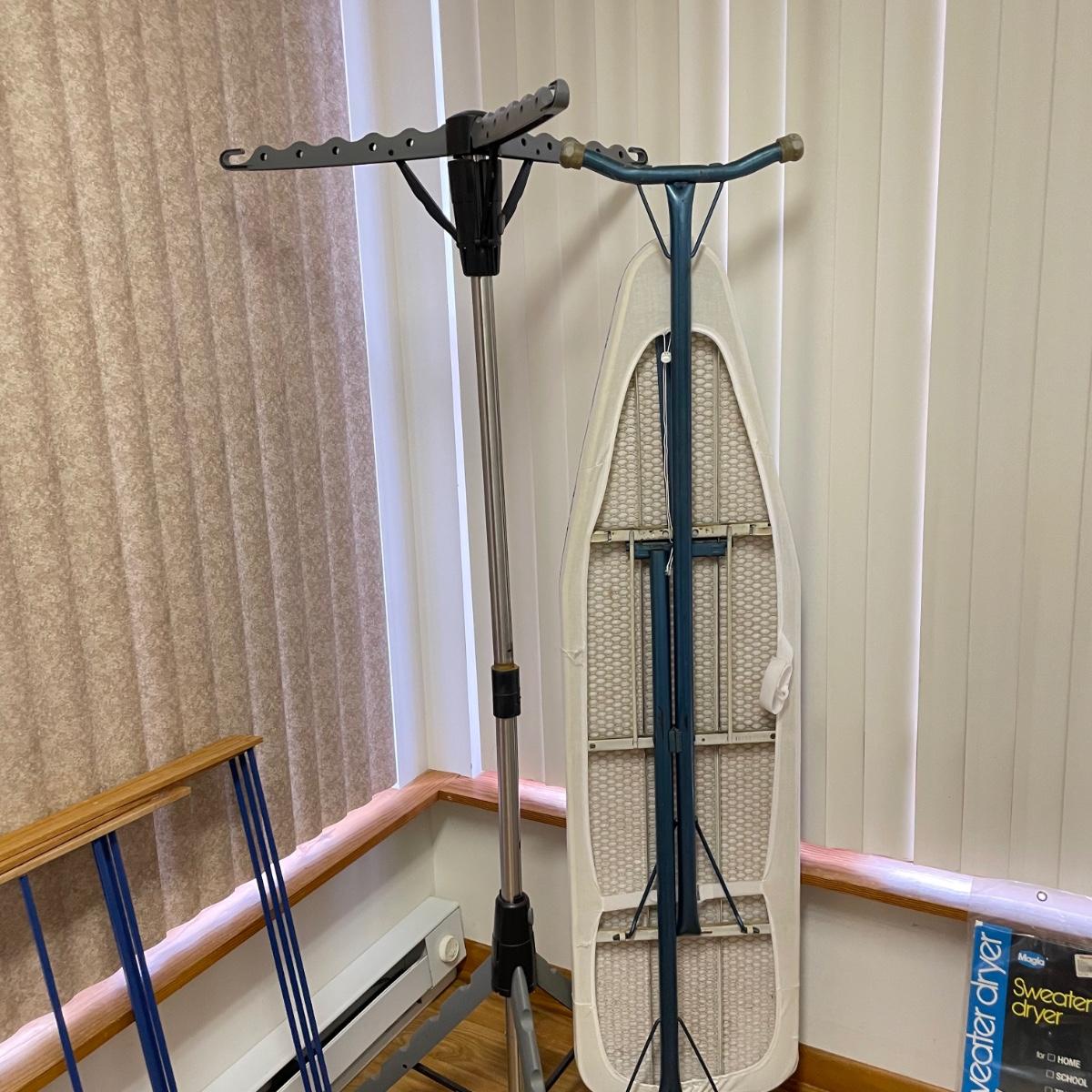 Lot features a Rowenta Effective 1600W iron that boasts “Anti-Calc” (powered on when plugged in), along with a sturdy, vintage metal ironing board with midnight blue legs. Lot also contains a wood drying rack, a Magna sweater drying rack and a tall laundry tree perfect for hang drying or storage. The top branches of the “tree” each hold at least five hangers with an extra hook at the end. Two of the branches have one side broken, but stay in place when opened. We did not test this item for weight limits. This item also folds up and pulls apart in two pieces for easy storage. The tree can be as tall as 65” or two 32” pieces. See images. Local pick up only.