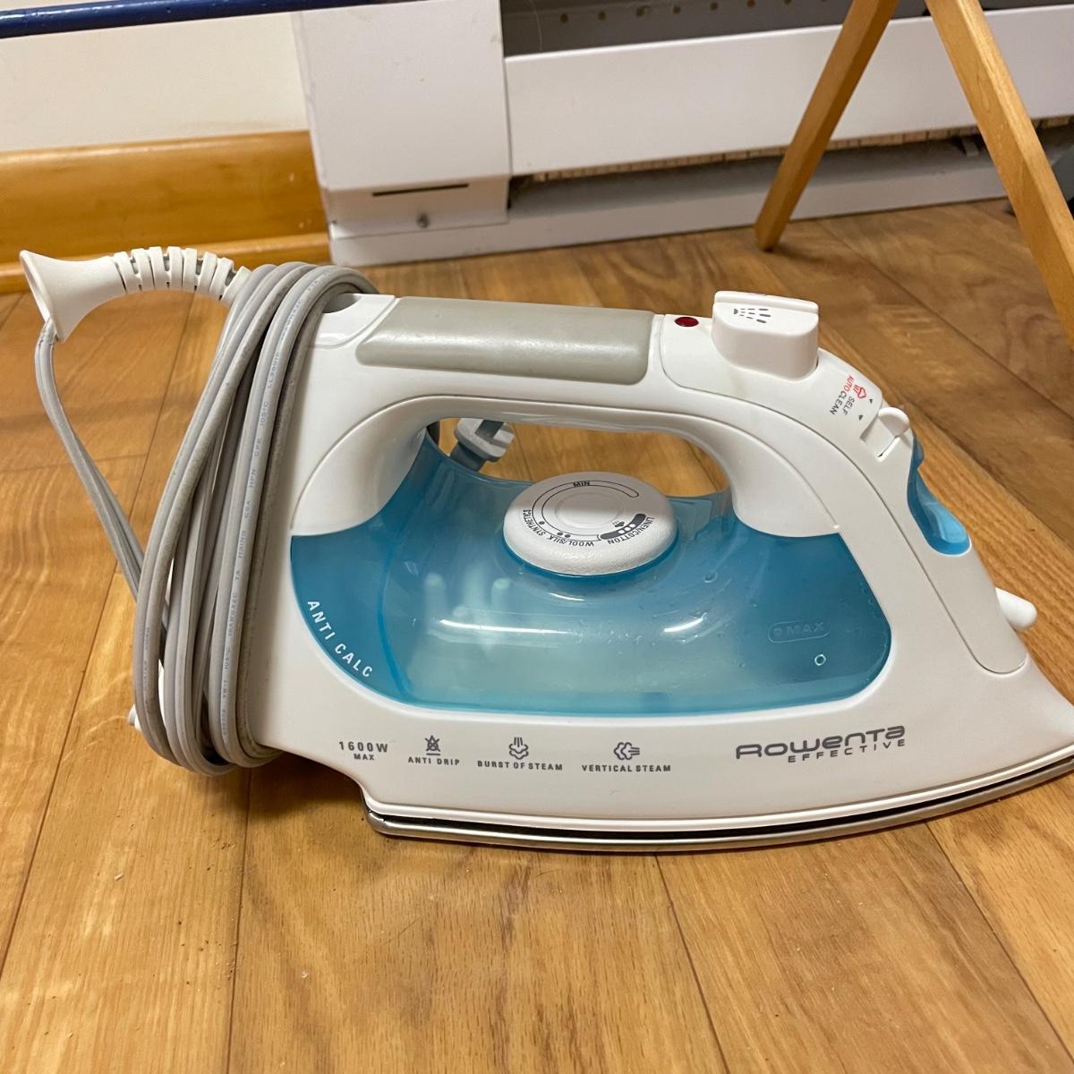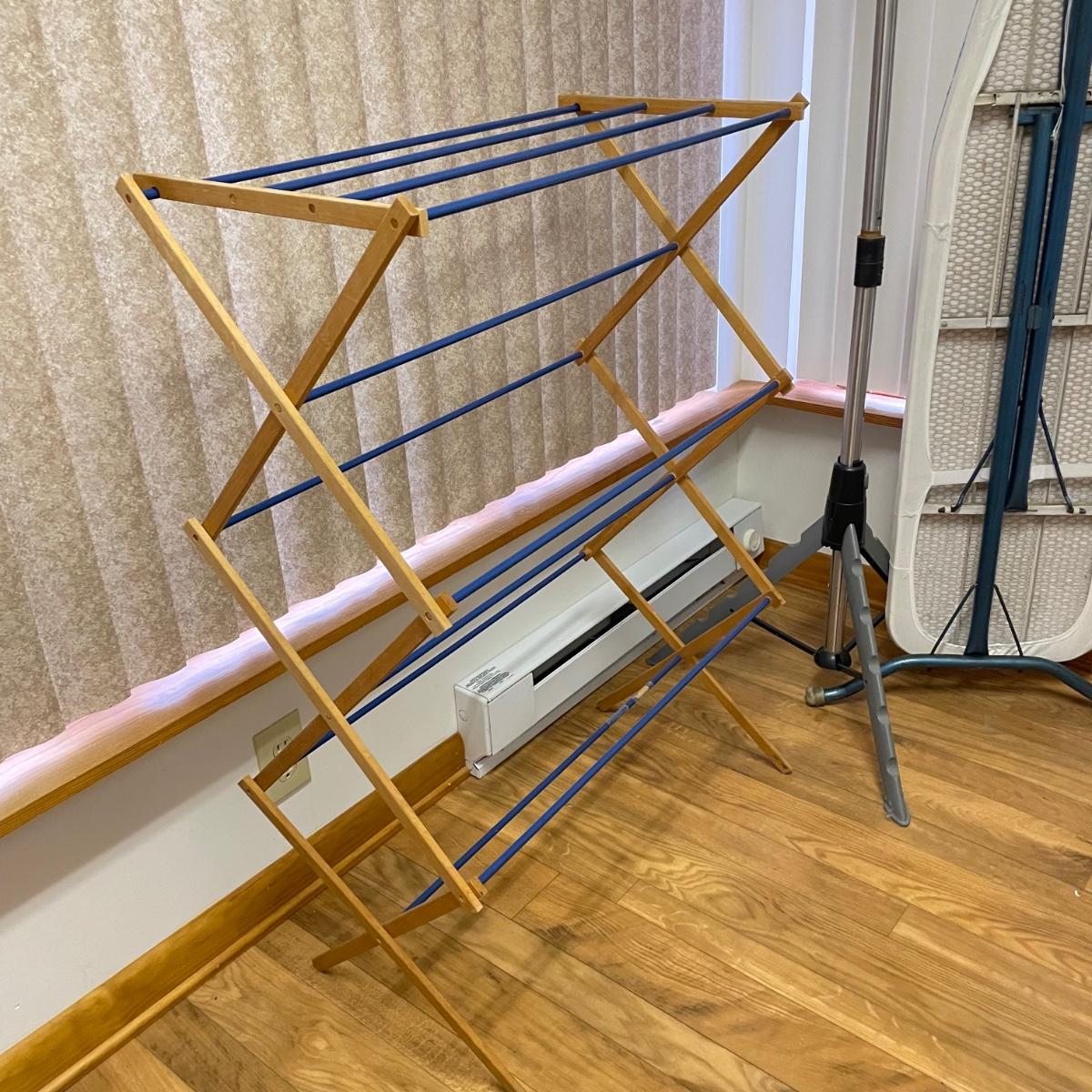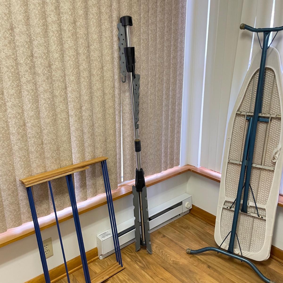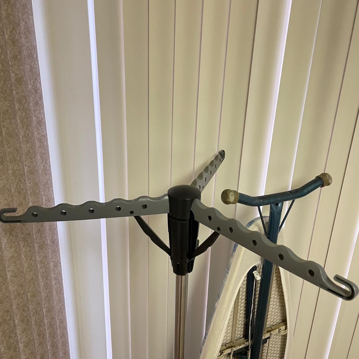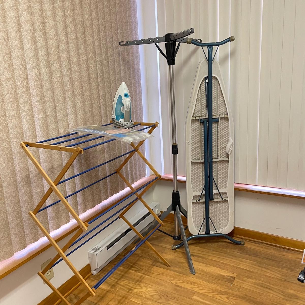 Lot features a Rowenta Effective 1600W iron that boasts “Anti-Calc” (powered on when plugged in), along with a sturdy, vintage metal ironing board with midnight blue legs. Lot also contains a wood drying rack, a Magna sweater drying rack and a tall laundry tree perfect for hang drying or storage. The top branches of the “tree” each hold at least five hangers with an extra hook at the end. Two of the branches have one side broken, but stay in place when opened. We did not test this item for weight limits. This item also folds up and pulls apart in two pieces for easy storage. The tree can be as tall as 65” or two 32” pieces. See images. Local pick up only.