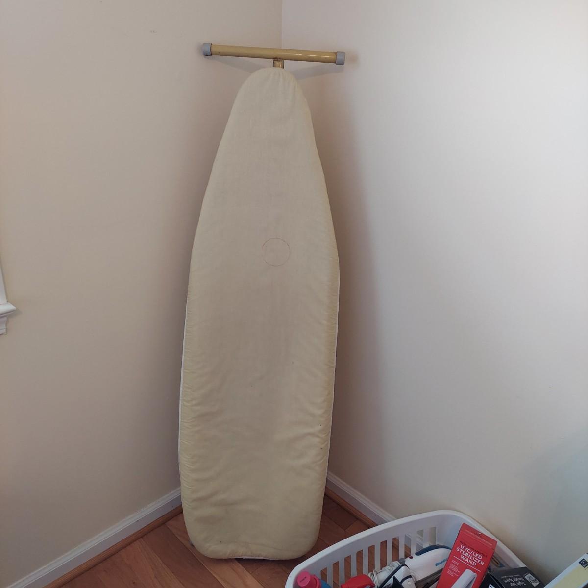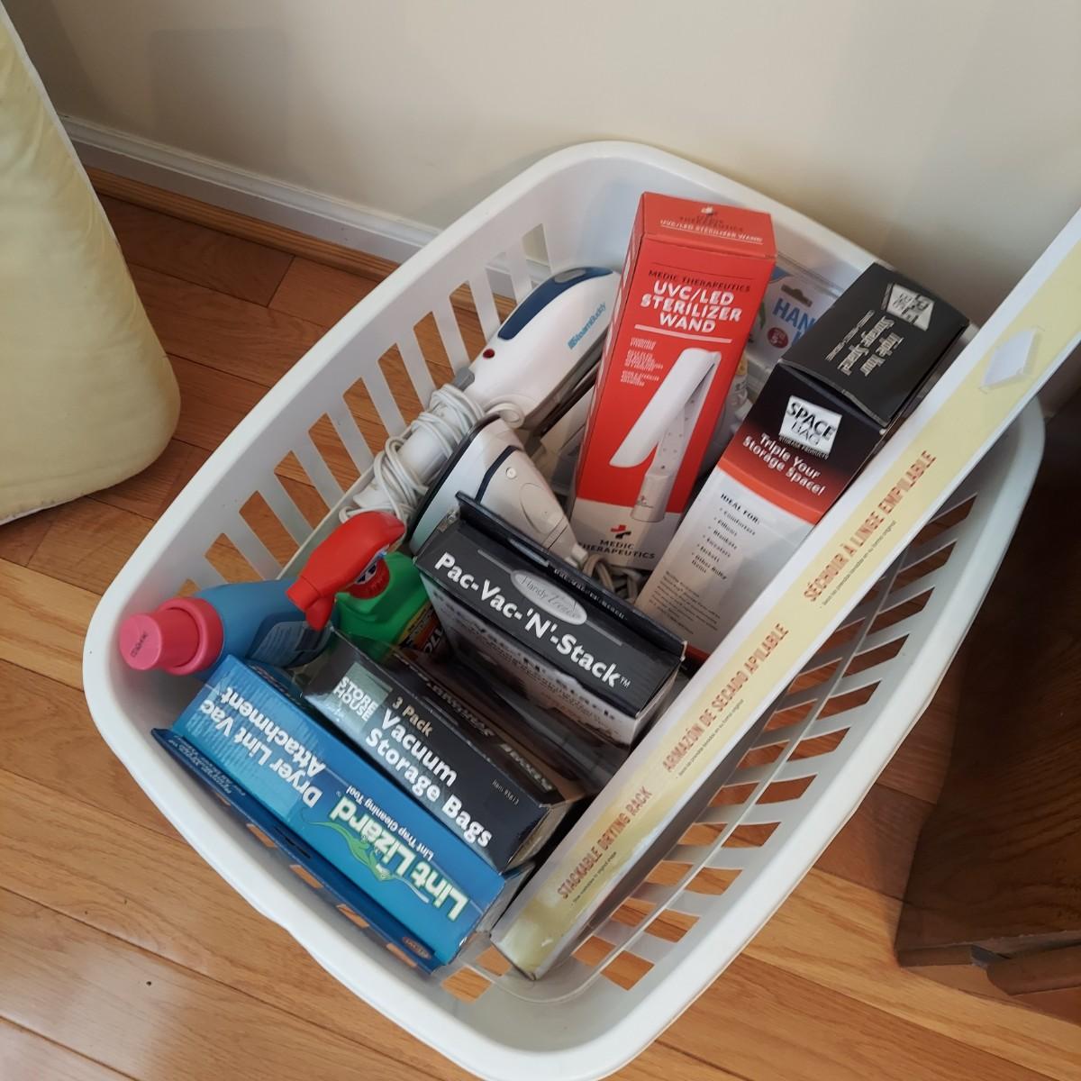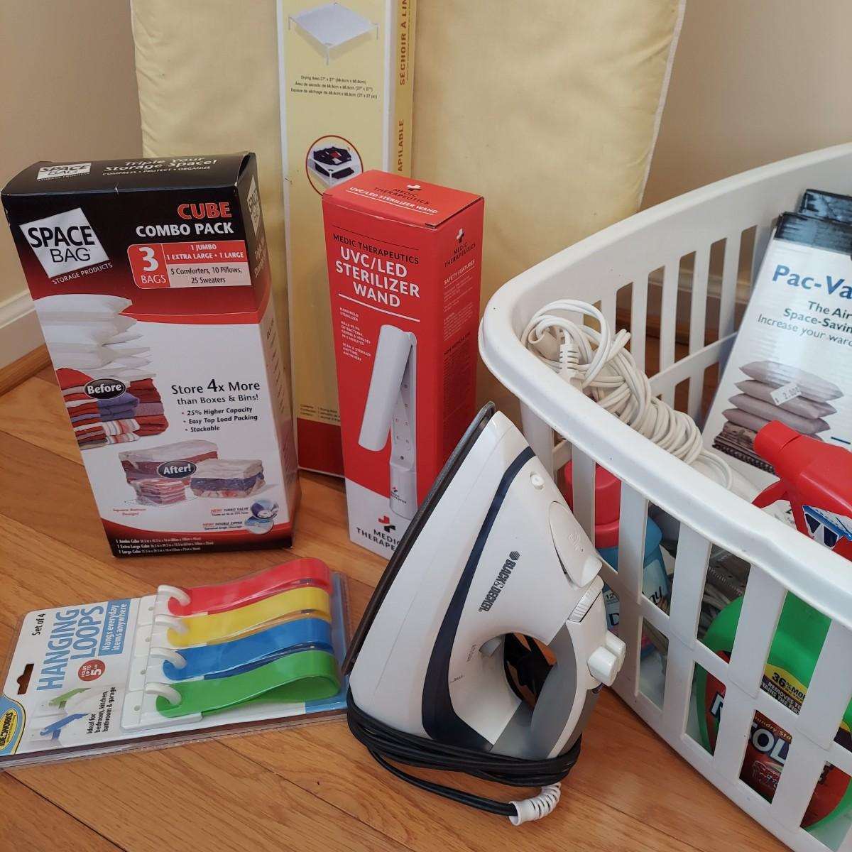 Laundry and household lot including a handheld steamer, a UVC/LED sterilizing wand, two irons and a metal ironing board. Lot also includes three boxes of space bags, a sweater drying rack, wall hooks, a dryer cleaning device plus a bottle of stain treatment and a bottle of fabric softener. The cover on the ironing board is loose and has some spots. The liquids appear to be unopened but the contents cannot be verified. Please see photos for details. All electrical items powered on when plugged in. Local Pickup Only