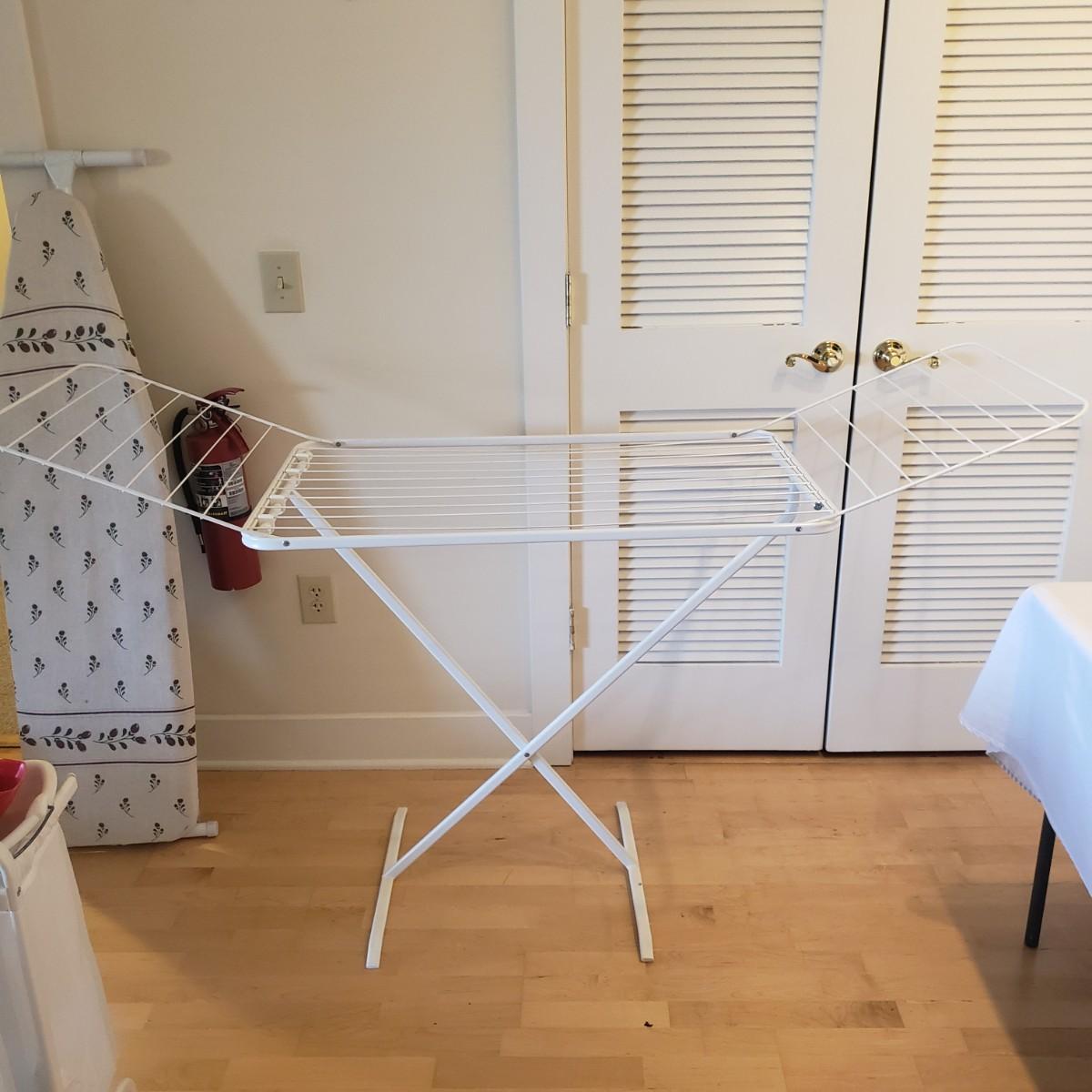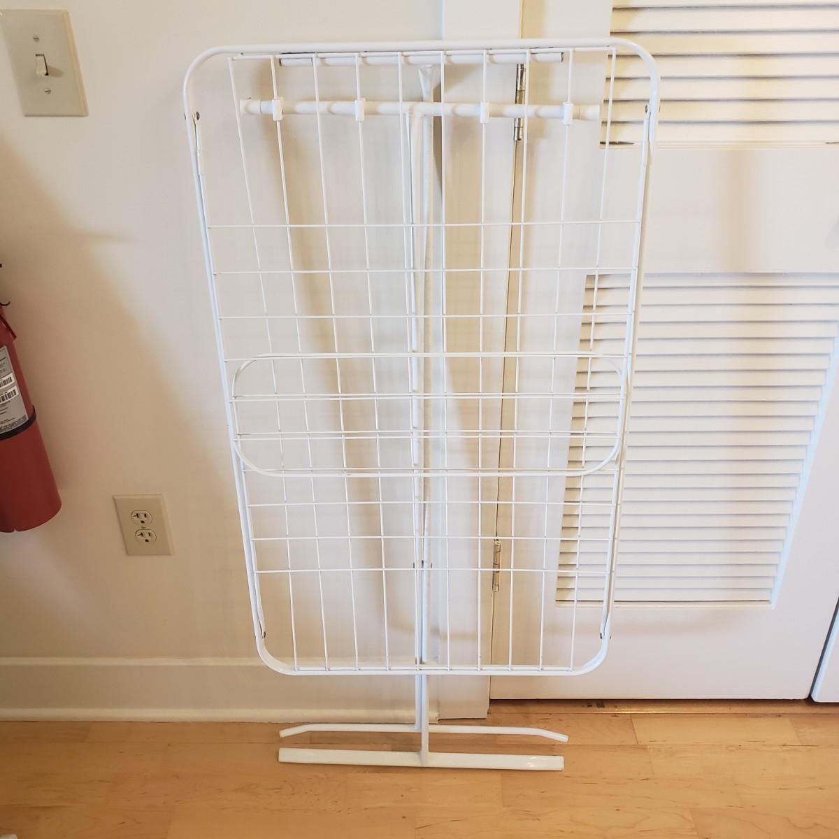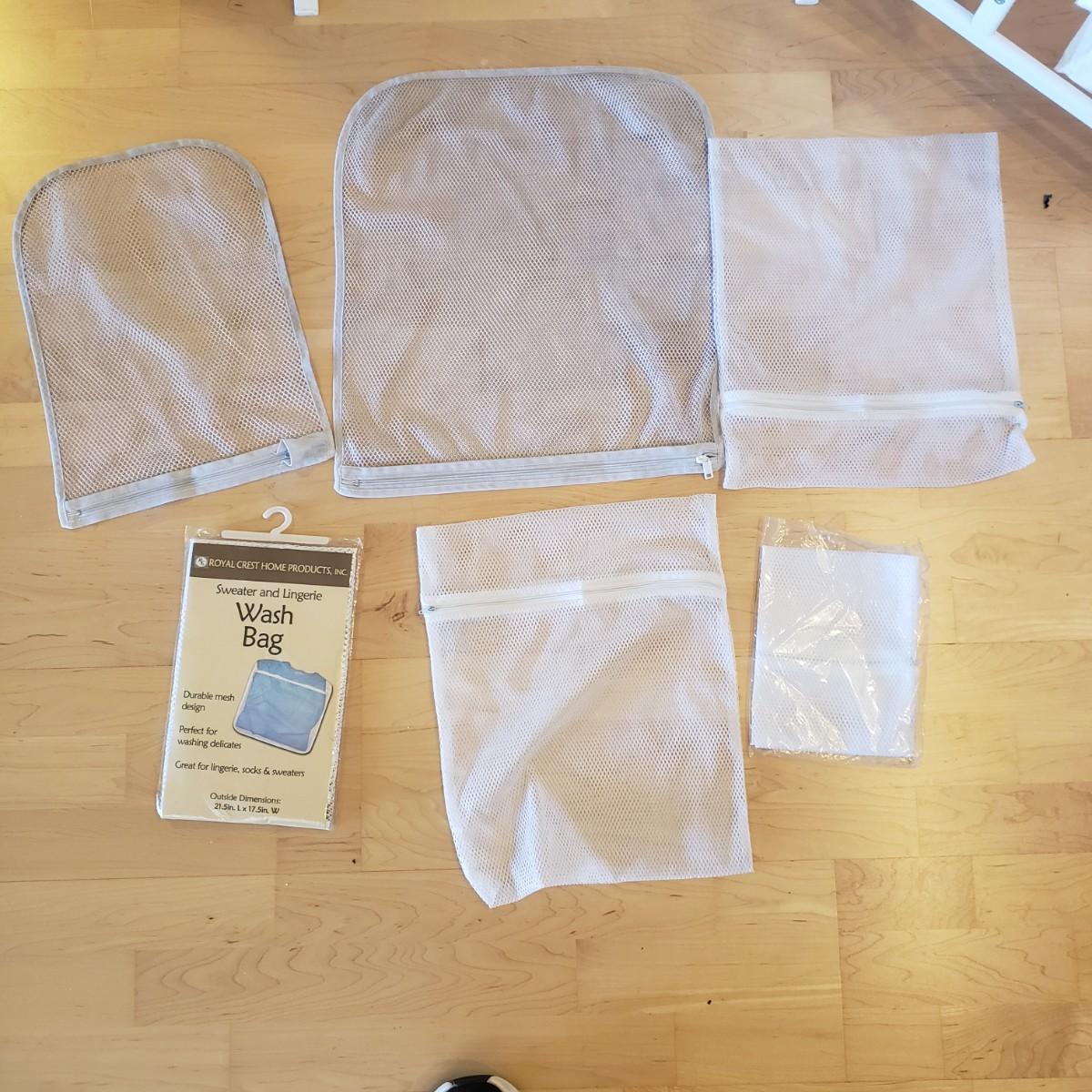 This laundry lot contains some handy things to make your life easier! The portable Rosenthal steamer powers on when plugged in. It comes with two other attachments. The cord and hose all wrap and lock in for easy moving. There are multiple mesh bags for protecting your delicates. The IKEA laundry hamper has removable bags on each side. The hamper measures 18" x 14" x 27"H. The three buckets appear to be blemish free. The wire drying rack folds up. Two sides fold put for more surface area. The rack folded in measures 38" x 22" x 35"H. Each side measures 17" x 22".