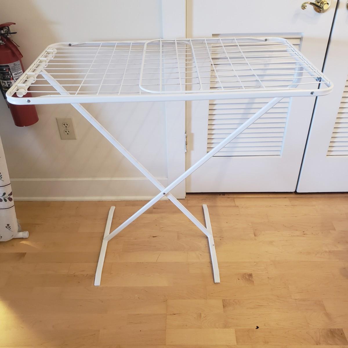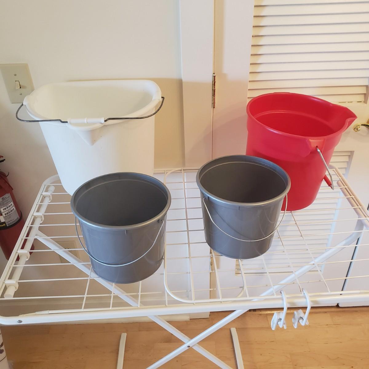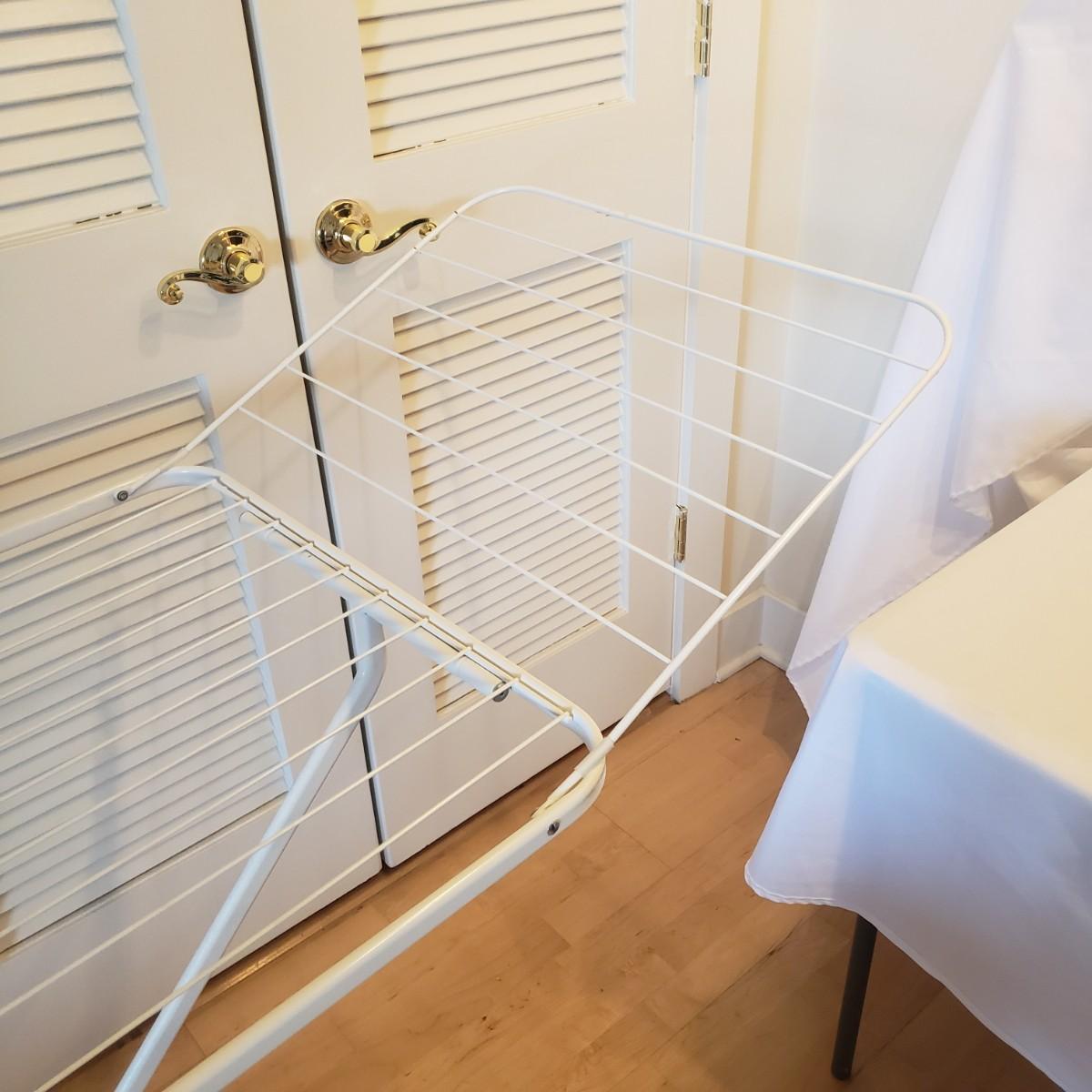 This laundry lot contains some handy things to make your life easier! The portable Rosenthal steamer powers on when plugged in. It comes with two other attachments. The cord and hose all wrap and lock in for easy moving. There are multiple mesh bags for protecting your delicates. The IKEA laundry hamper has removable bags on each side. The hamper measures 18" x 14" x 27"H. The three buckets appear to be blemish free. The wire drying rack folds up. Two sides fold put for more surface area. The rack folded in measures 38" x 22" x 35"H. Each side measures 17" x 22".