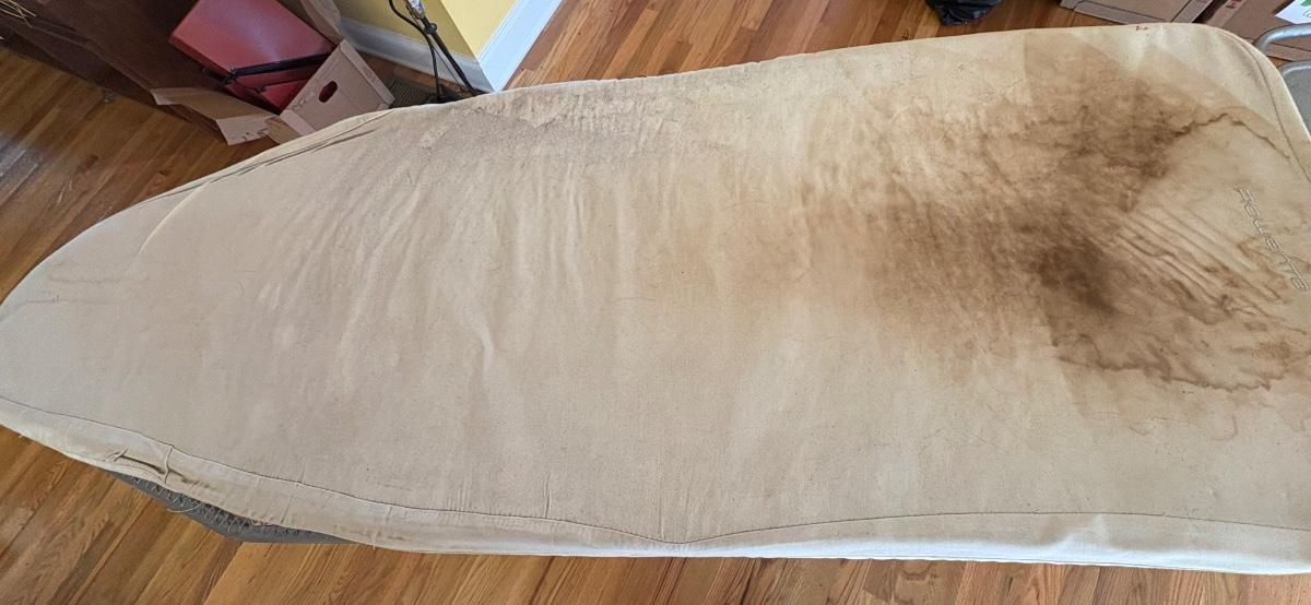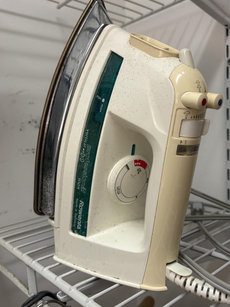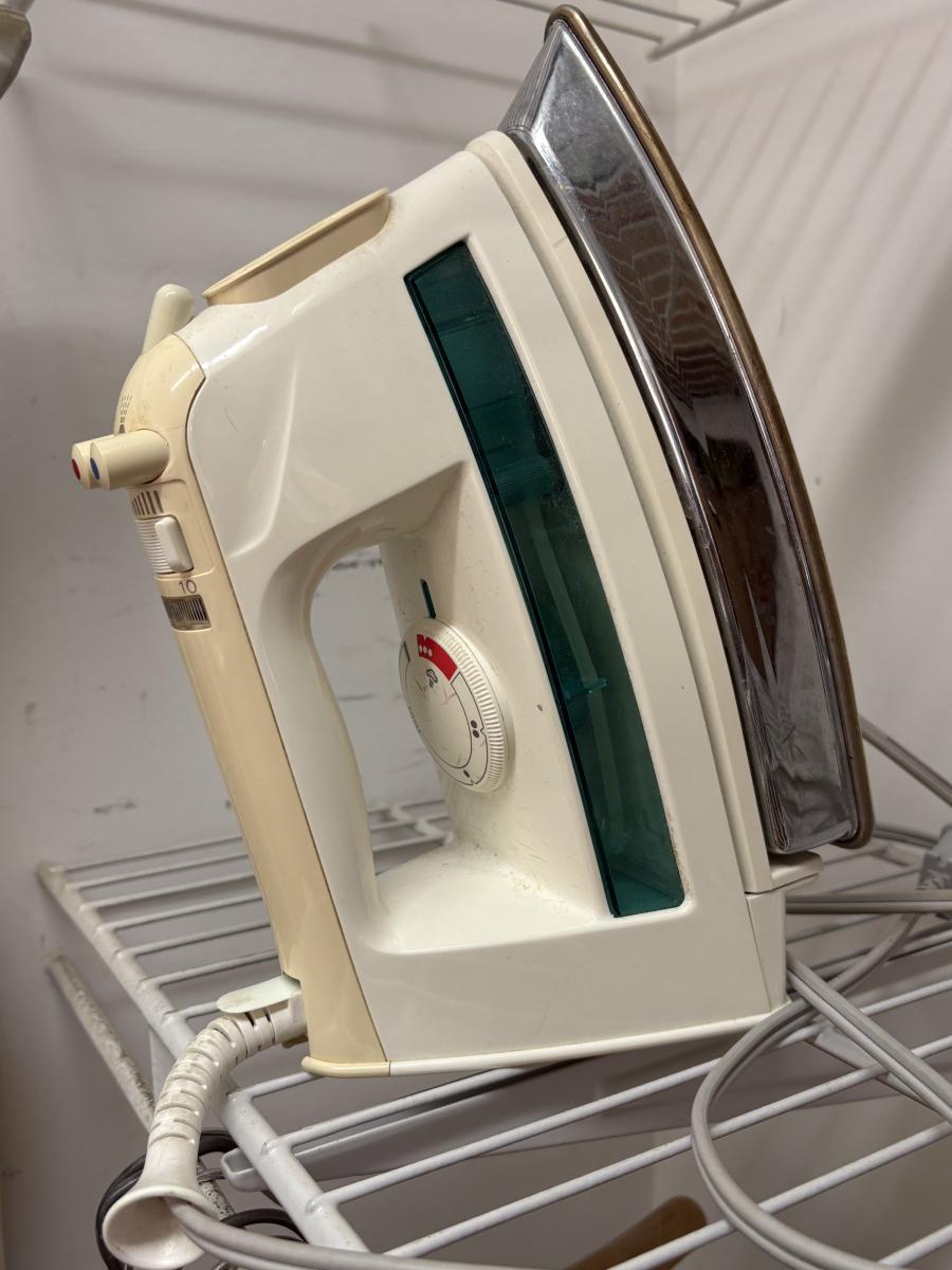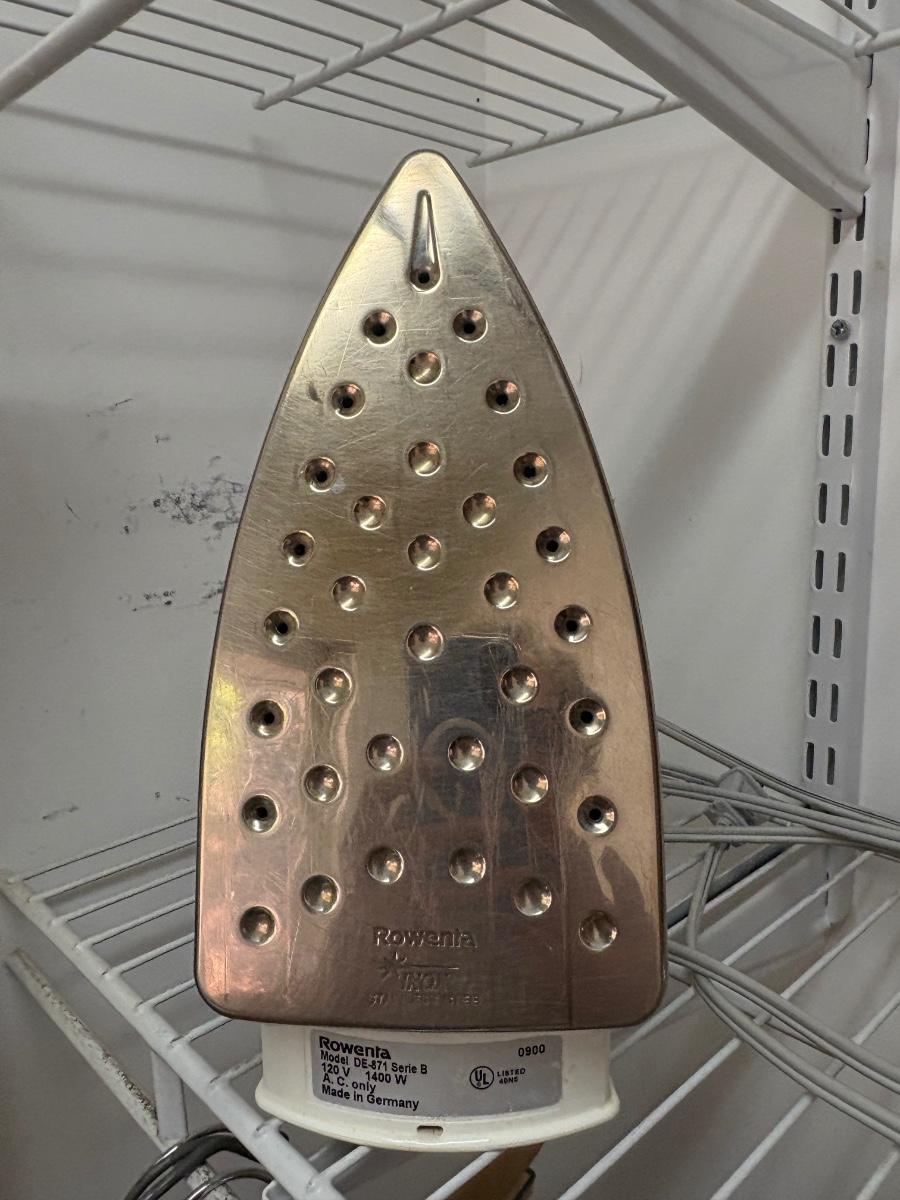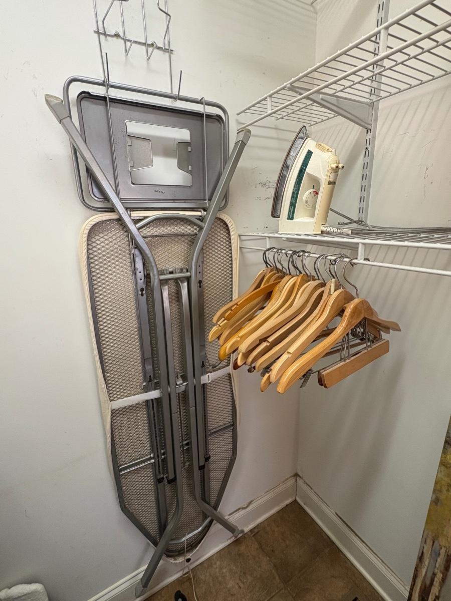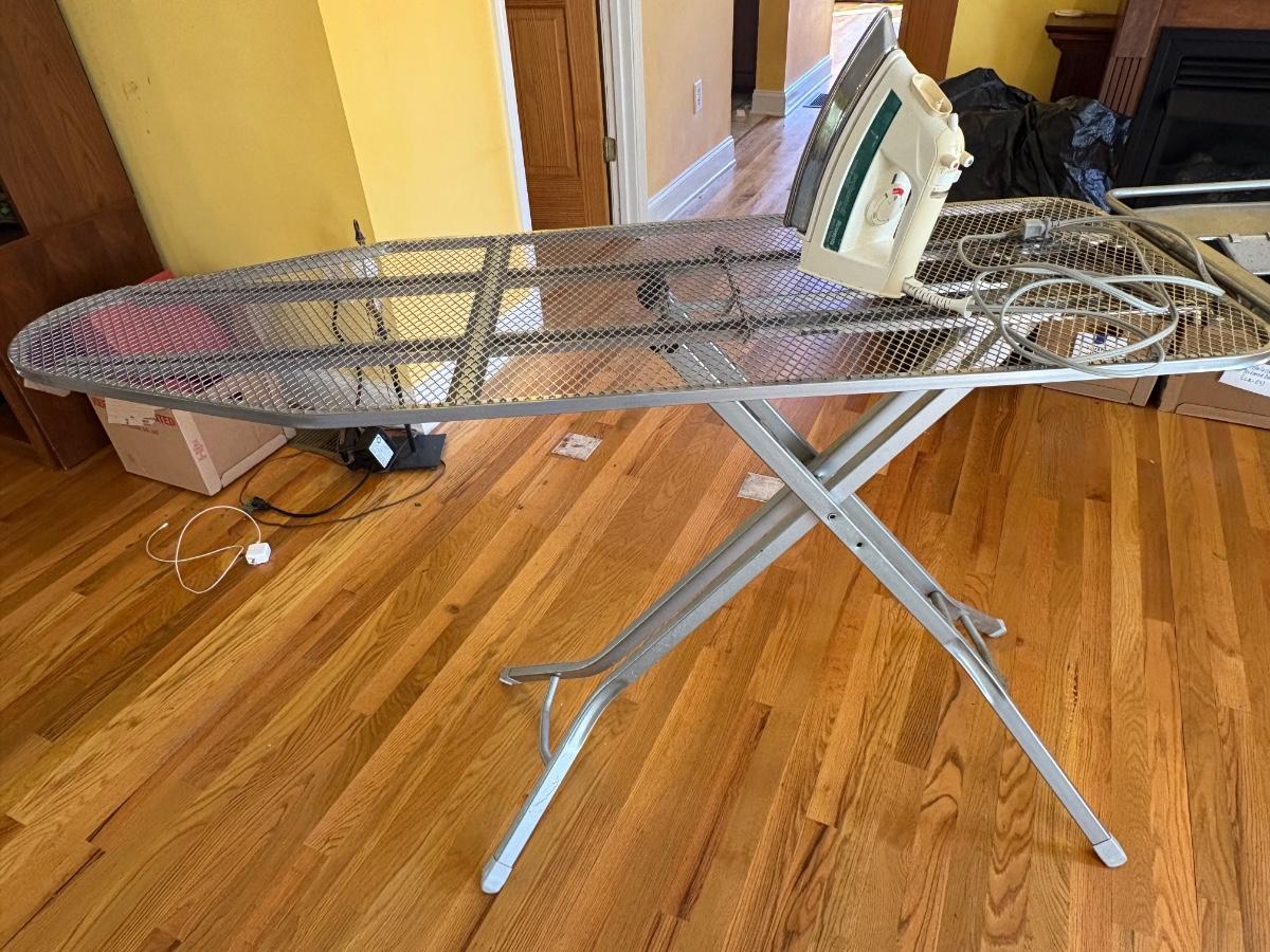 High quality ironing board needs a new cover. 62.5” end to end, 50.5” ironing space. Some calcification on the iron, powered on when plugged in. Mix of shirt, trouser, and suit hangers. Local pickup only.