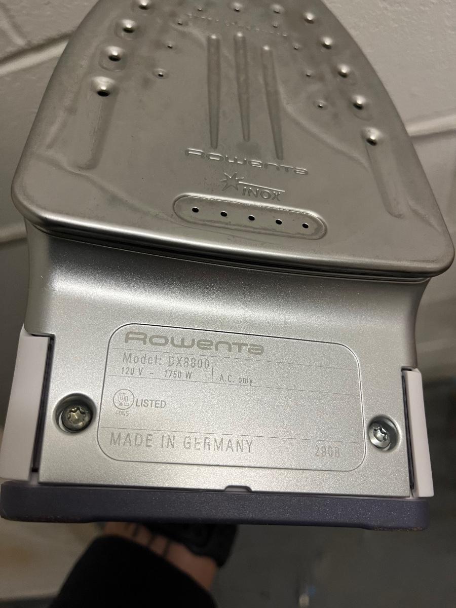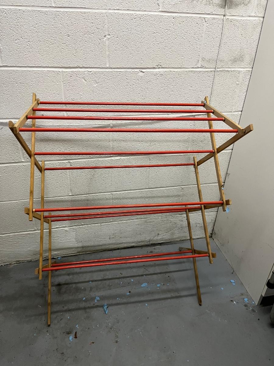 Lot includes a Rowenta iron model # DX-8800 (powered on when plugged in), ironing board with new cover and a wooden folding drying rack that measures 30” x 36” x 37”.