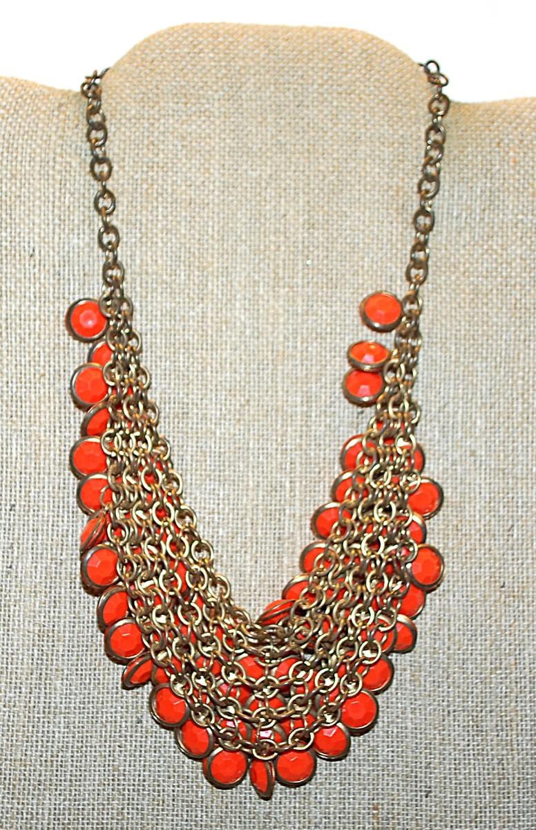 Rows & Rows of DOUBLE-SIDED ORANGE DISKS NECKLACE with Gold Tone Perimeters, Chain and Lobster Clasp 15" L