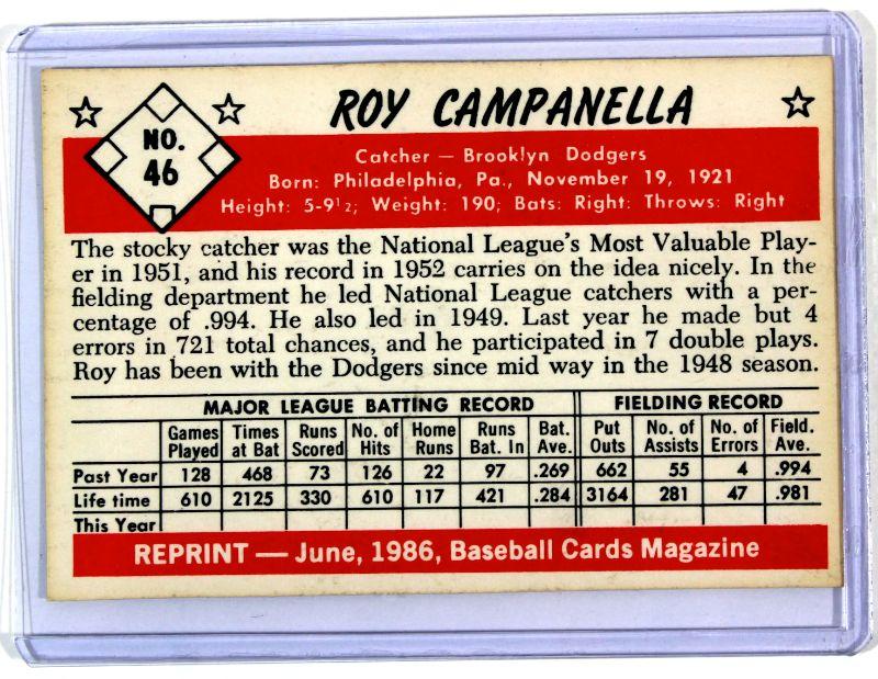 Roy Campanella Bowman #46 1953 - REPRINT Baseball Card 1986 Baseball Cards Magazine