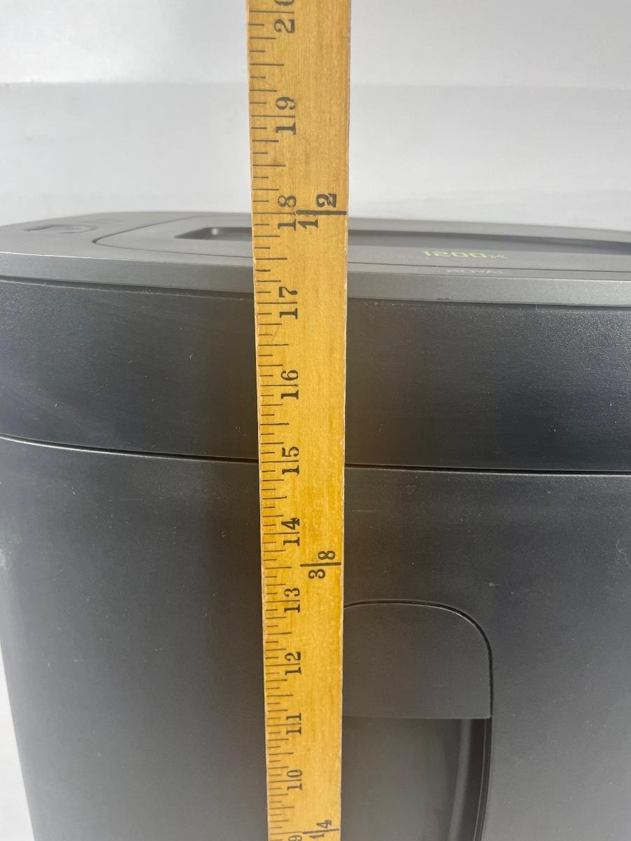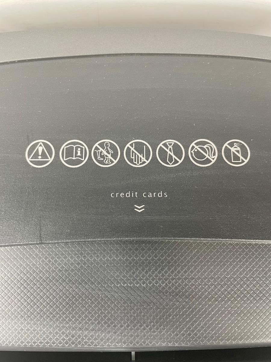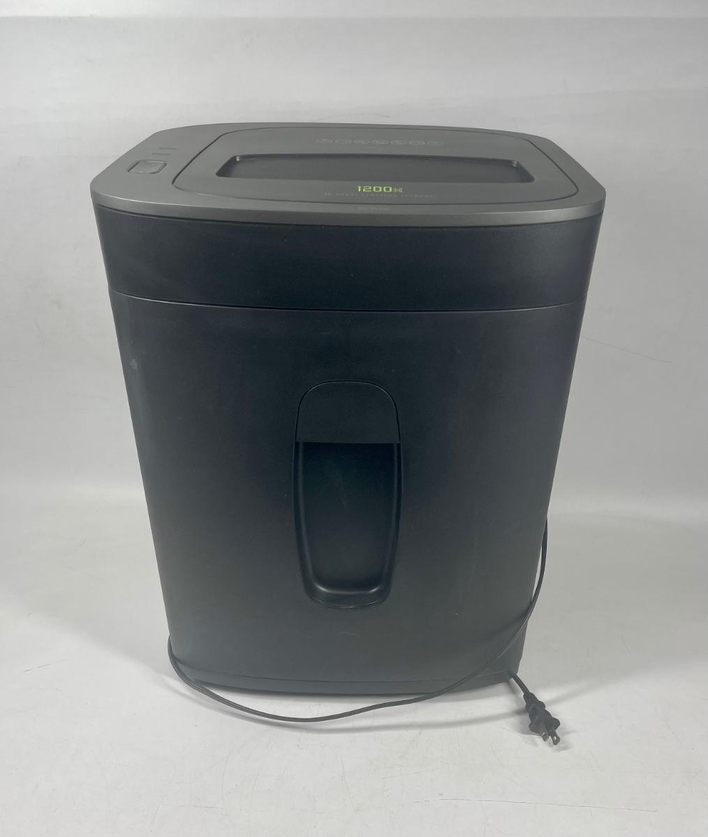 Can also shred credit cards. Sits on small caster wheels. Tested, runs strong.