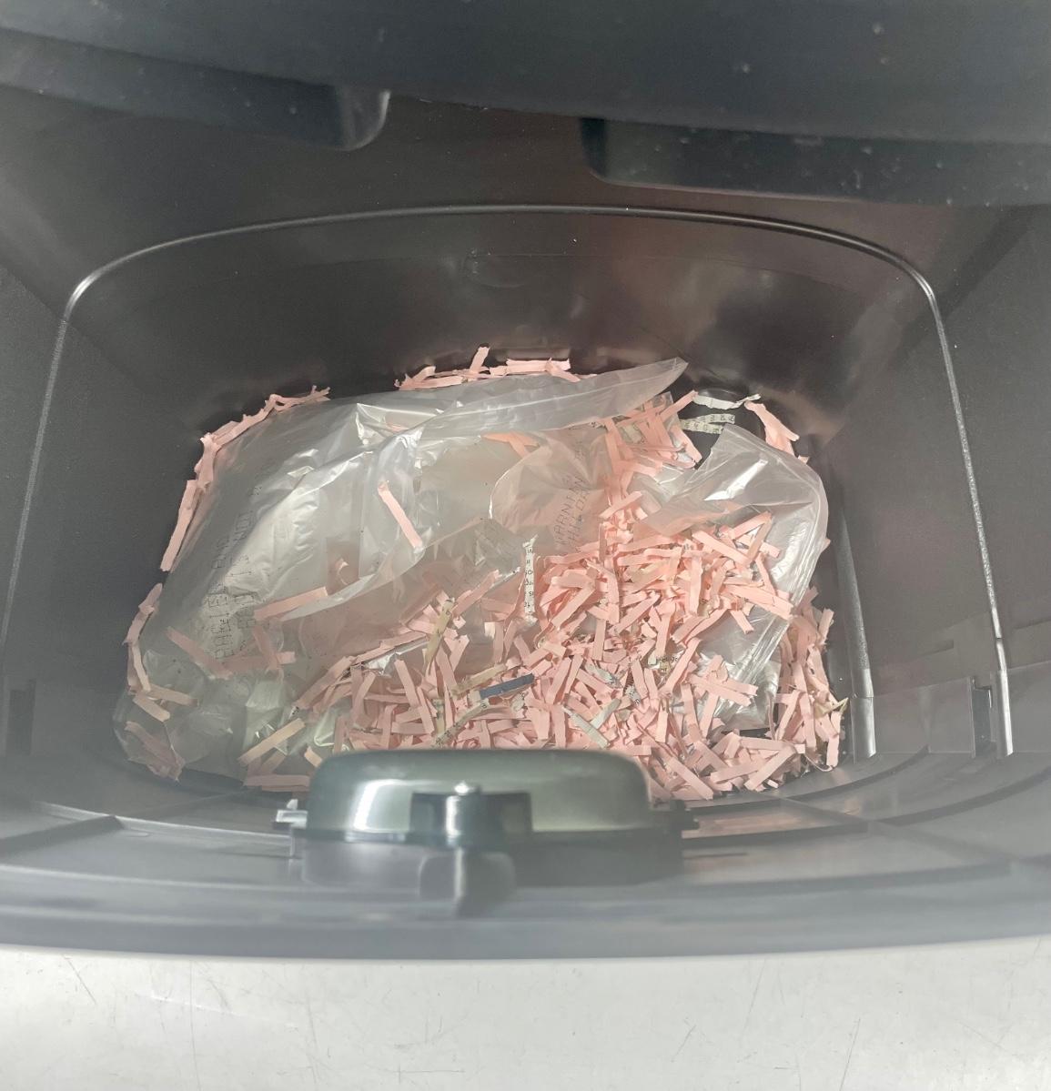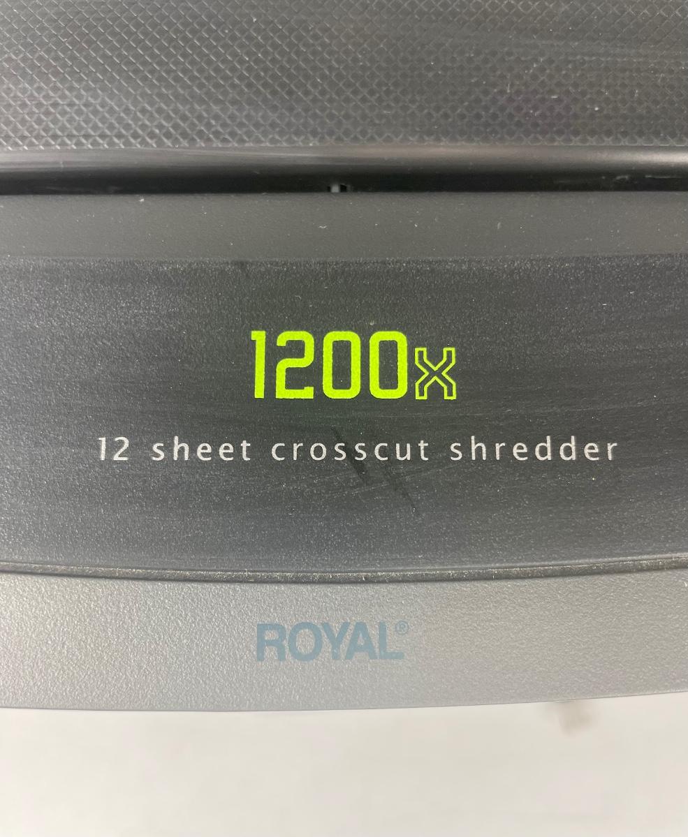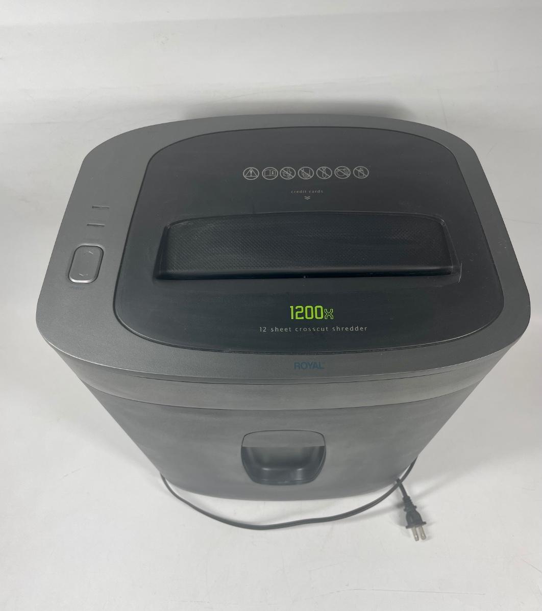 Can also shred credit cards. Sits on small caster wheels. Tested, runs strong.