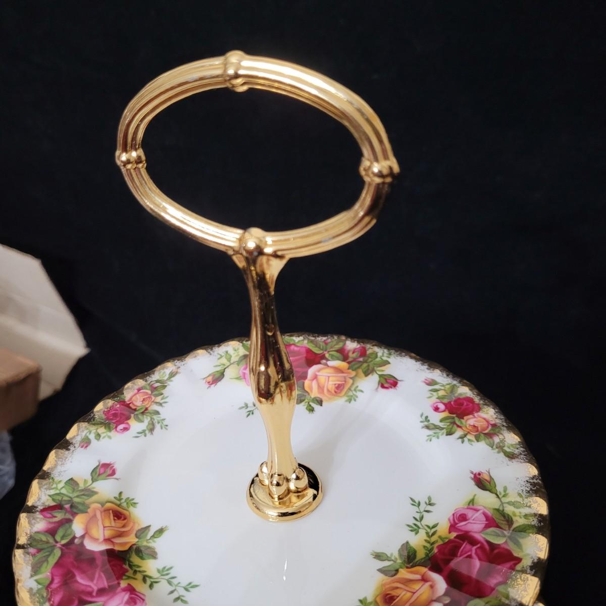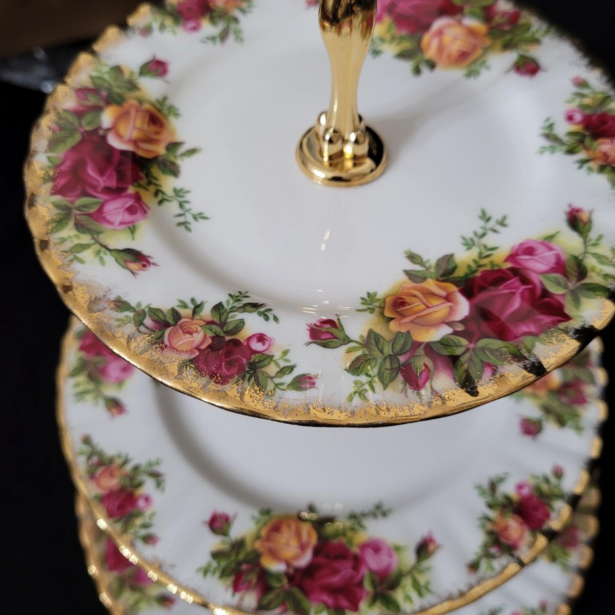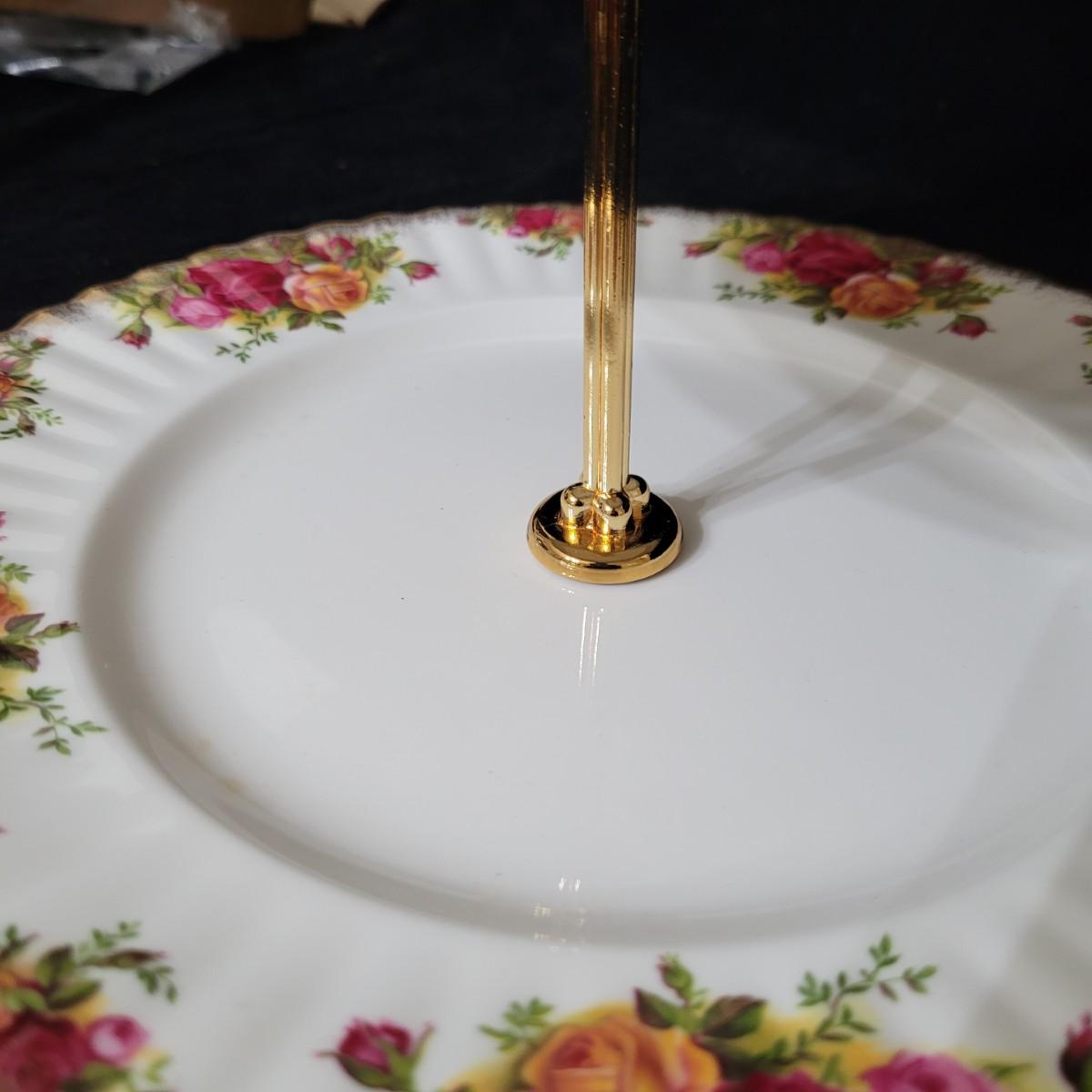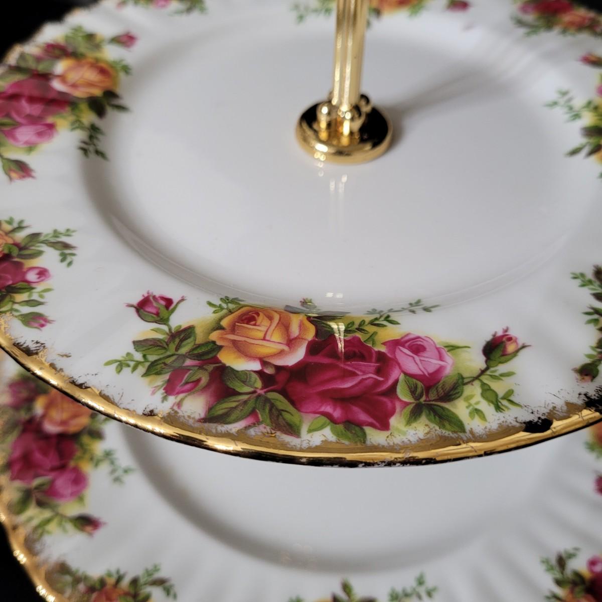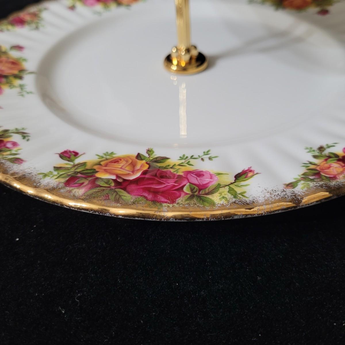 Royal Albert "Old Country Roses" bone china cake stand has a golden rimmed floral edge with a deep pink and peach color scheme. Excellent condition, with original box. Largest plate measures approximately 10"DIA. Shipping available.