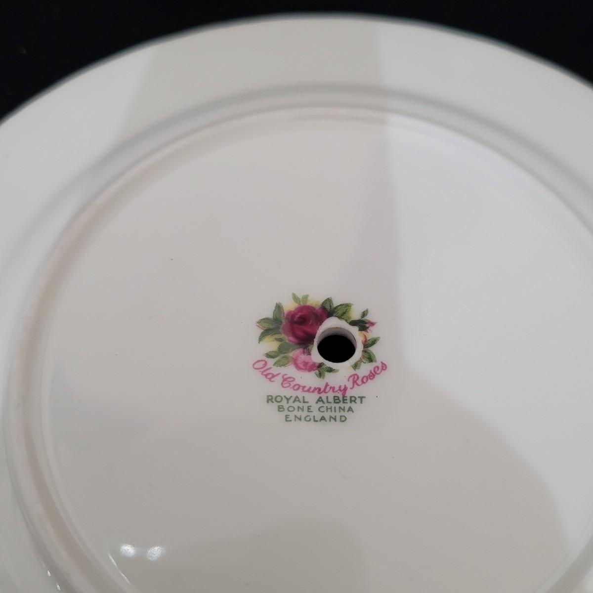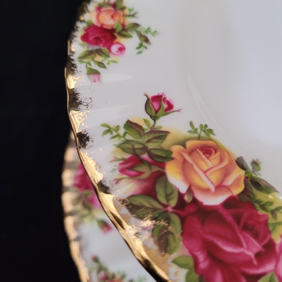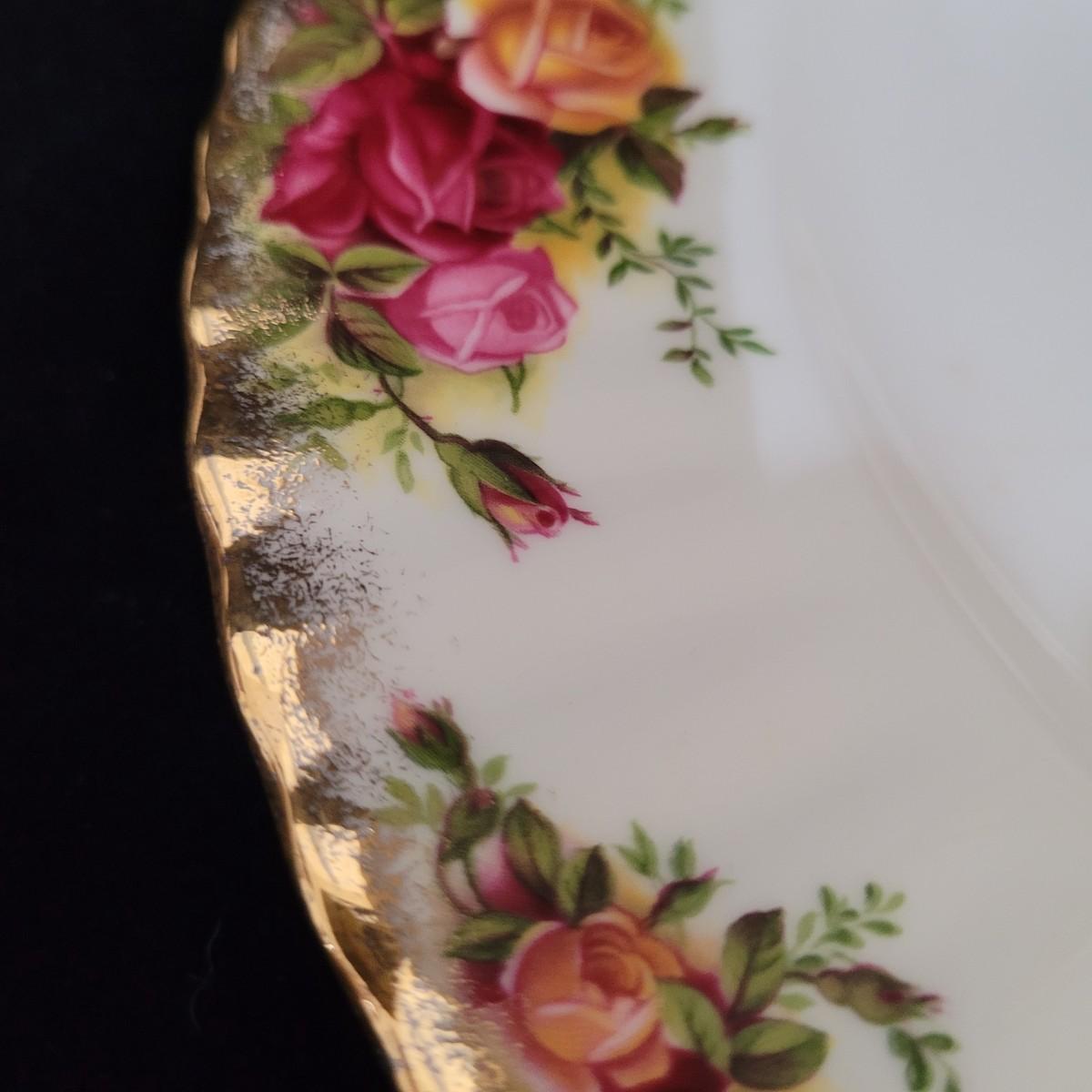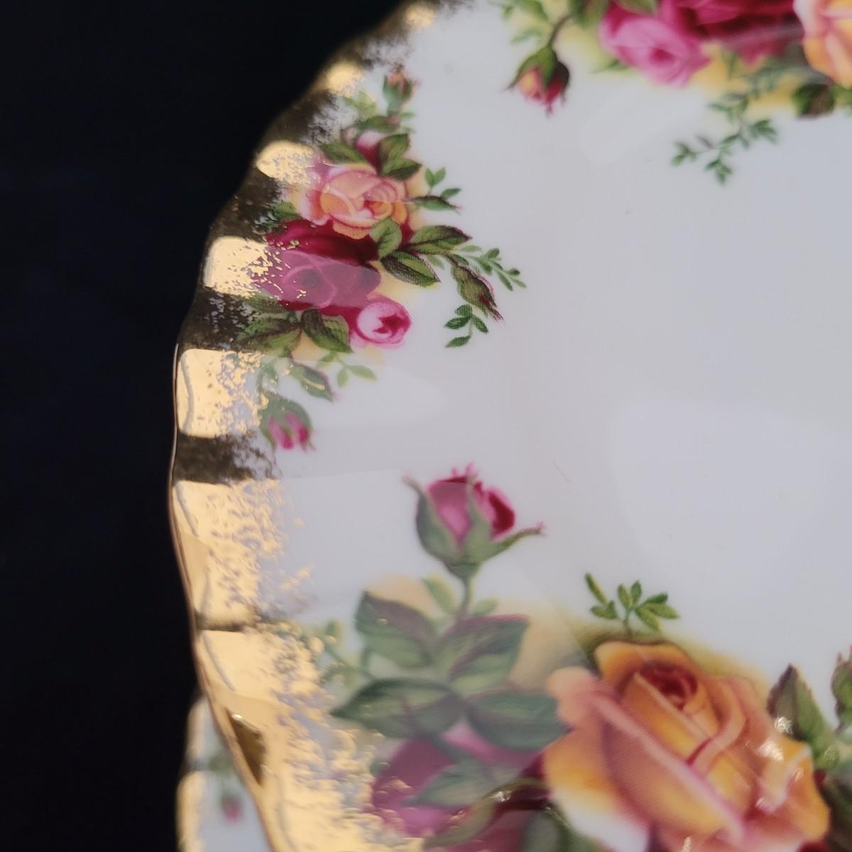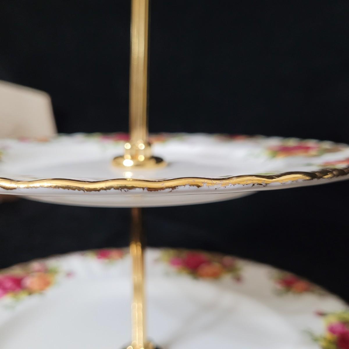 Royal Albert "Old Country Roses" bone china cake stand has a golden rimmed floral edge with a deep pink and peach color scheme. Excellent condition, with original box. Largest plate measures approximately 10"DIA. Shipping available.