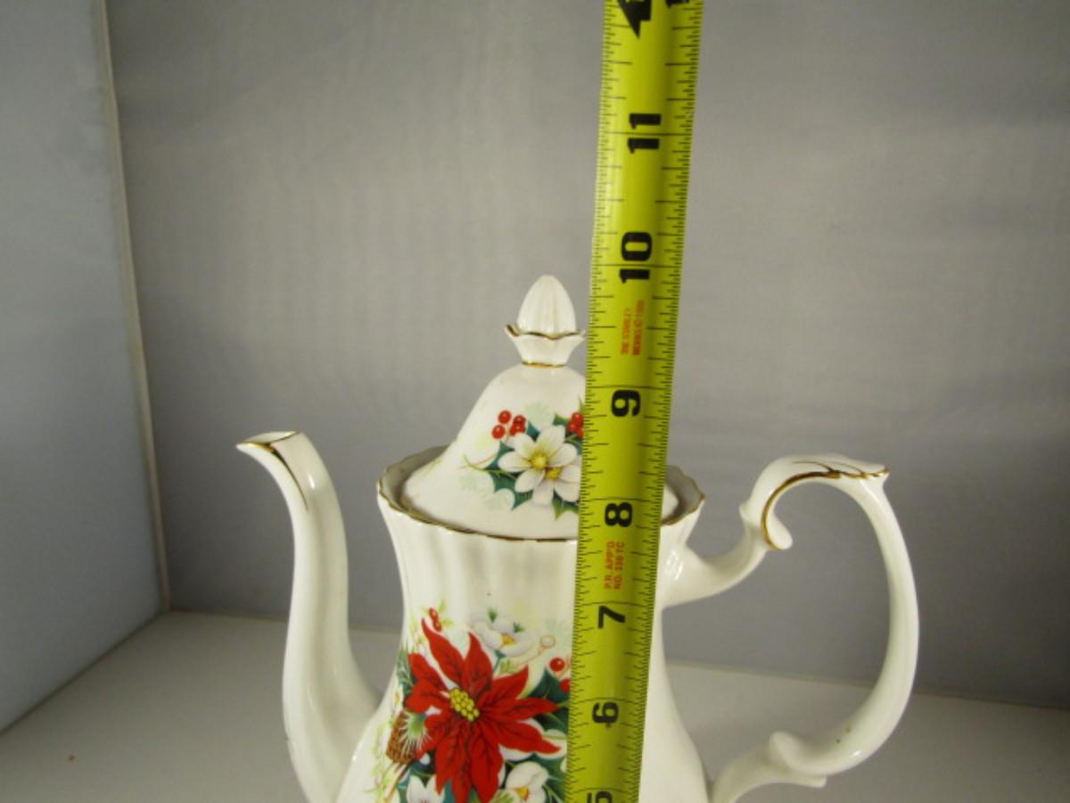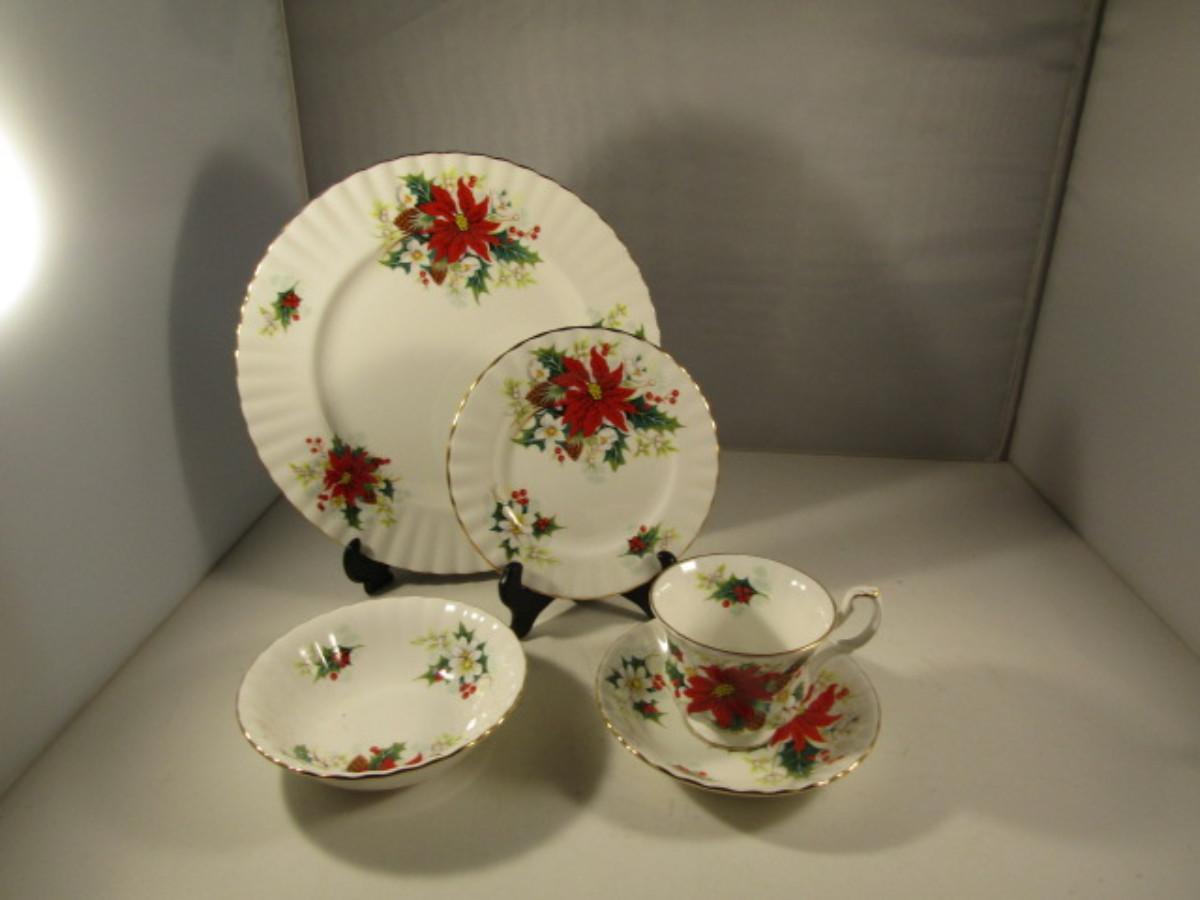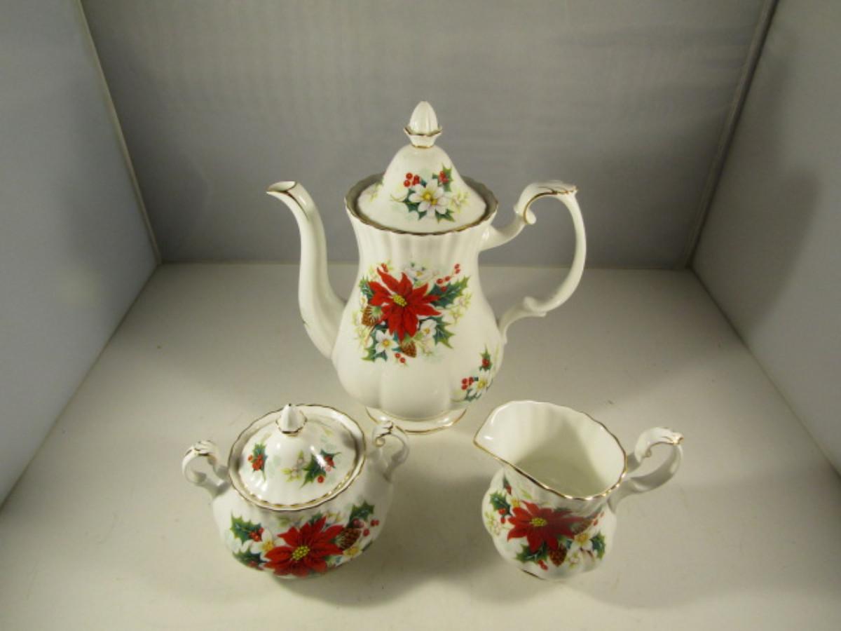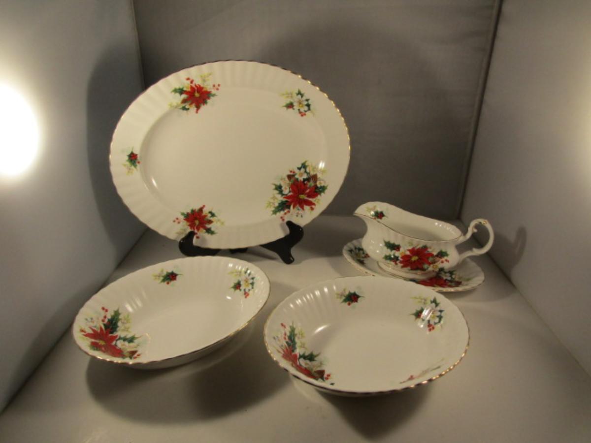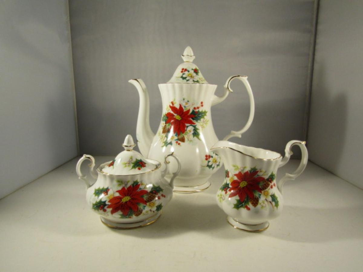 Royal Albert Dinnerware- 'Poinsettia' Pattern- Approx 69 Pieces. Dinner plate- 12, salad plate- 12, bread/dessert plate- 8, berry bowl- 8, cup- 10, saucer- 8, coffee pot- 1, creamer- 1, sugar- 1, 9" oval bowl- 2, 13 5/8" oval platter- 1, Gravy with under plate- 1, mug- 4. Items are in used condition and may have occasional chip, cracking, or crazing.