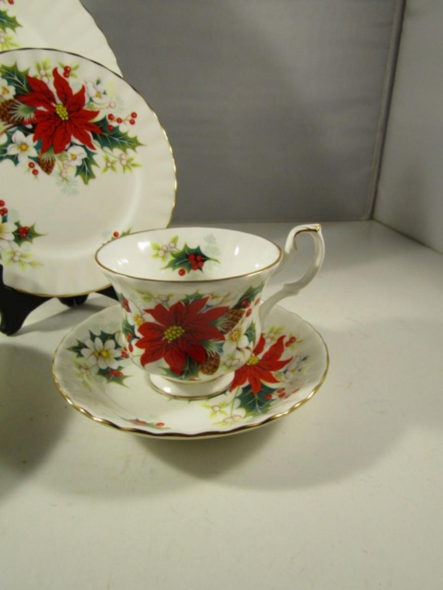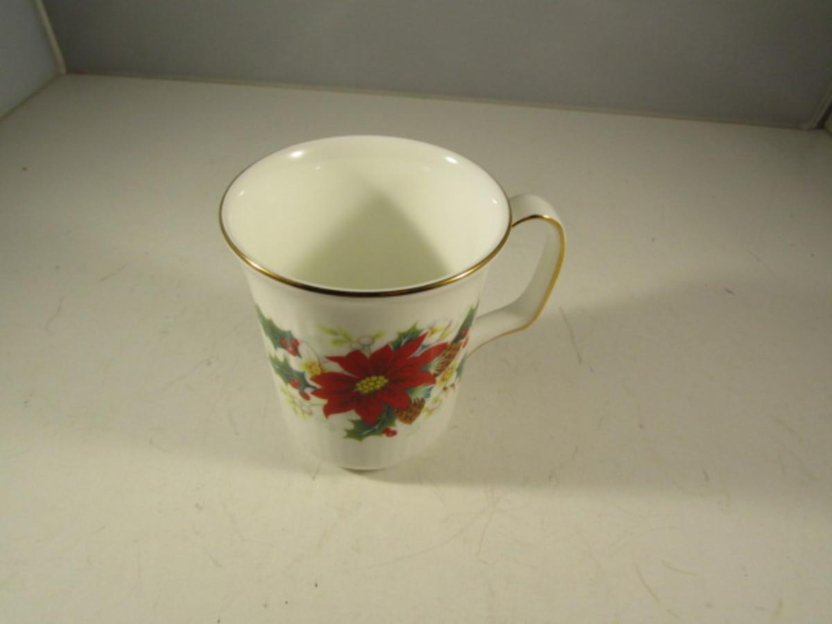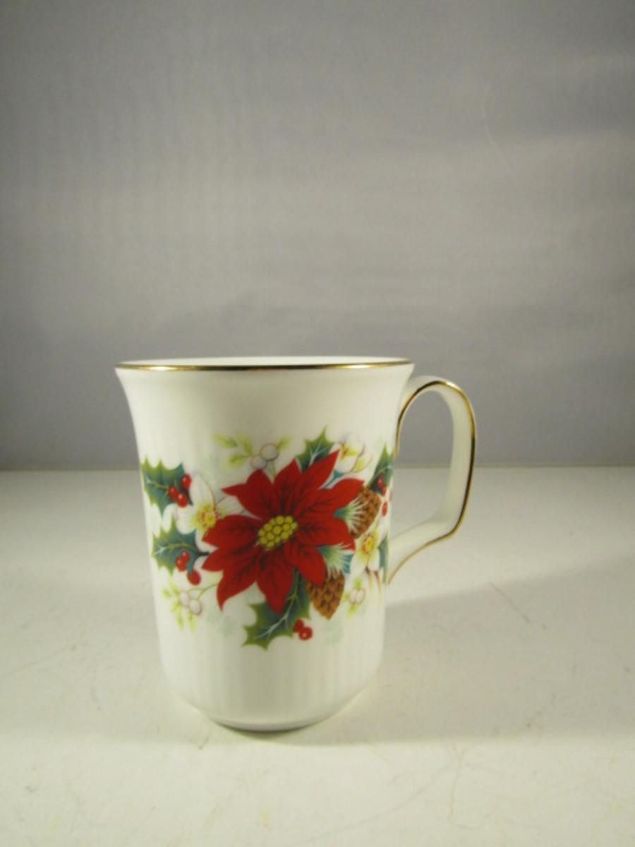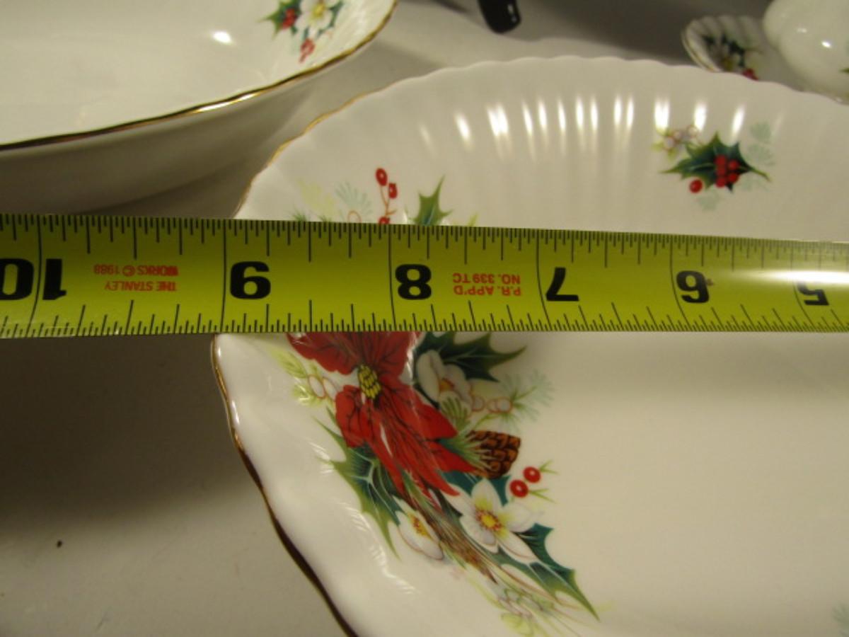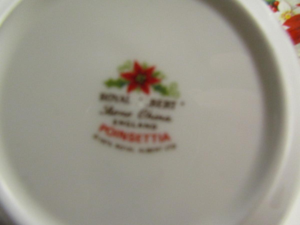 Royal Albert Dinnerware- 'Poinsettia' Pattern- Approx 69 Pieces. Dinner plate- 12, salad plate- 12, bread/dessert plate- 8, berry bowl- 8, cup- 10, saucer- 8, coffee pot- 1, creamer- 1, sugar- 1, 9" oval bowl- 2, 13 5/8" oval platter- 1, Gravy with under plate- 1, mug- 4. Items are in used condition and may have occasional chip, cracking, or crazing.