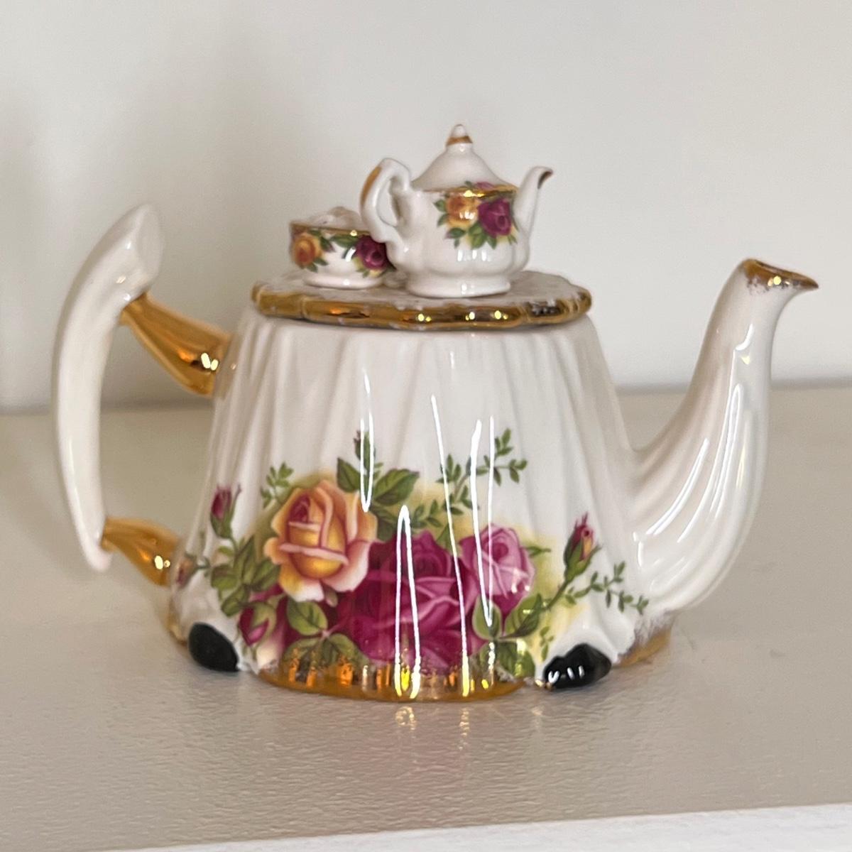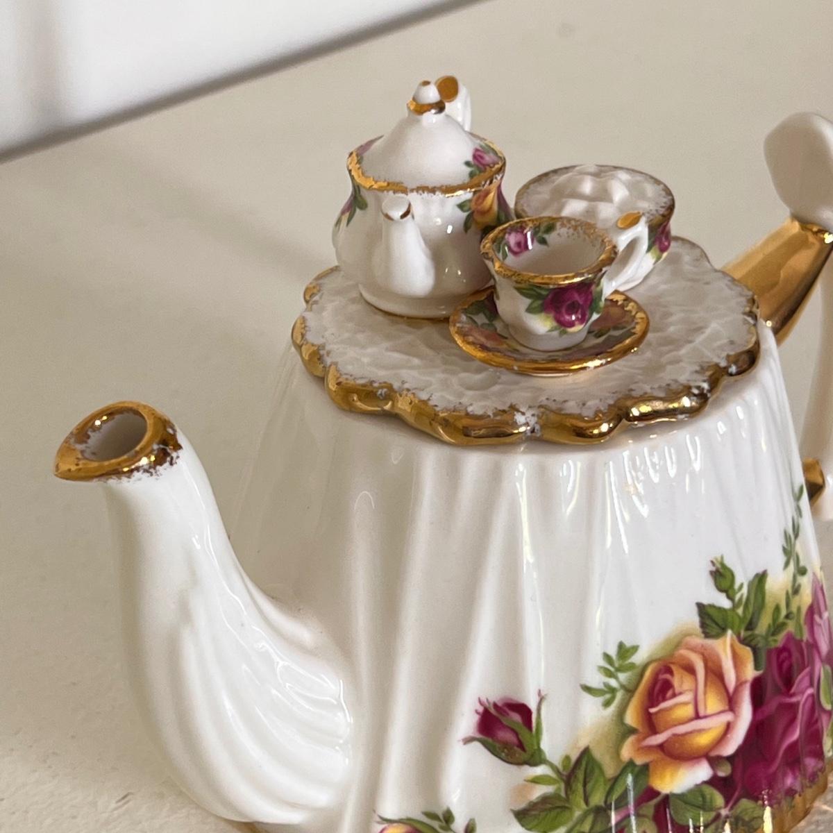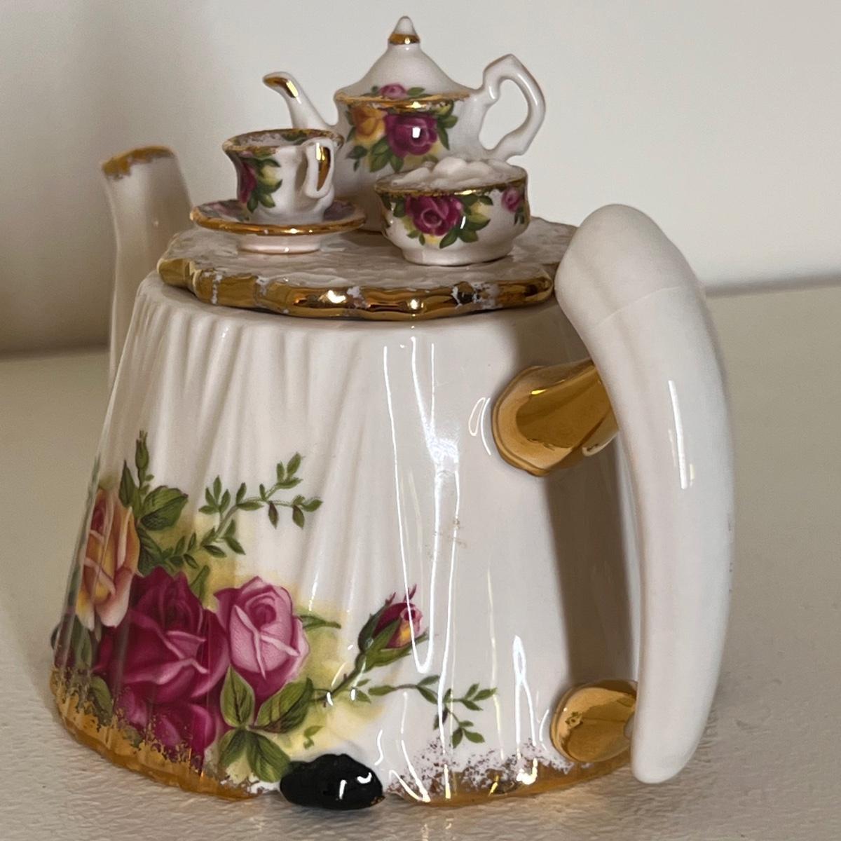 Royal Albert teapot The lid depicts the tabletop, complete with a tiny “˜Old Country Roses’ tea set, and the body is textured like a creamy white, ruffled tablecloth decorated in the signature burgundy, pink and yellow roses motif of the “˜Old Country Roses’ pattern. The lid, spout, handle and base are highlighted in glimmering 22K gold, and the bottom is marked with a Royal Albert Earthenware England “˜Old Country Roses’ trademark.