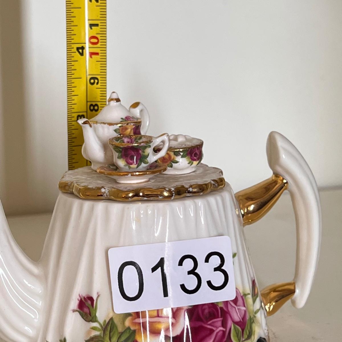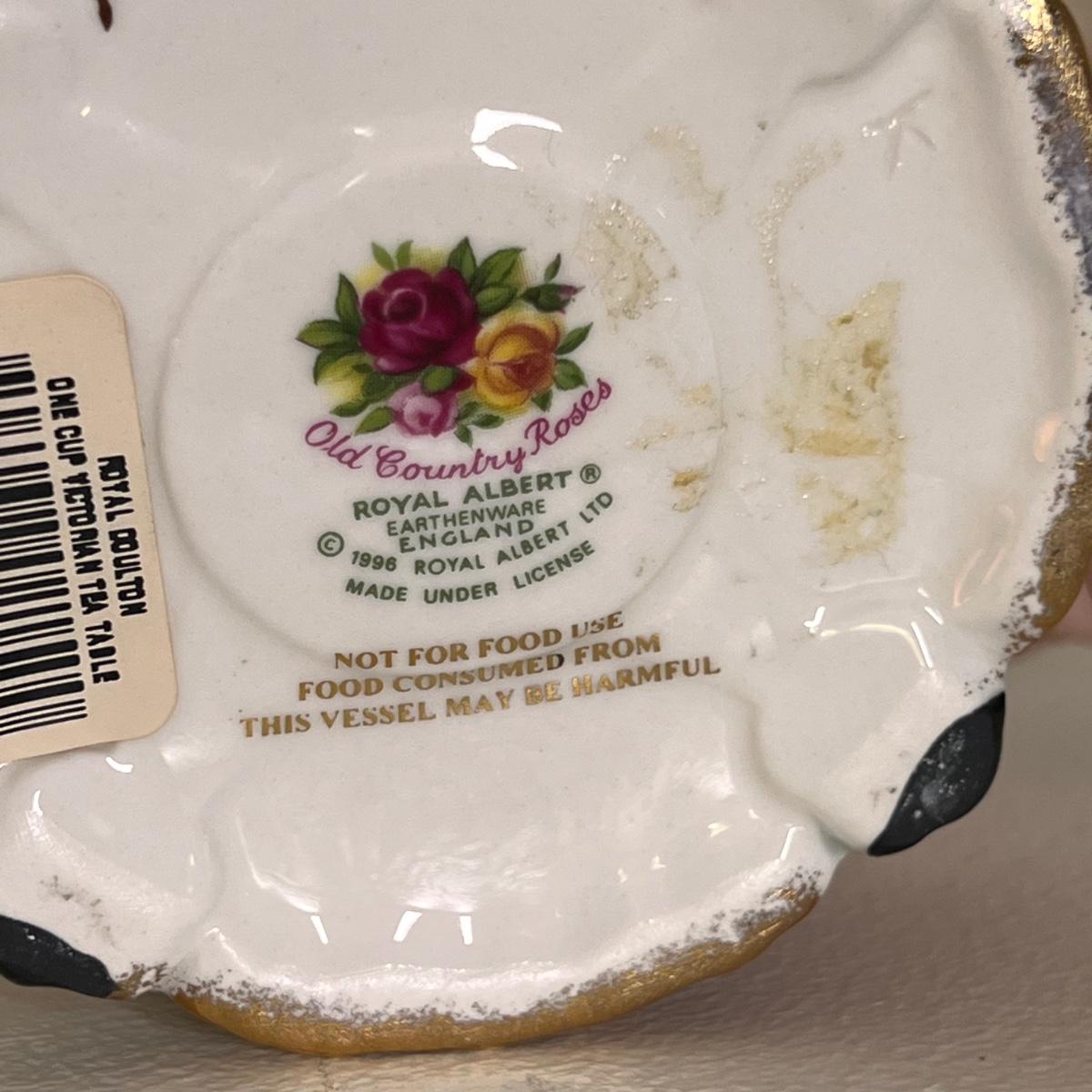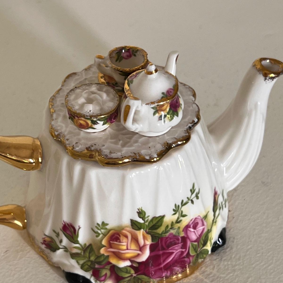 Royal Albert teapot The lid depicts the tabletop, complete with a tiny “˜Old Country Roses’ tea set, and the body is textured like a creamy white, ruffled tablecloth decorated in the signature burgundy, pink and yellow roses motif of the “˜Old Country Roses’ pattern. The lid, spout, handle and base are highlighted in glimmering 22K gold, and the bottom is marked with a Royal Albert Earthenware England “˜Old Country Roses’ trademark.