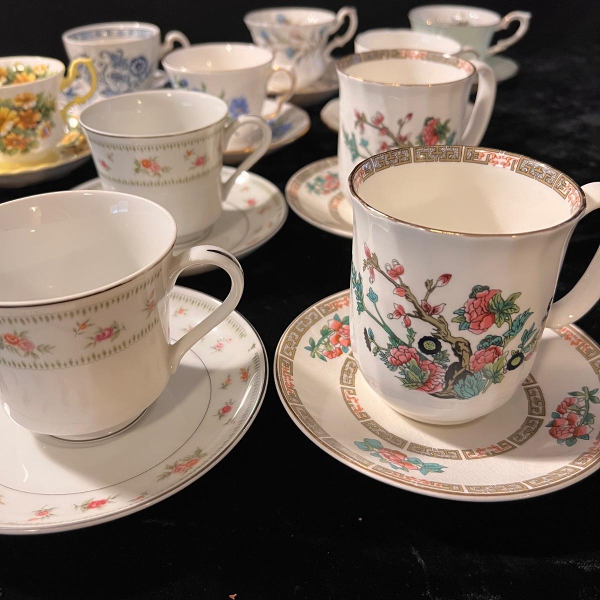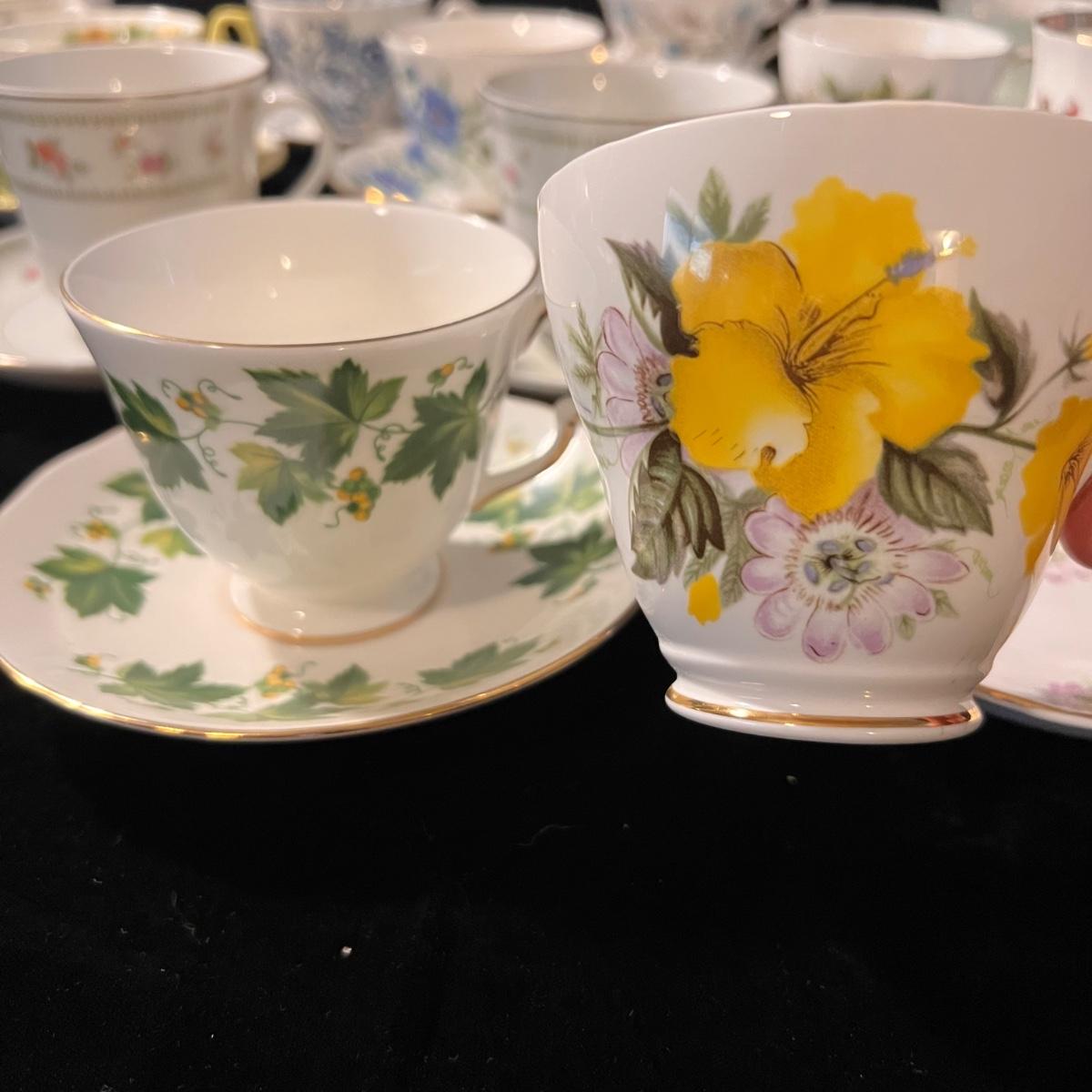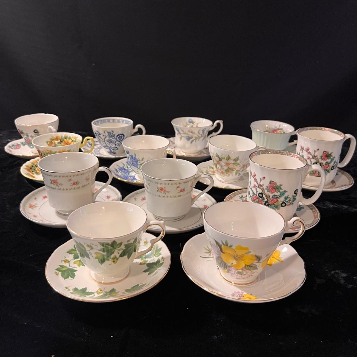 13 cups with matching saucers are mostly bone China. See images for more information. Collection includes two sets of pairs, one pair have pink carnation like flowers, they are larger than the rest of the cups measuring 3”D x 4”H.