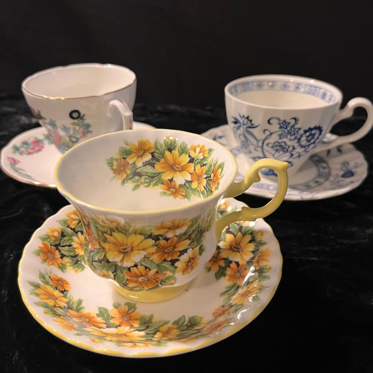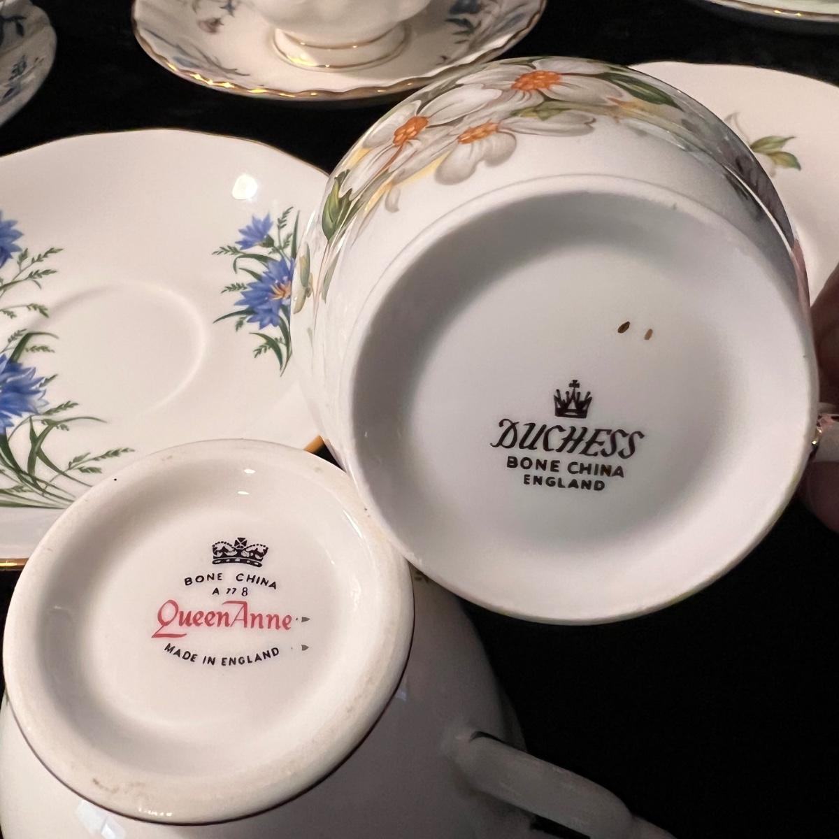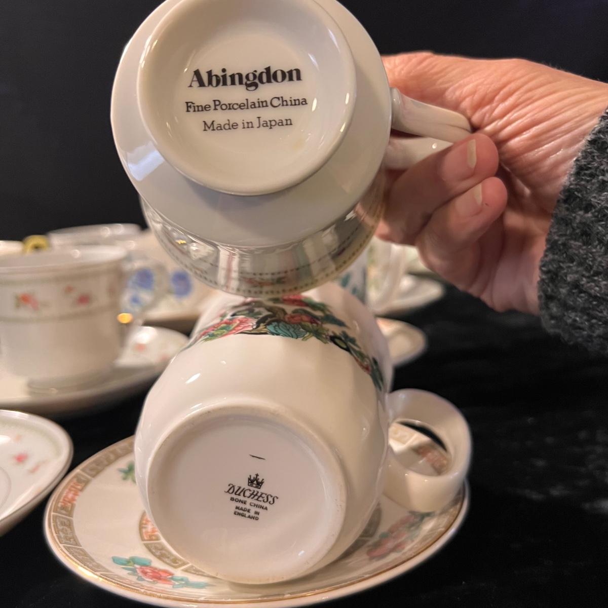 13 cups with matching saucers are mostly bone China. See images for more information. Collection includes two sets of pairs, one pair have pink carnation like flowers, they are larger than the rest of the cups measuring 3”D x 4”H.