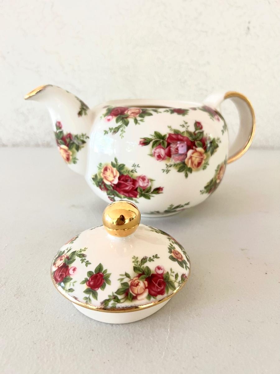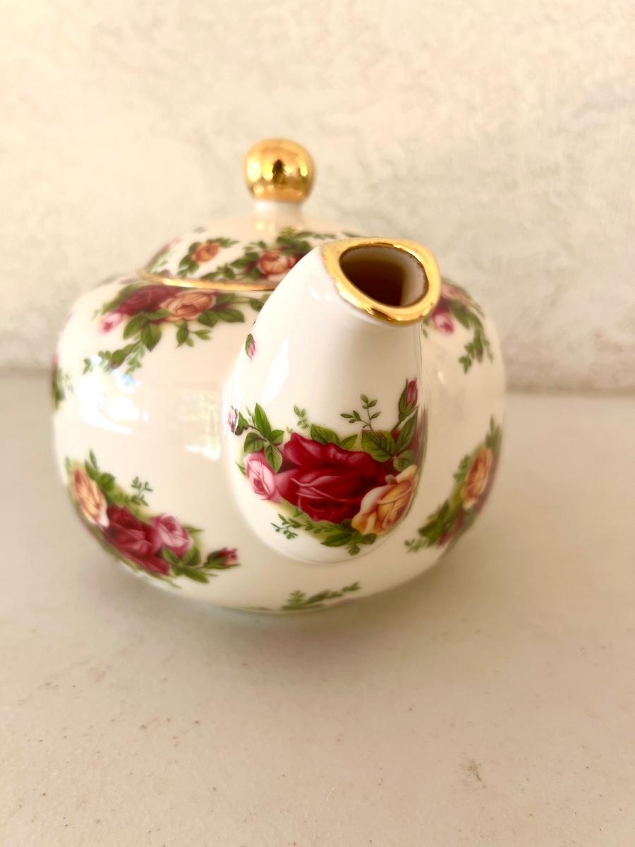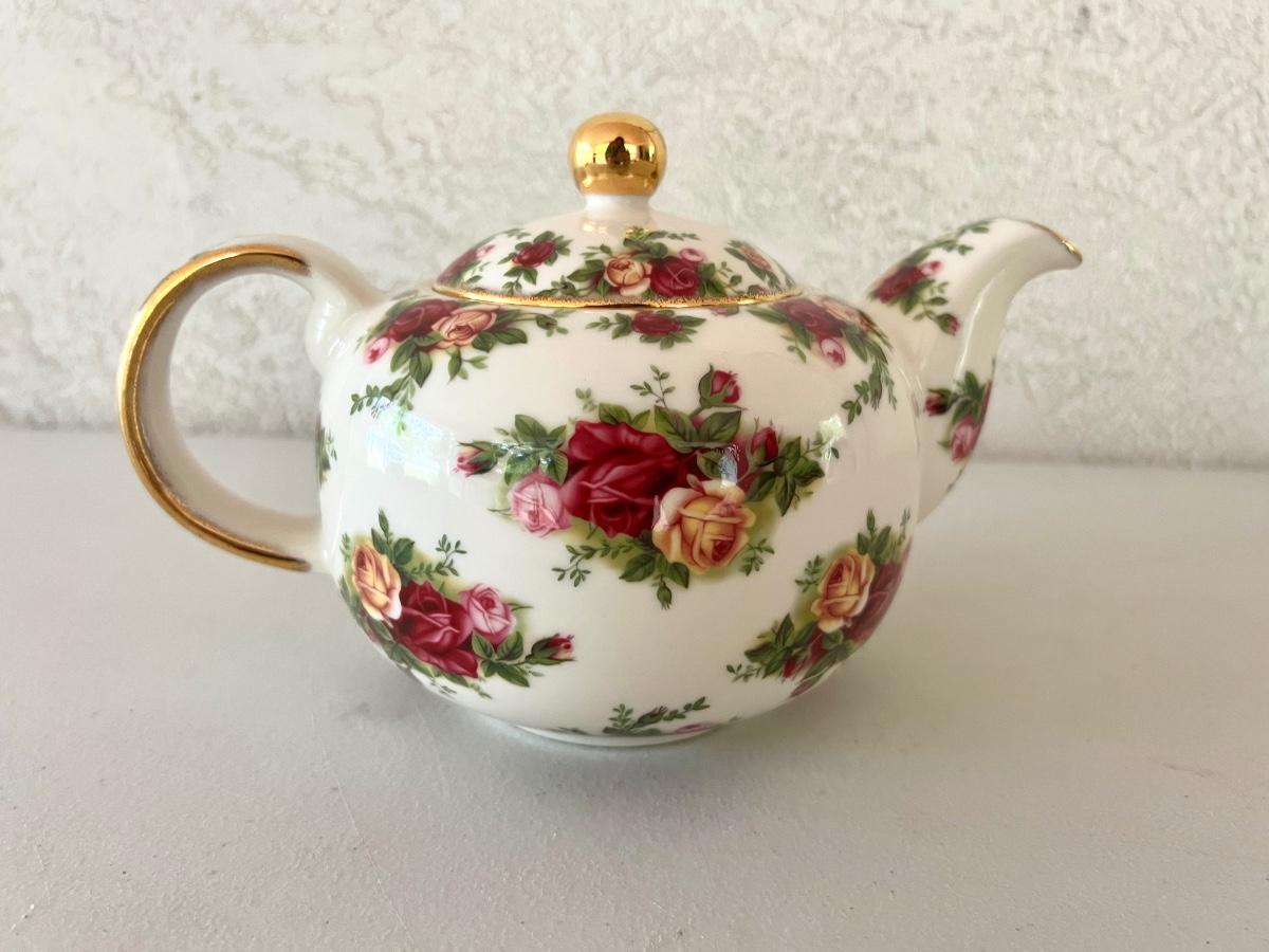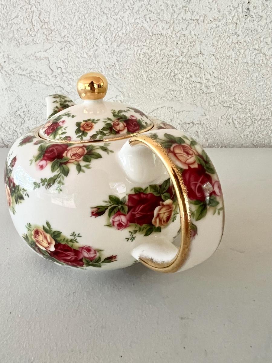1998 Royal Albert Old Country Roses Teapot. Measures 5 inches tall and 9 inches wide.