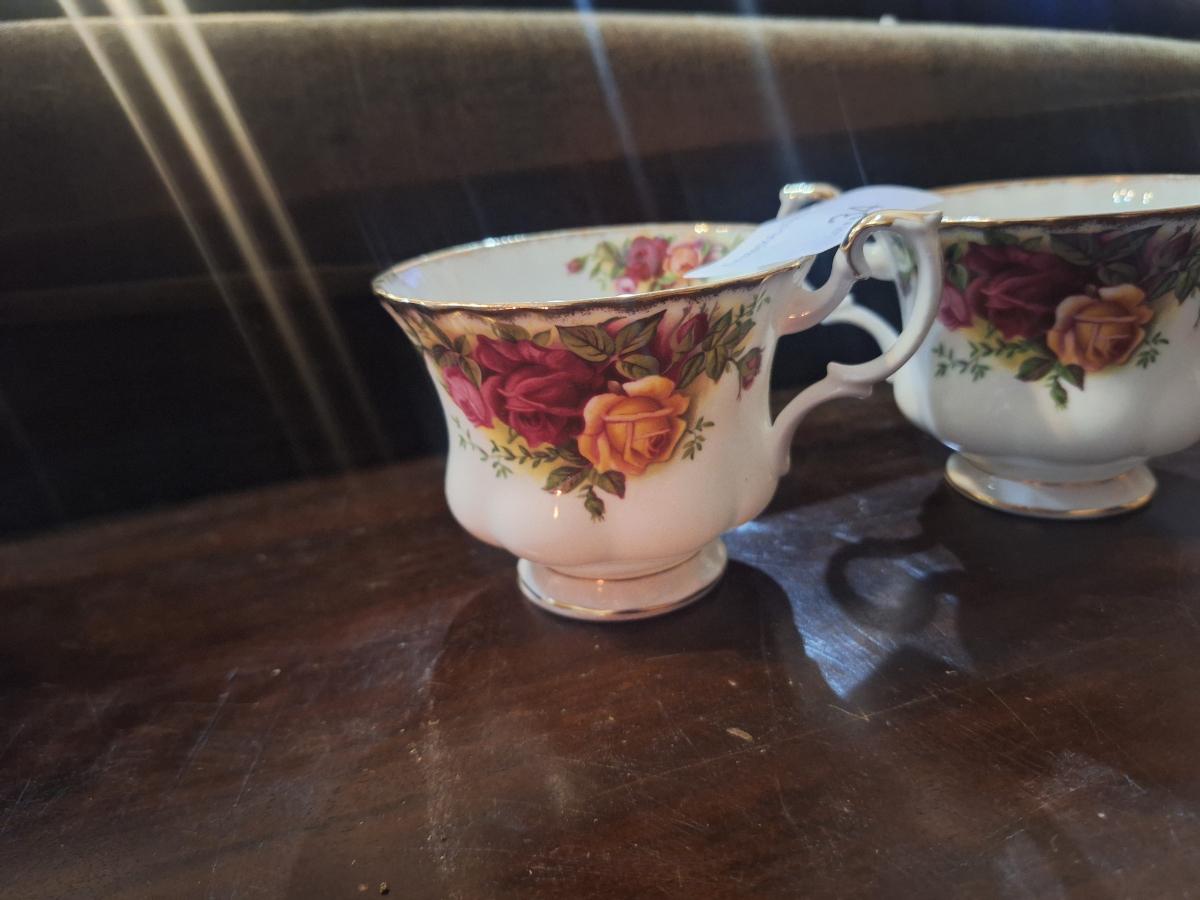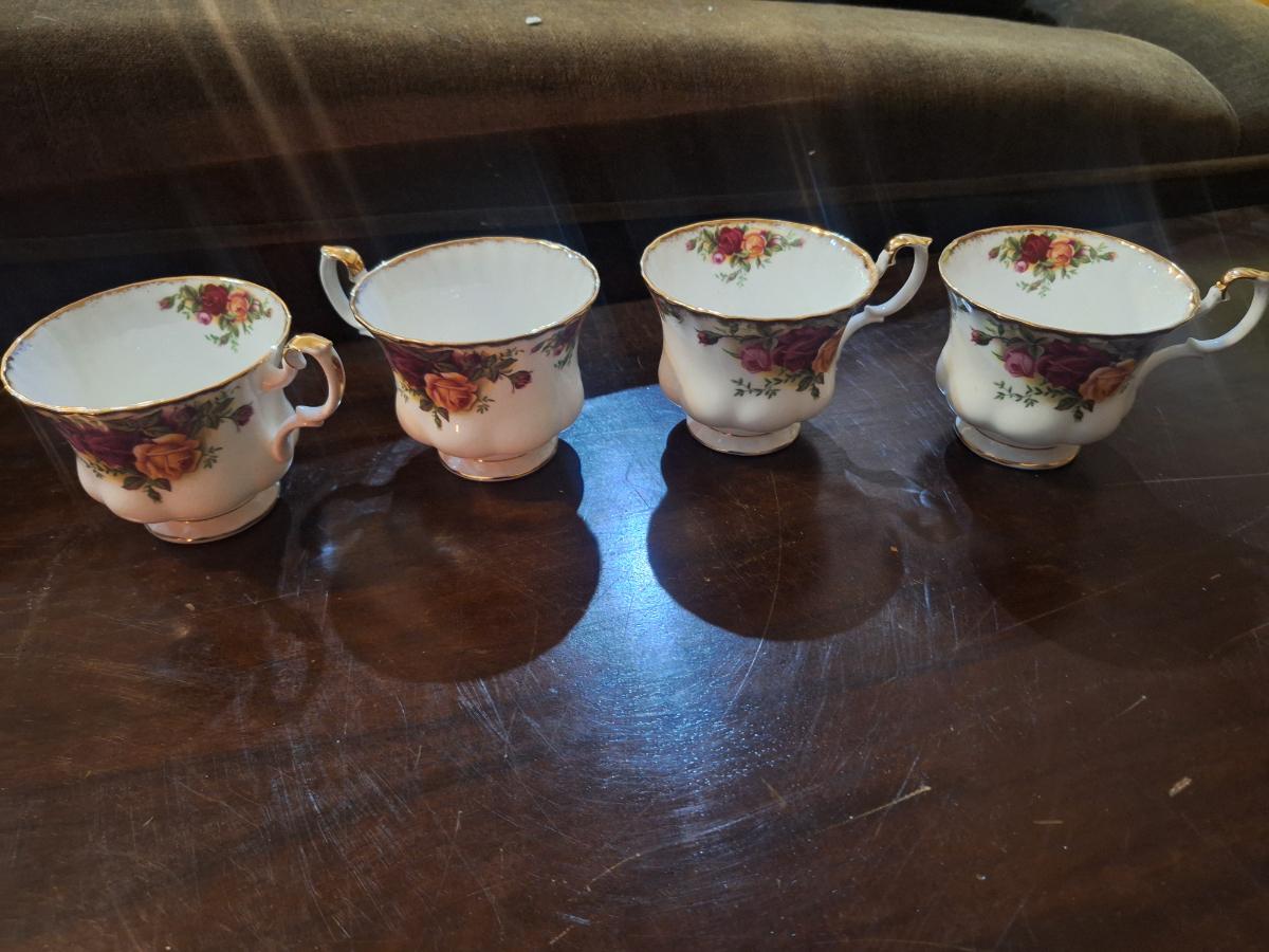 pattern designed in 1962 22 carat gold banding trim montrose shape teacups of fine bone china. One of the best selling dinnerware patterns of vintage china. (look at ebay prices for these!).