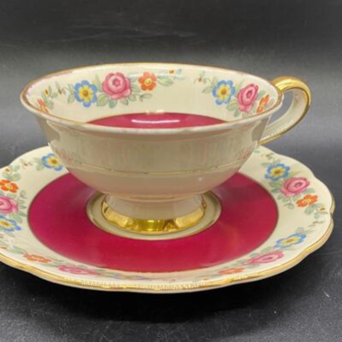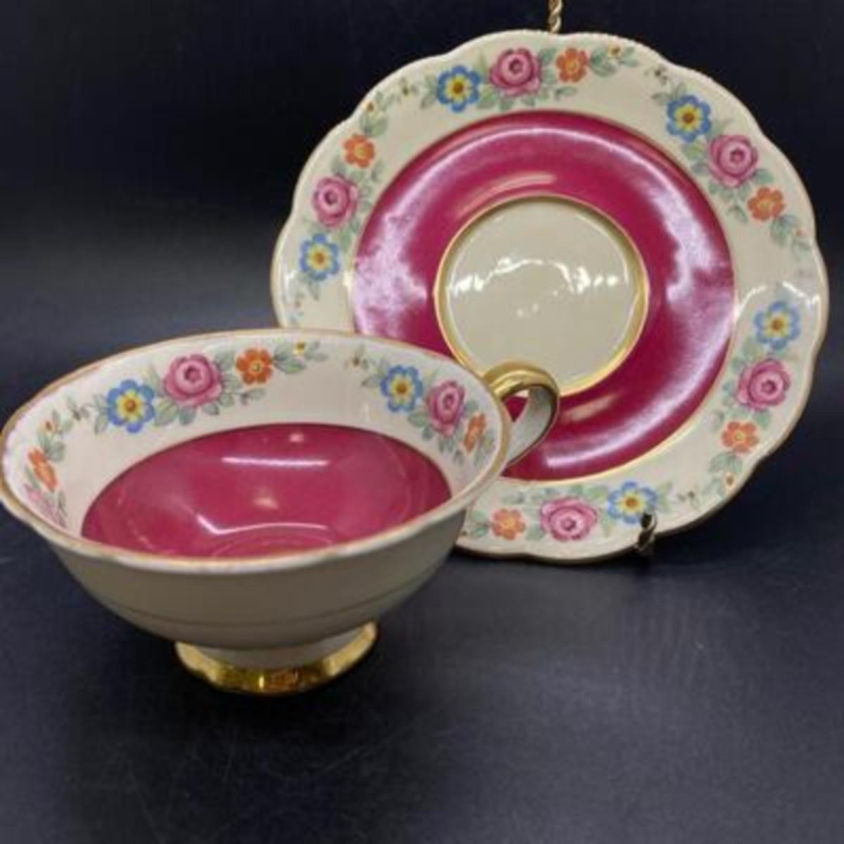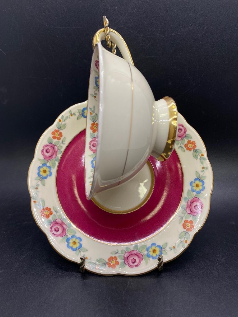 Royal Bayreuth teacup & saucer. Burgundy with colorful flower edge, gold trim. Made in Germany. Good condition, no chips or damage.