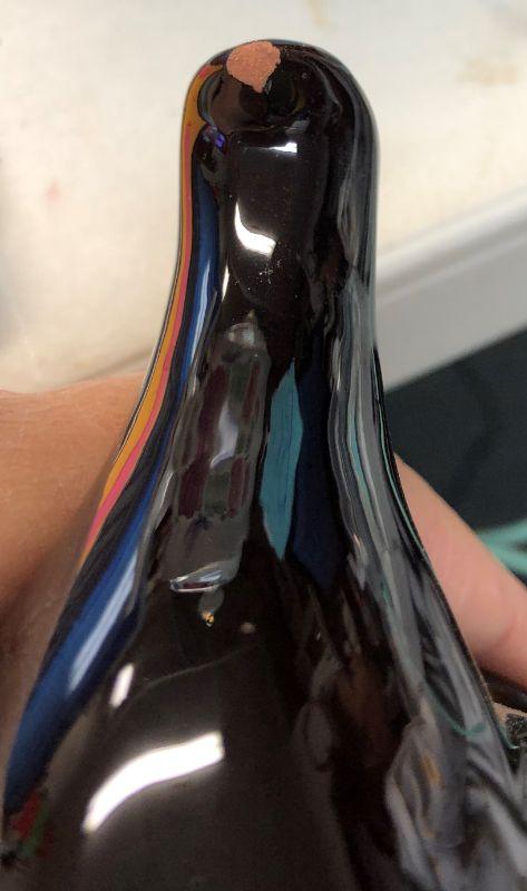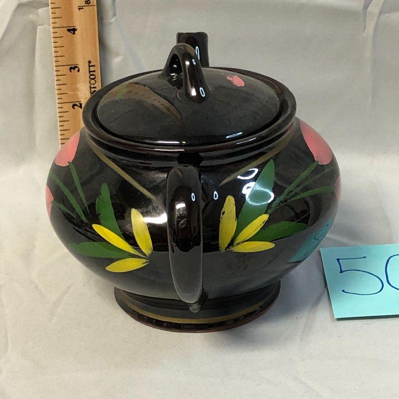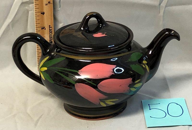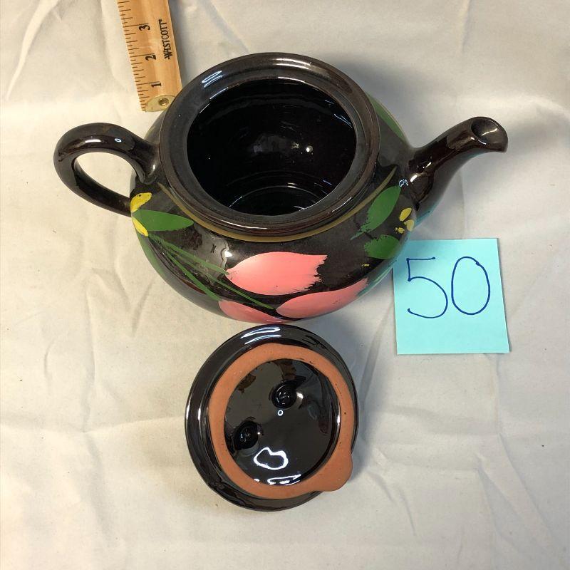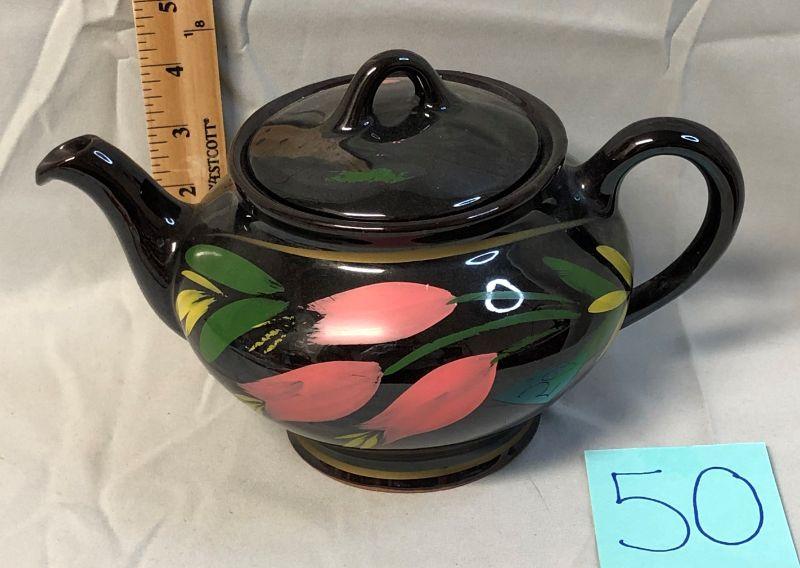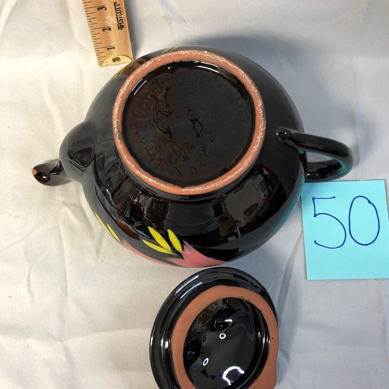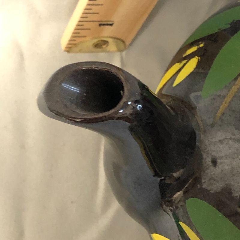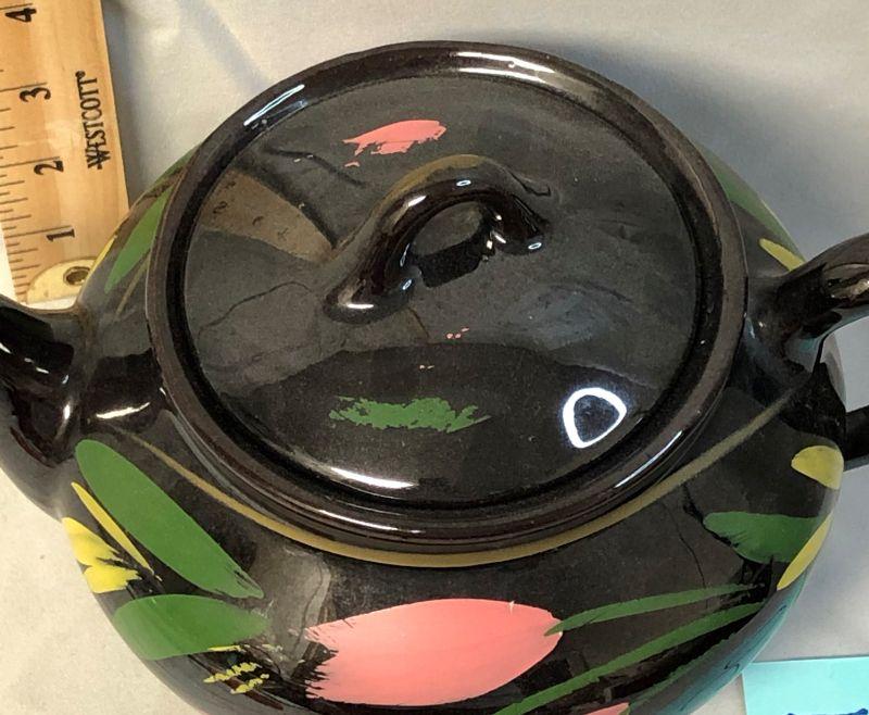 The main issue with this is the paint loss on the lid and there is a small chip under the lip of the spout. The rest of the paint appears to be in good condition. It is about 6" tall.