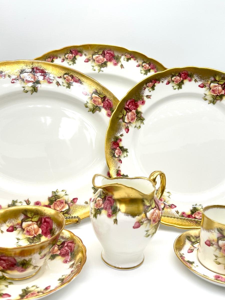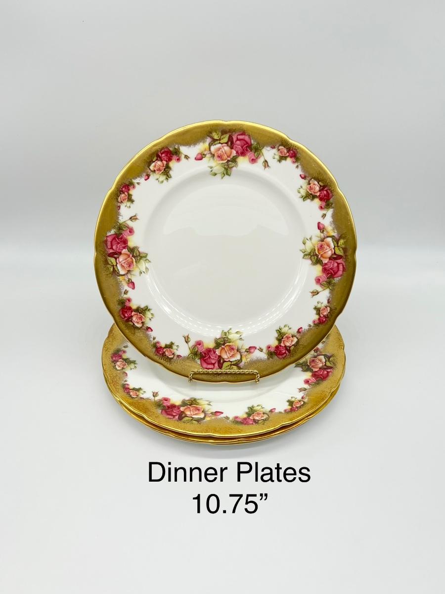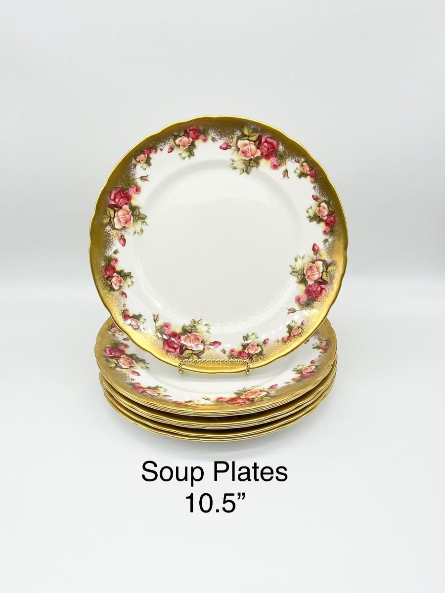 Not a complete set ~ Set includes: 4 dinner plates ~ 7 soup plates ~ 4 footed cups with 4 saucers ~ 5 flat demitasse cups with 5 saucers ~ 2 serving platters ~ 1 creamer