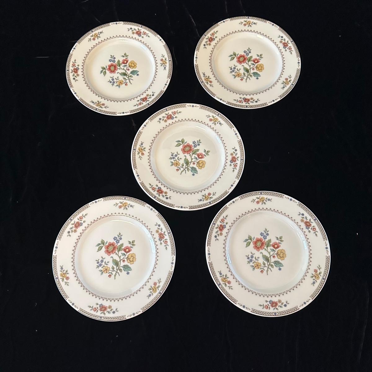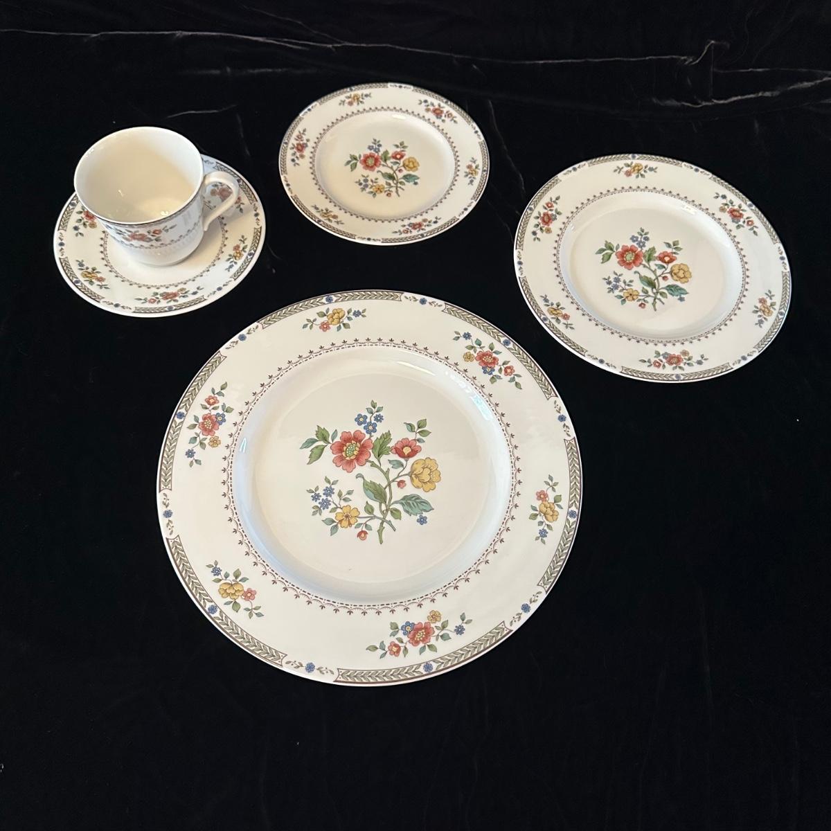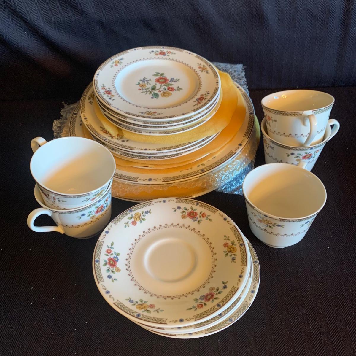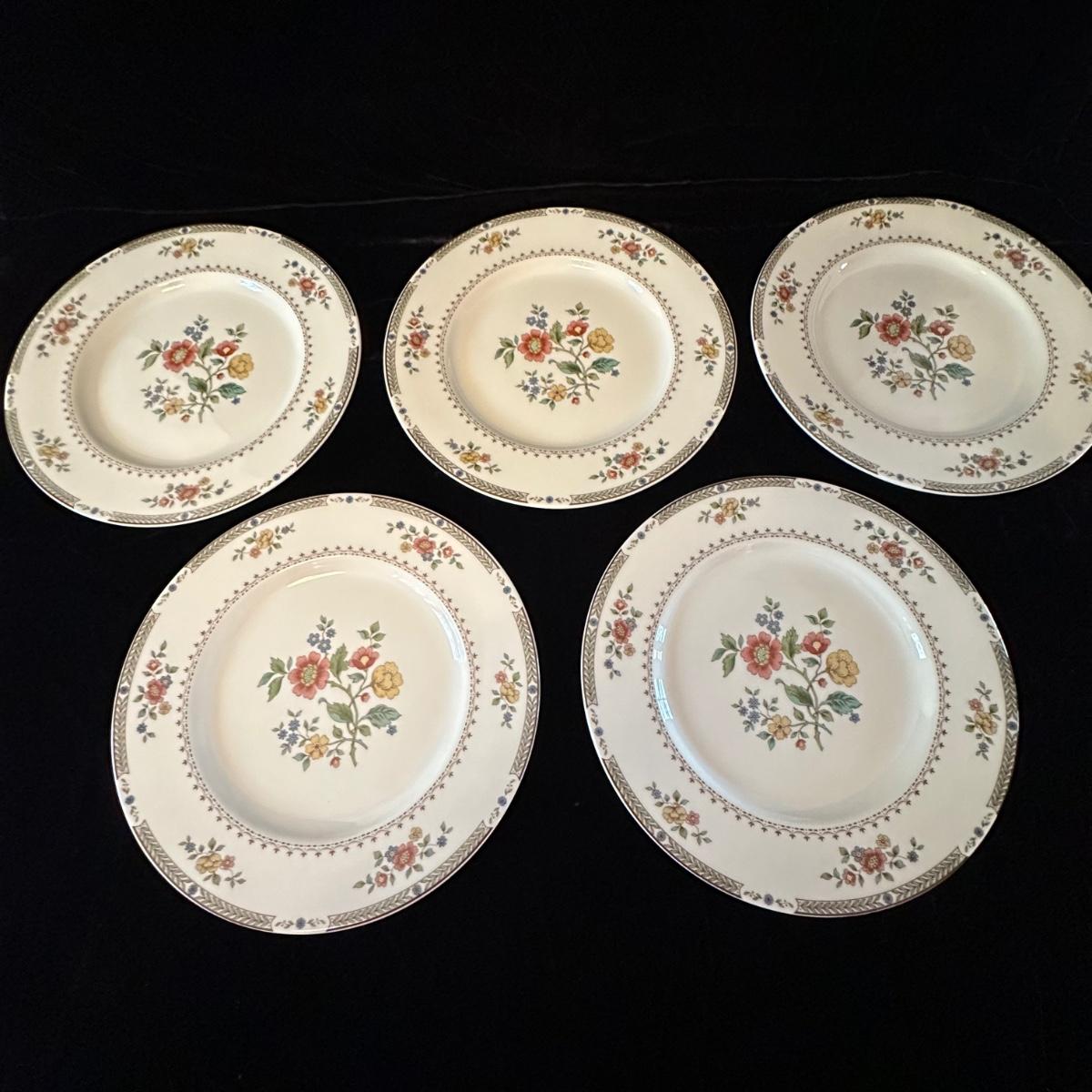 Five 5-piece place settings of Royal Dalton China/Kingswood pattern. Dinner plate measures 10.5”D. Shipping available.