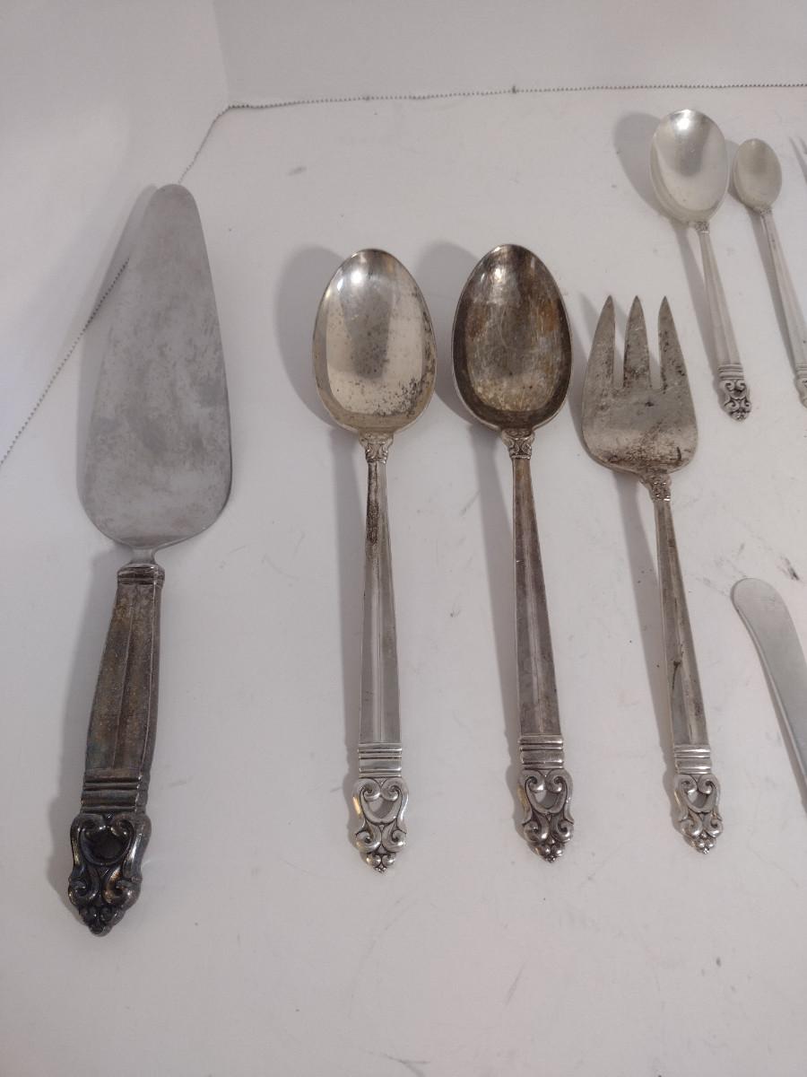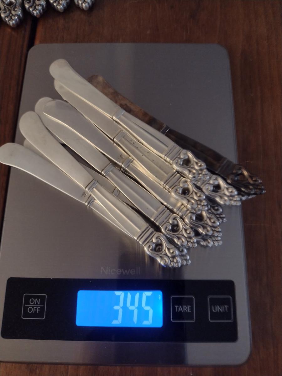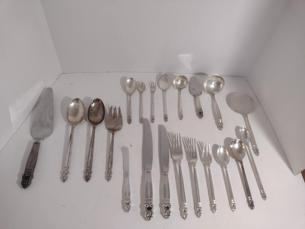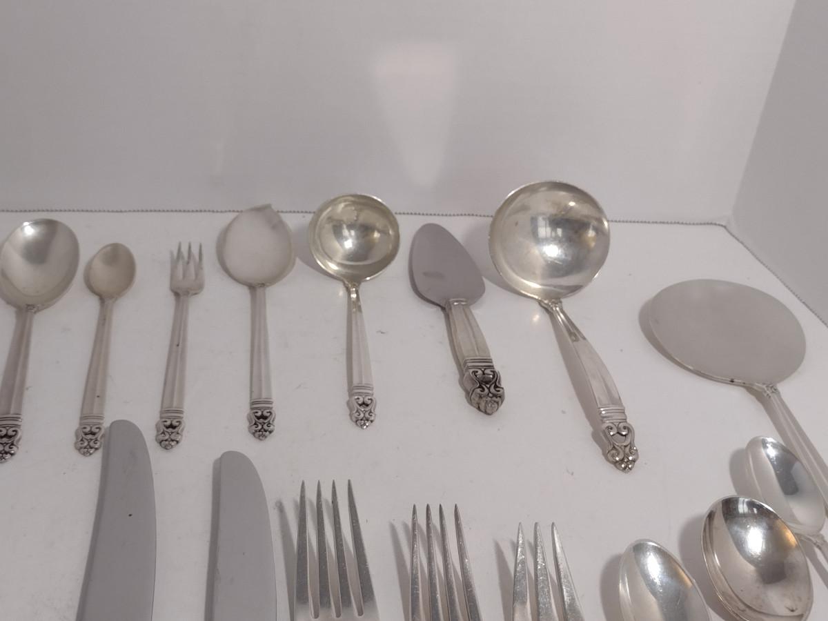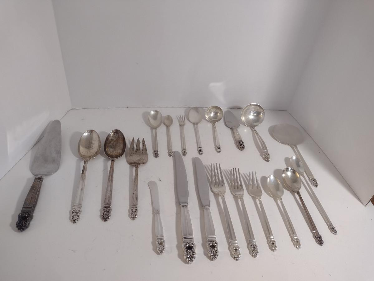 Royal Danish International Sterling Silver Flatware- Approx 104 Pieces and Total Weight 3,944 Grams. Pieces included: dinner knife- 11, luncheon knife- 5, dinner fork- 12, luncheon fork- 4, salad fork- 12, cocktail fork- 5, regular place spoon- 26, long iced tea spoon- 4, soup spoon- 2, butter spreader- 12, large vegetable serving spoon- 2, medium meat serving fork- 1, pie server- 1, cheese server- 1, cream ladle- 1, gravy ladle- 1, tomato server- 1, sugar spoon- 1, baby spoon- 1, jelly server spoon- 1. Total weight shown does not include dinner knives, luncheon knives, pie server, or cheese server because they have stainless steel blades. Items are in used, vintage condition and some have discoloration/tarnish.