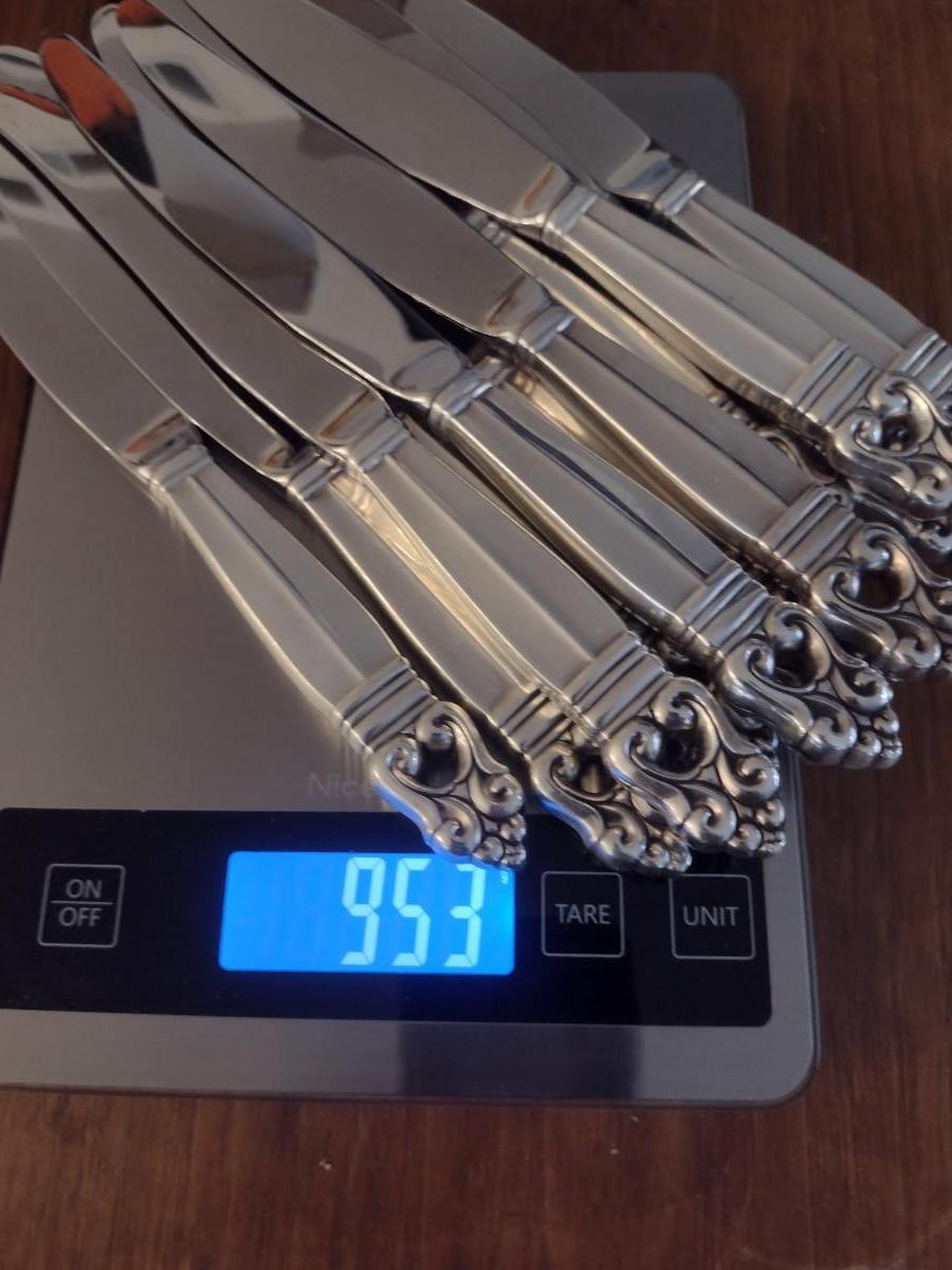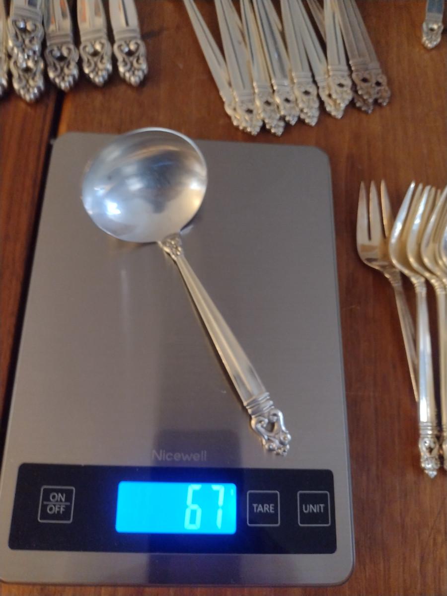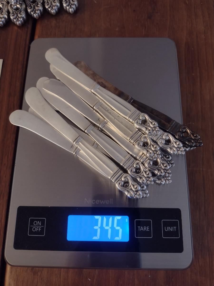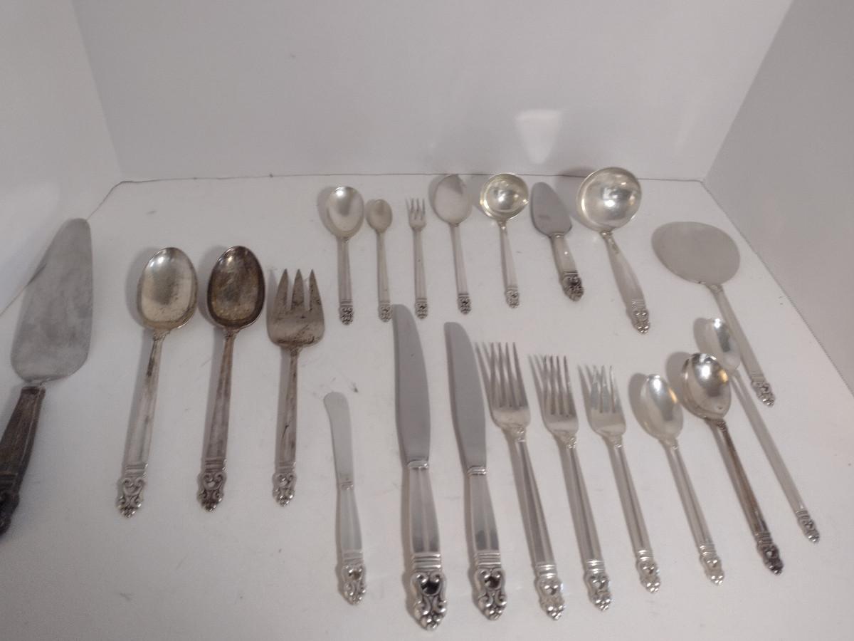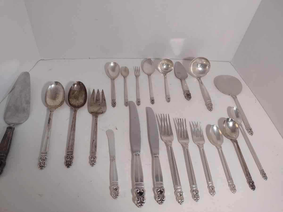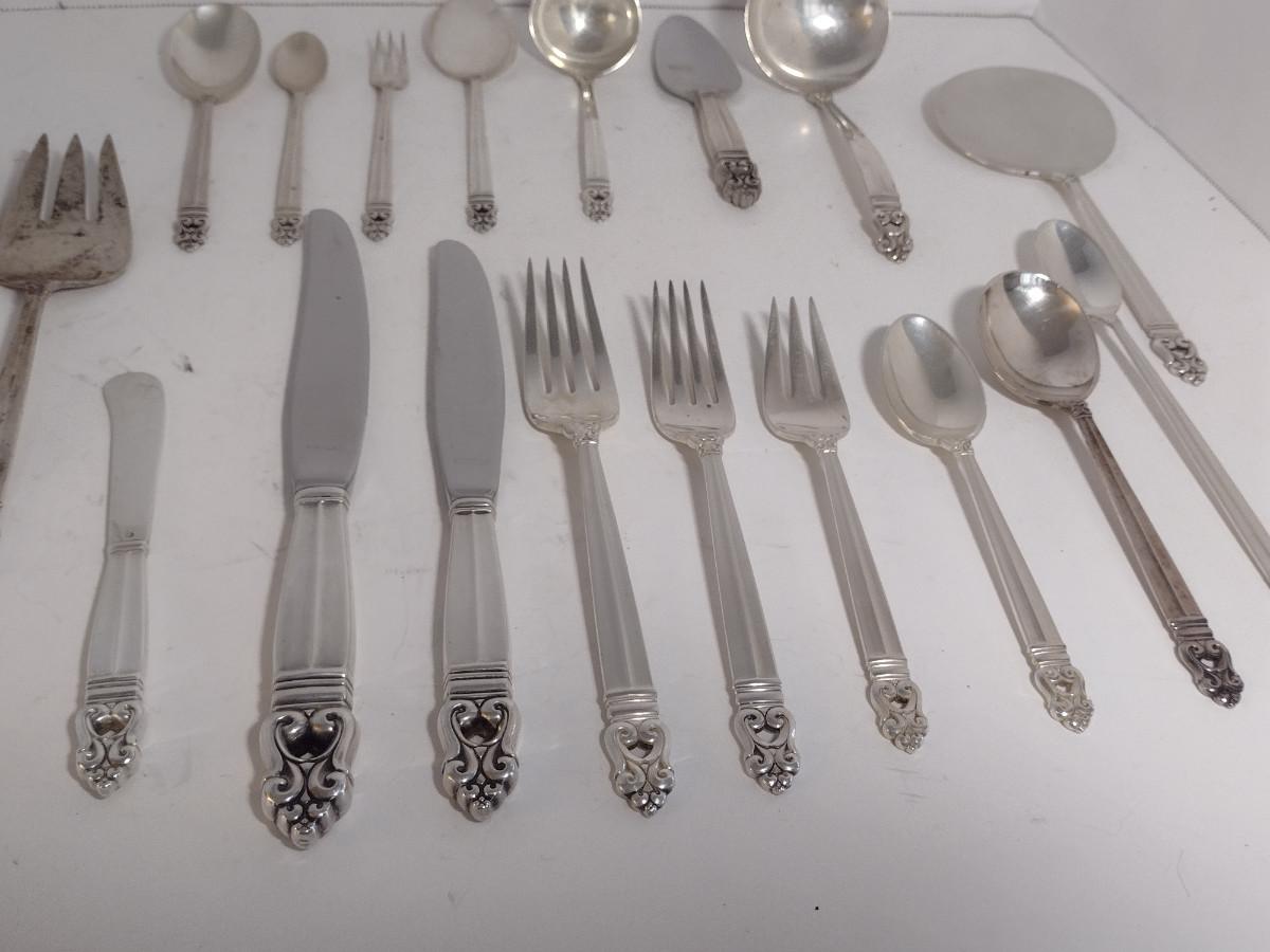 Royal Danish International Sterling Silver Flatware- Approx 104 Pieces and Total Weight 3,944 Grams. Pieces included: dinner knife- 11, luncheon knife- 5, dinner fork- 12, luncheon fork- 4, salad fork- 12, cocktail fork- 5, regular place spoon- 26, long iced tea spoon- 4, soup spoon- 2, butter spreader- 12, large vegetable serving spoon- 2, medium meat serving fork- 1, pie server- 1, cheese server- 1, cream ladle- 1, gravy ladle- 1, tomato server- 1, sugar spoon- 1, baby spoon- 1, jelly server spoon- 1. Total weight shown does not include dinner knives, luncheon knives, pie server, or cheese server because they have stainless steel blades. Items are in used, vintage condition and some have discoloration/tarnish.