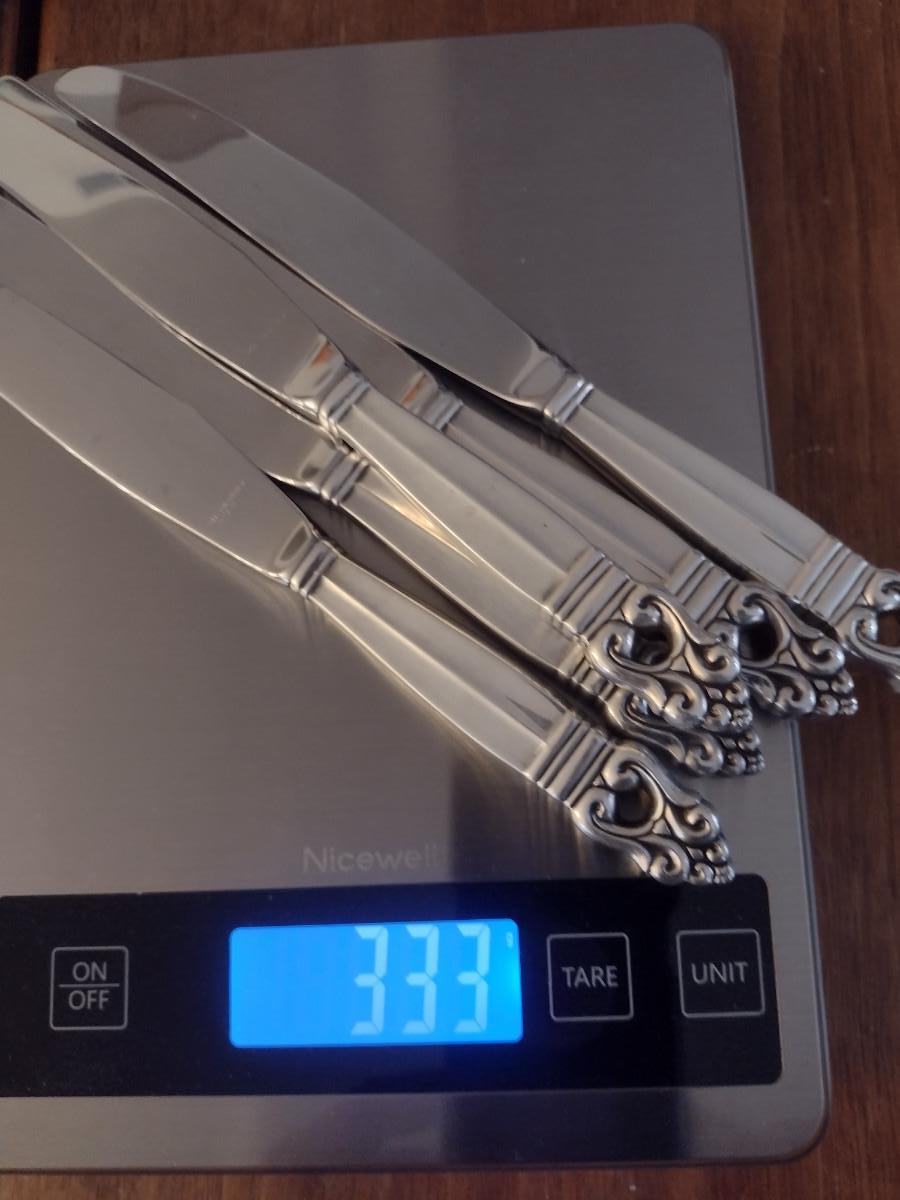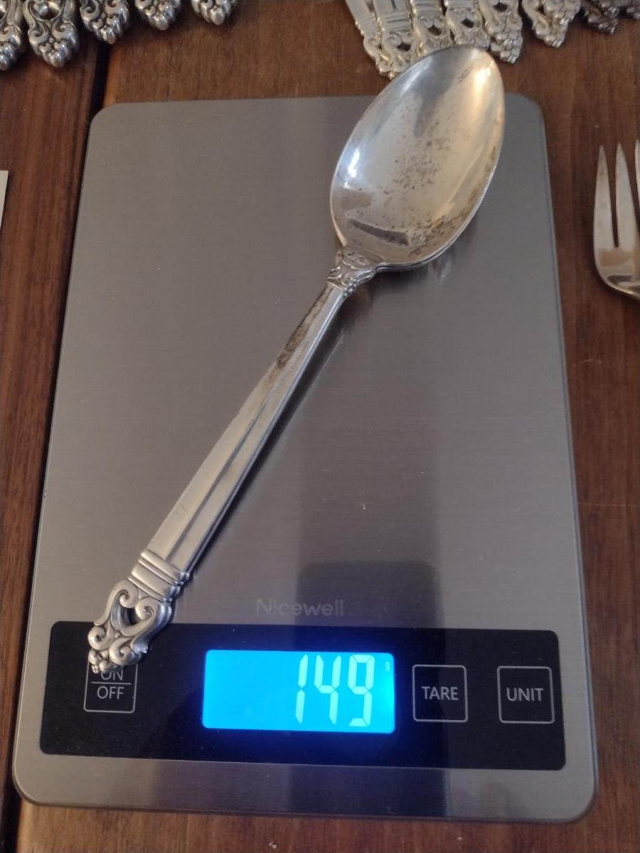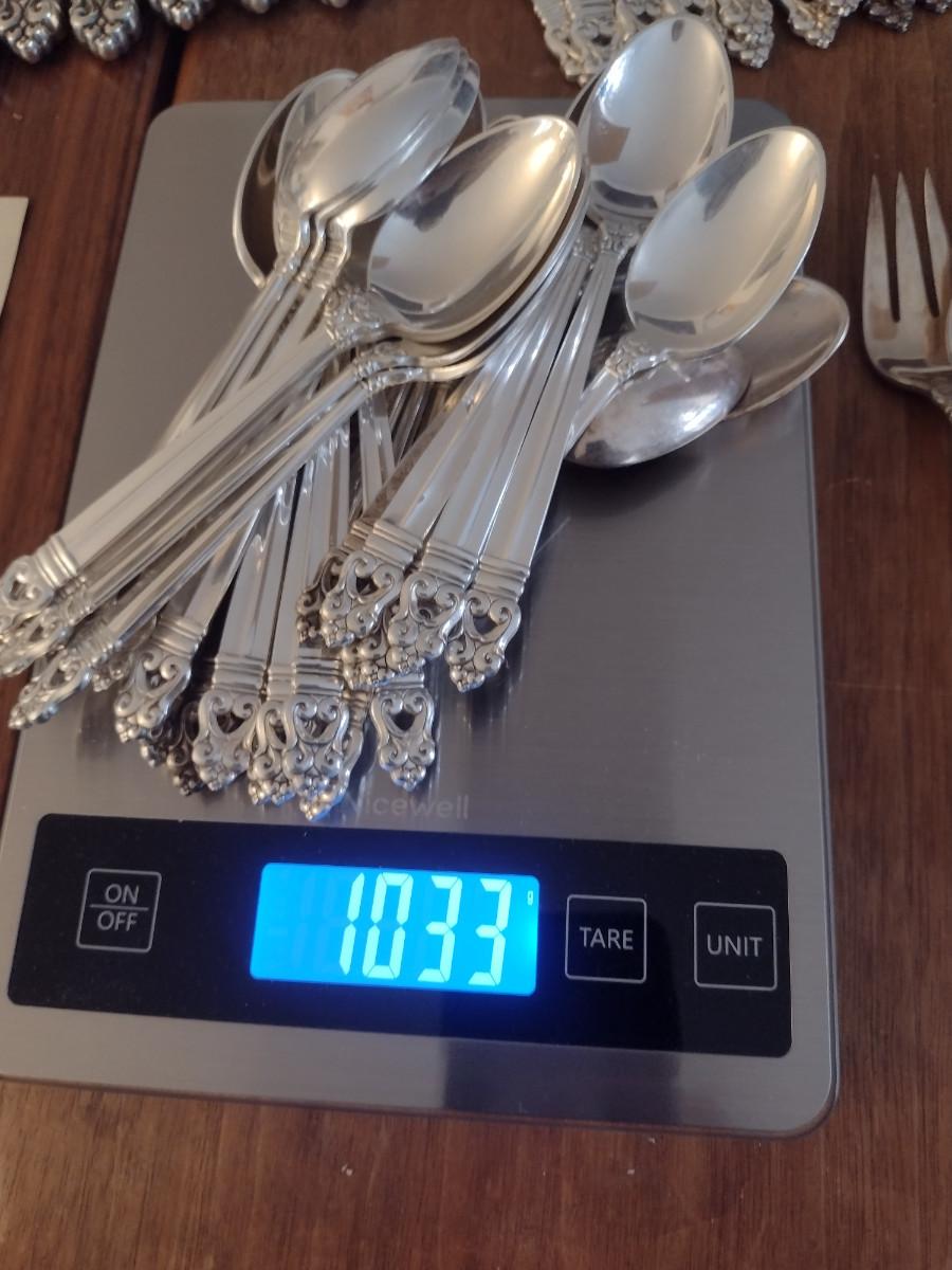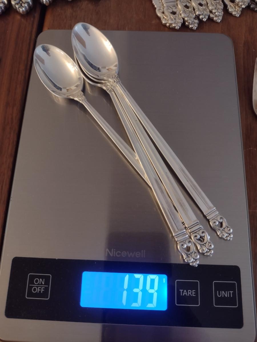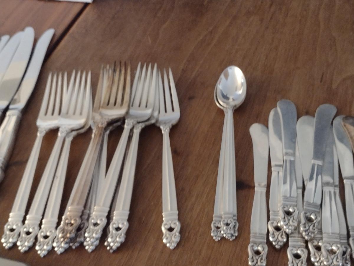Royal Danish International Sterling Silver Flatware- Approx 104 Pieces and Total Weight 3,944 Grams. Pieces included: dinner knife- 11, luncheon knife- 5, dinner fork- 12, luncheon fork- 4, salad fork- 12, cocktail fork- 5, regular place spoon- 26, long iced tea spoon- 4, soup spoon- 2, butter spreader- 12, large vegetable serving spoon- 2, medium meat serving fork- 1, pie server- 1, cheese server- 1, cream ladle- 1, gravy ladle- 1, tomato server- 1, sugar spoon- 1, baby spoon- 1, jelly server spoon- 1. Total weight shown does not include dinner knives, luncheon knives, pie server, or cheese server because they have stainless steel blades. Items are in used, vintage condition and some have discoloration/tarnish.