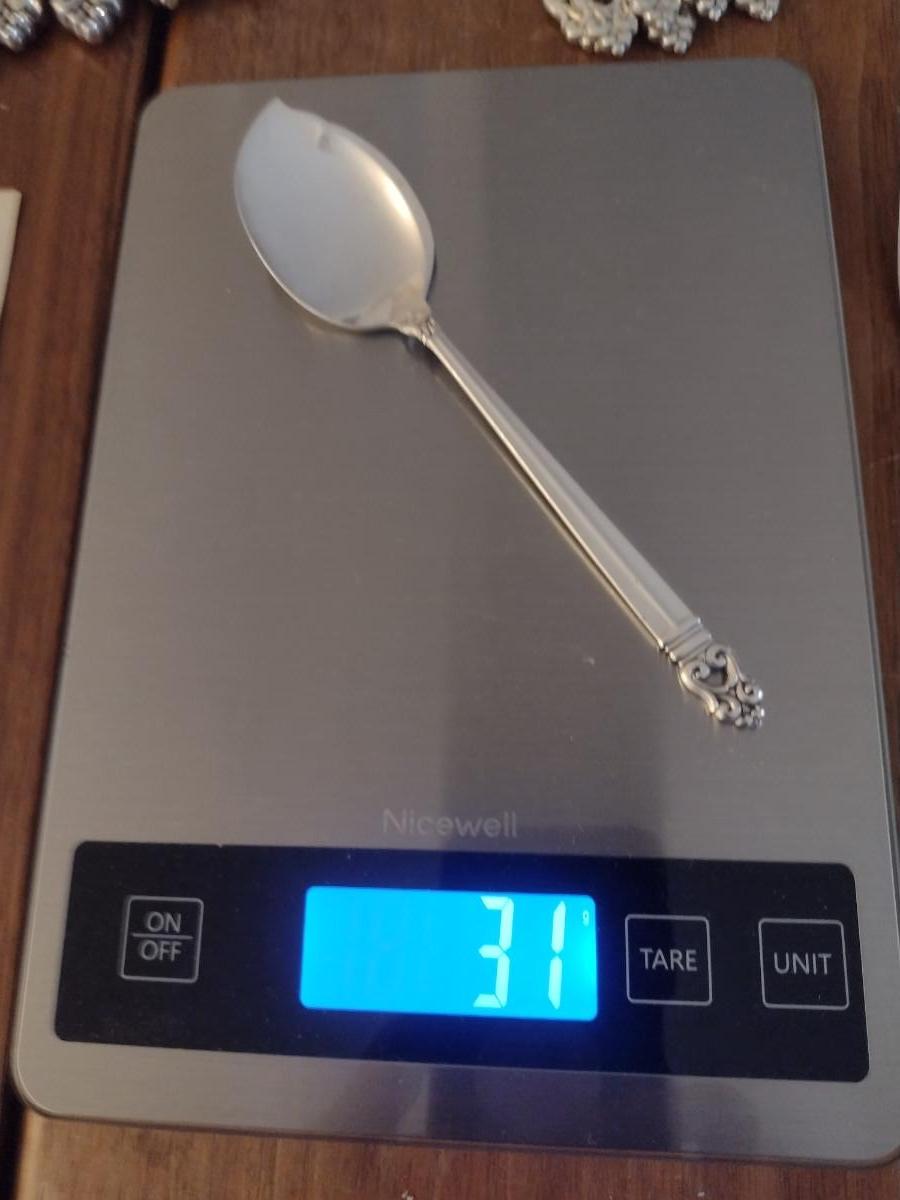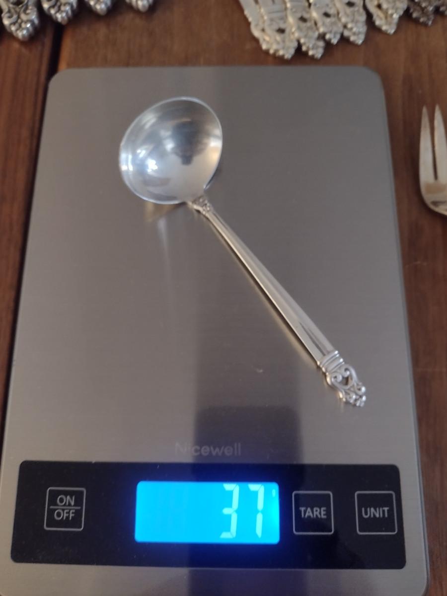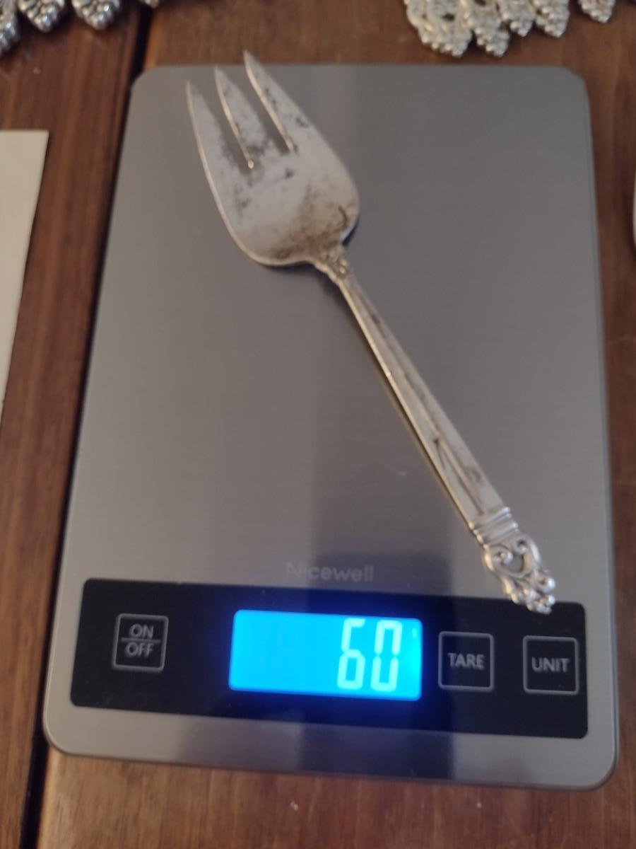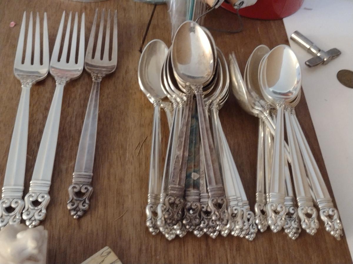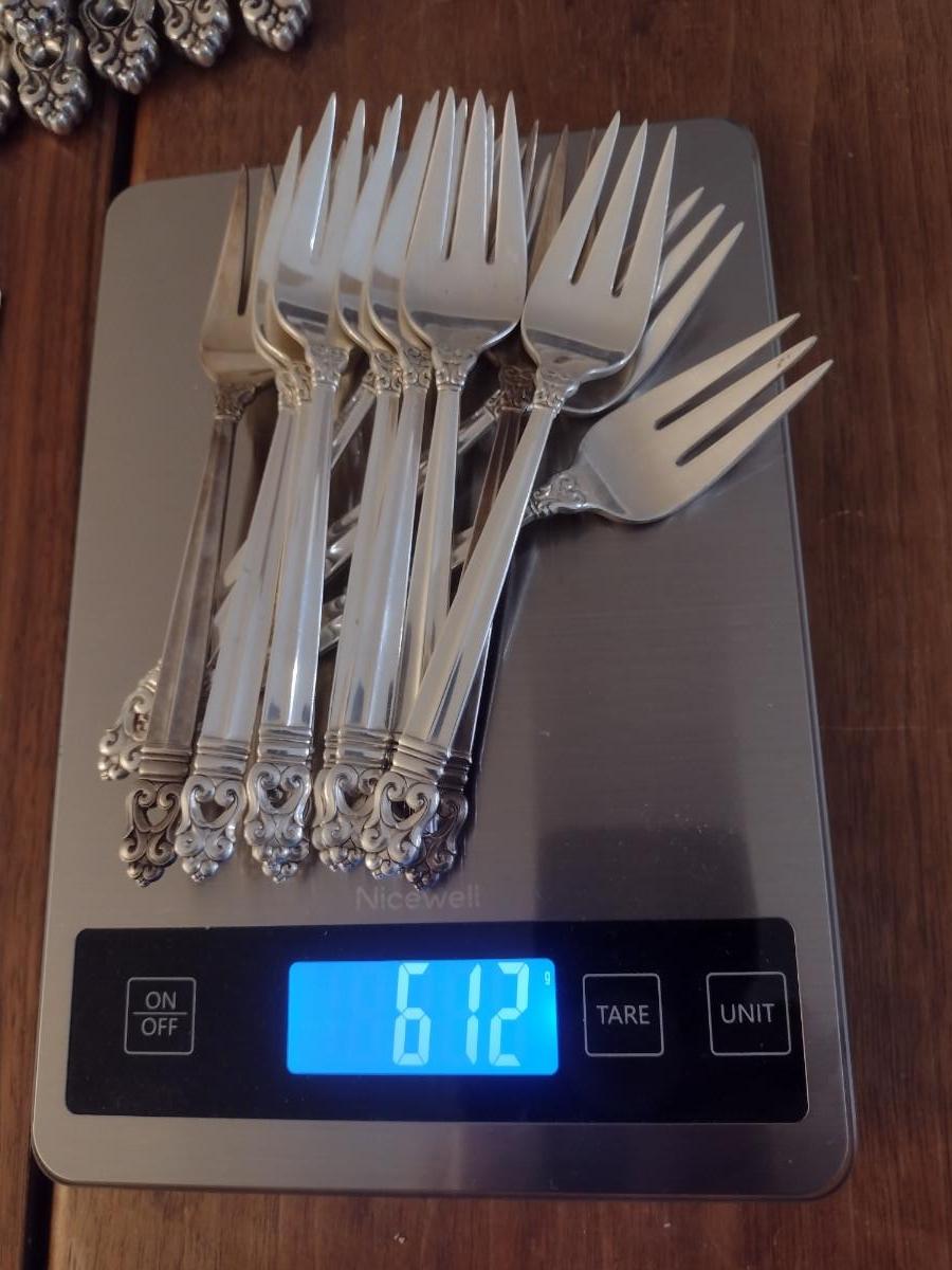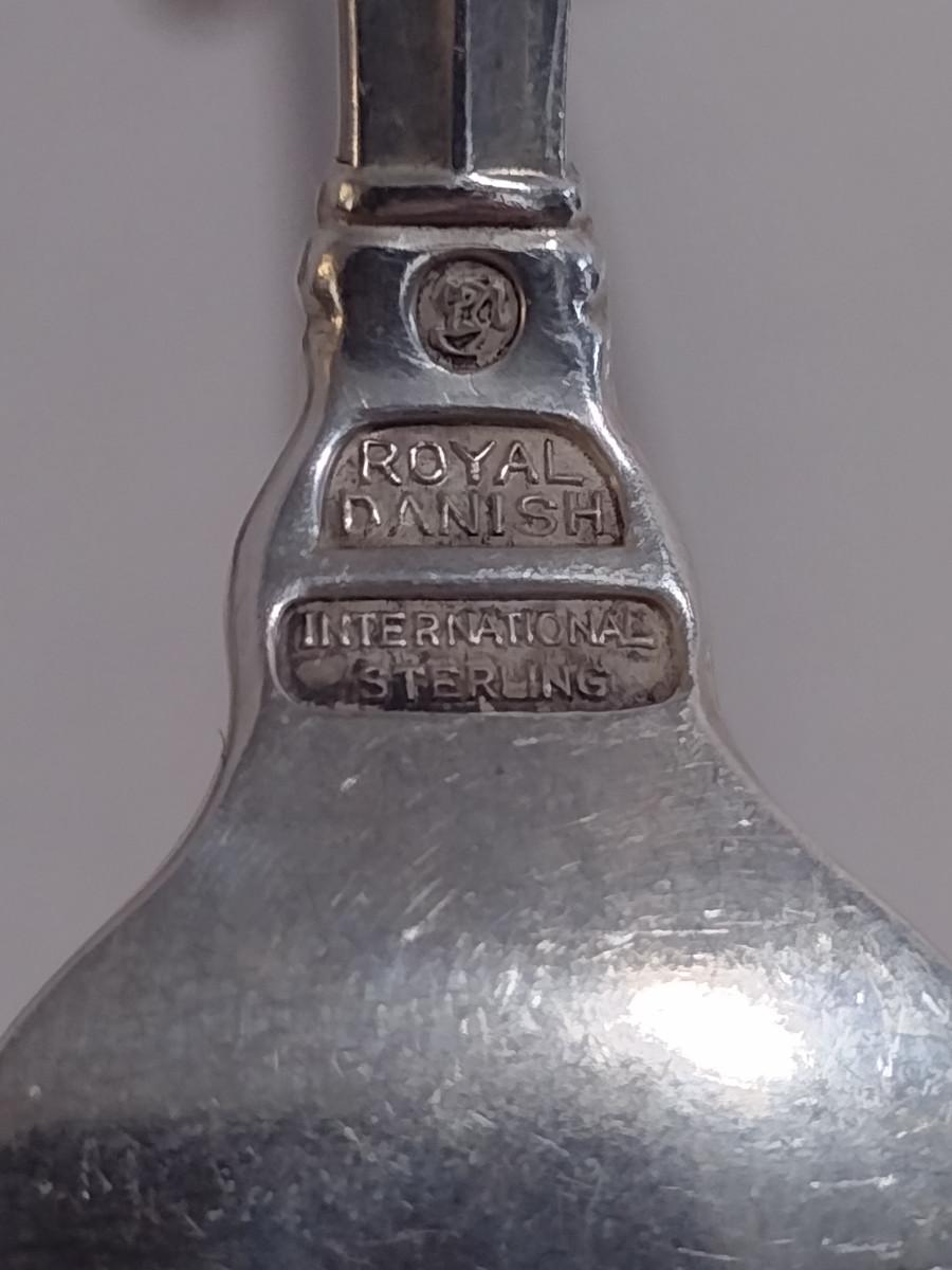 Royal Danish International Sterling Silver Flatware- Approx 104 Pieces and Total Weight 3,944 Grams. Pieces included: dinner knife- 11, luncheon knife- 5, dinner fork- 12, luncheon fork- 4, salad fork- 12, cocktail fork- 5, regular place spoon- 26, long iced tea spoon- 4, soup spoon- 2, butter spreader- 12, large vegetable serving spoon- 2, medium meat serving fork- 1, pie server- 1, cheese server- 1, cream ladle- 1, gravy ladle- 1, tomato server- 1, sugar spoon- 1, baby spoon- 1, jelly server spoon- 1. Total weight shown does not include dinner knives, luncheon knives, pie server, or cheese server because they have stainless steel blades. Items are in used, vintage condition and some have discoloration/tarnish.