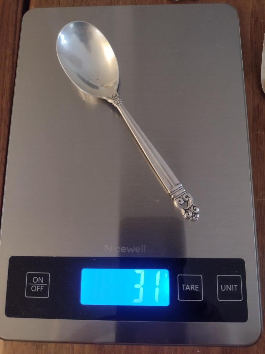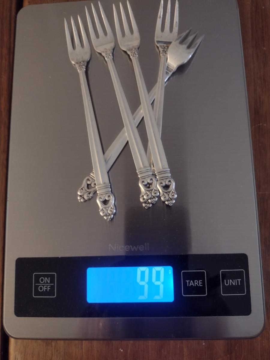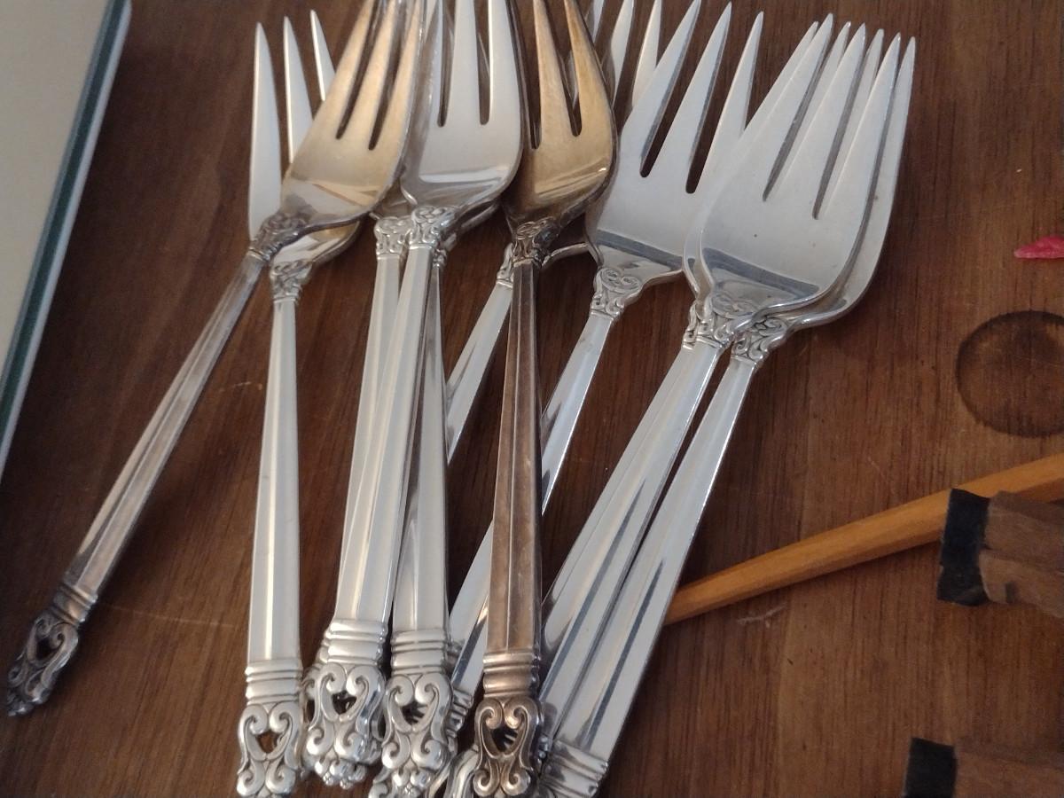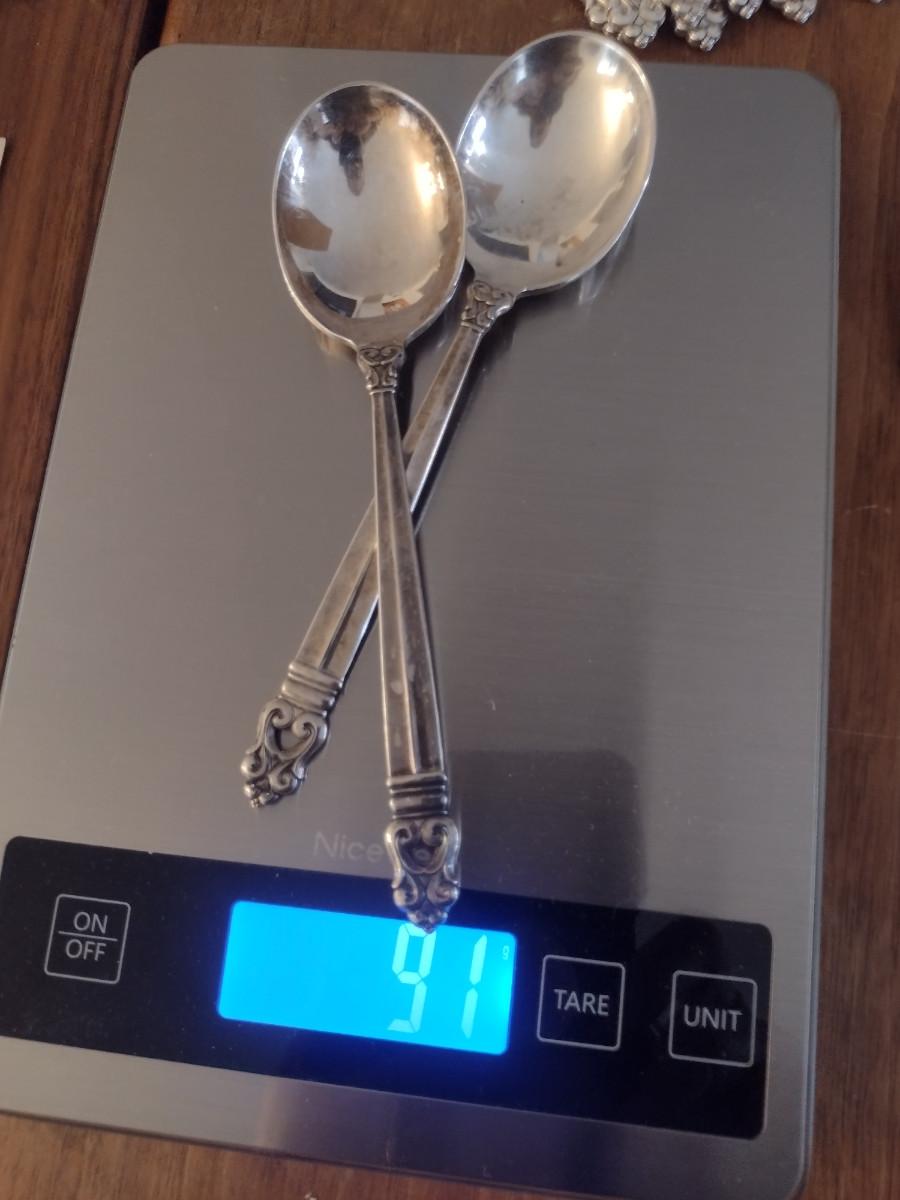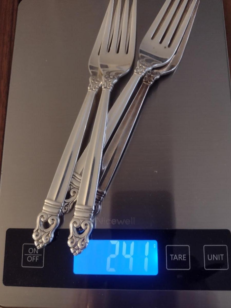 Royal Danish International Sterling Silver Flatware- Approx 104 Pieces and Total Weight 3,944 Grams. Pieces included: dinner knife- 11, luncheon knife- 5, dinner fork- 12, luncheon fork- 4, salad fork- 12, cocktail fork- 5, regular place spoon- 26, long iced tea spoon- 4, soup spoon- 2, butter spreader- 12, large vegetable serving spoon- 2, medium meat serving fork- 1, pie server- 1, cheese server- 1, cream ladle- 1, gravy ladle- 1, tomato server- 1, sugar spoon- 1, baby spoon- 1, jelly server spoon- 1. Total weight shown does not include dinner knives, luncheon knives, pie server, or cheese server because they have stainless steel blades. Items are in used, vintage condition and some have discoloration/tarnish.