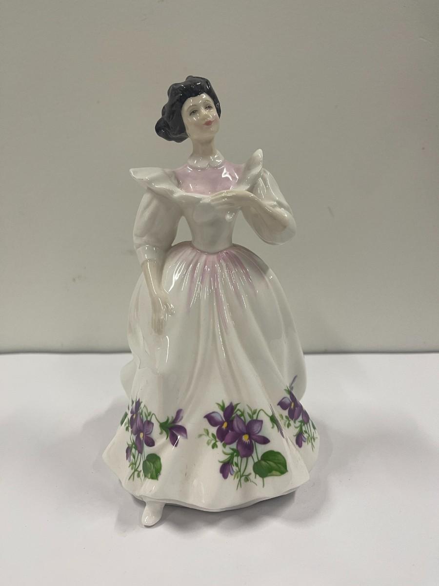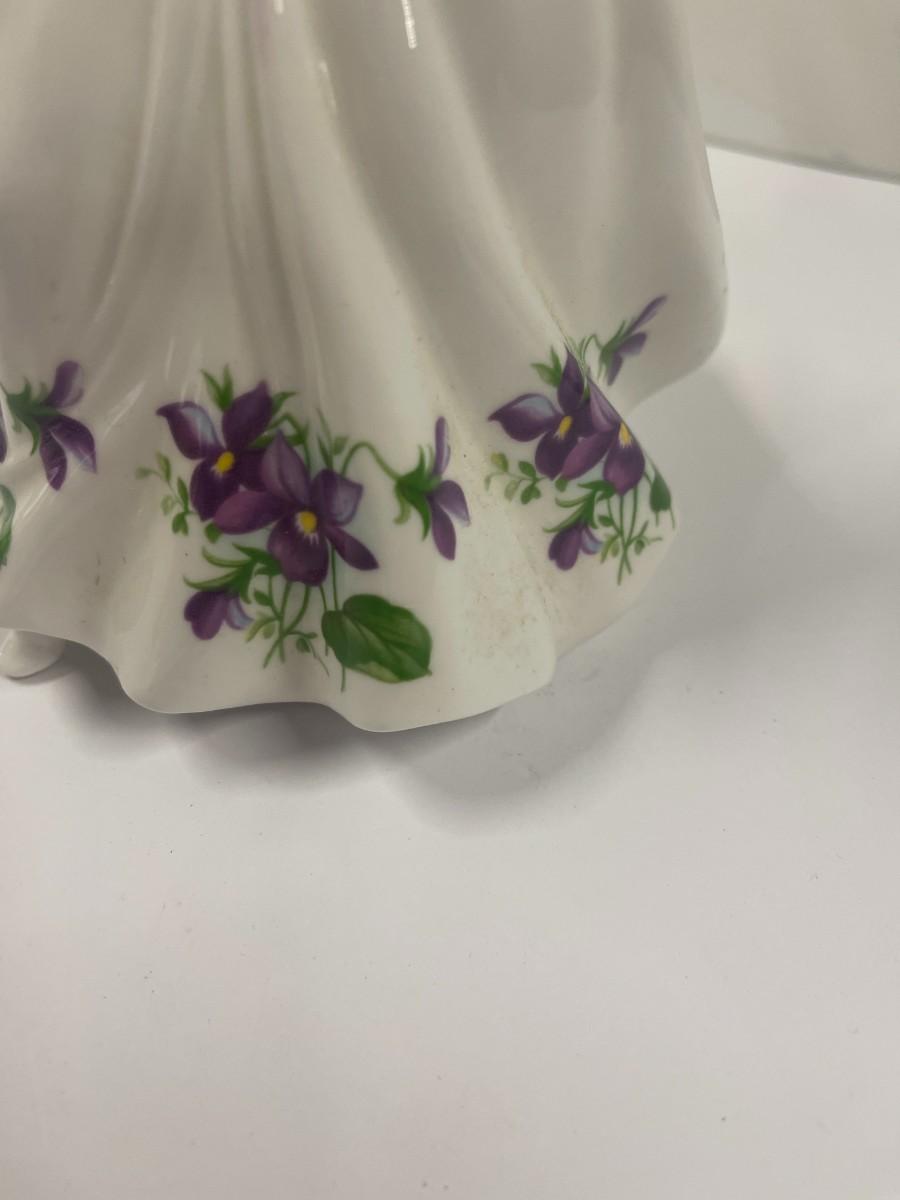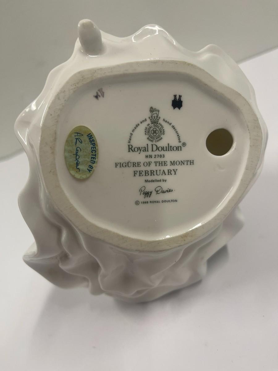 Royal Doulton figure of the month figurine by Peggy Davies. Released in 1988, this is February's figurine. She is in excellent condition, but there is one small part on the very top of her head that has a white spot, looks like the finish is worn off there. Please examine the photos carefully. # 1106