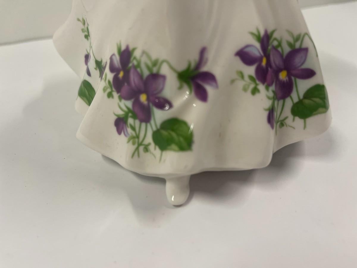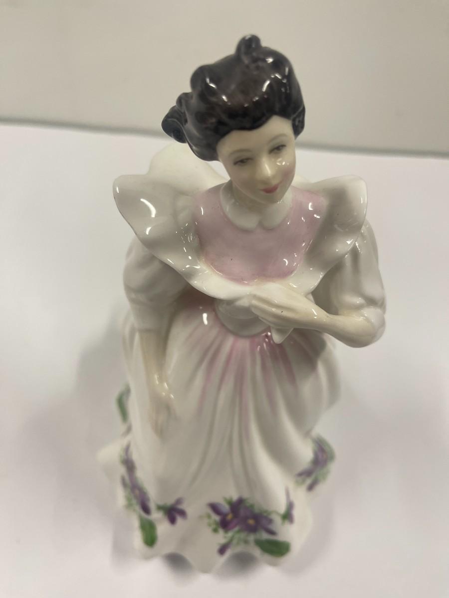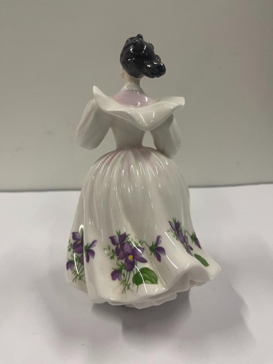 Royal Doulton figure of the month figurine by Peggy Davies. Released in 1988, this is February's figurine. She is in excellent condition, but there is one small part on the very top of her head that has a white spot, looks like the finish is worn off there. Please examine the photos carefully. # 1106