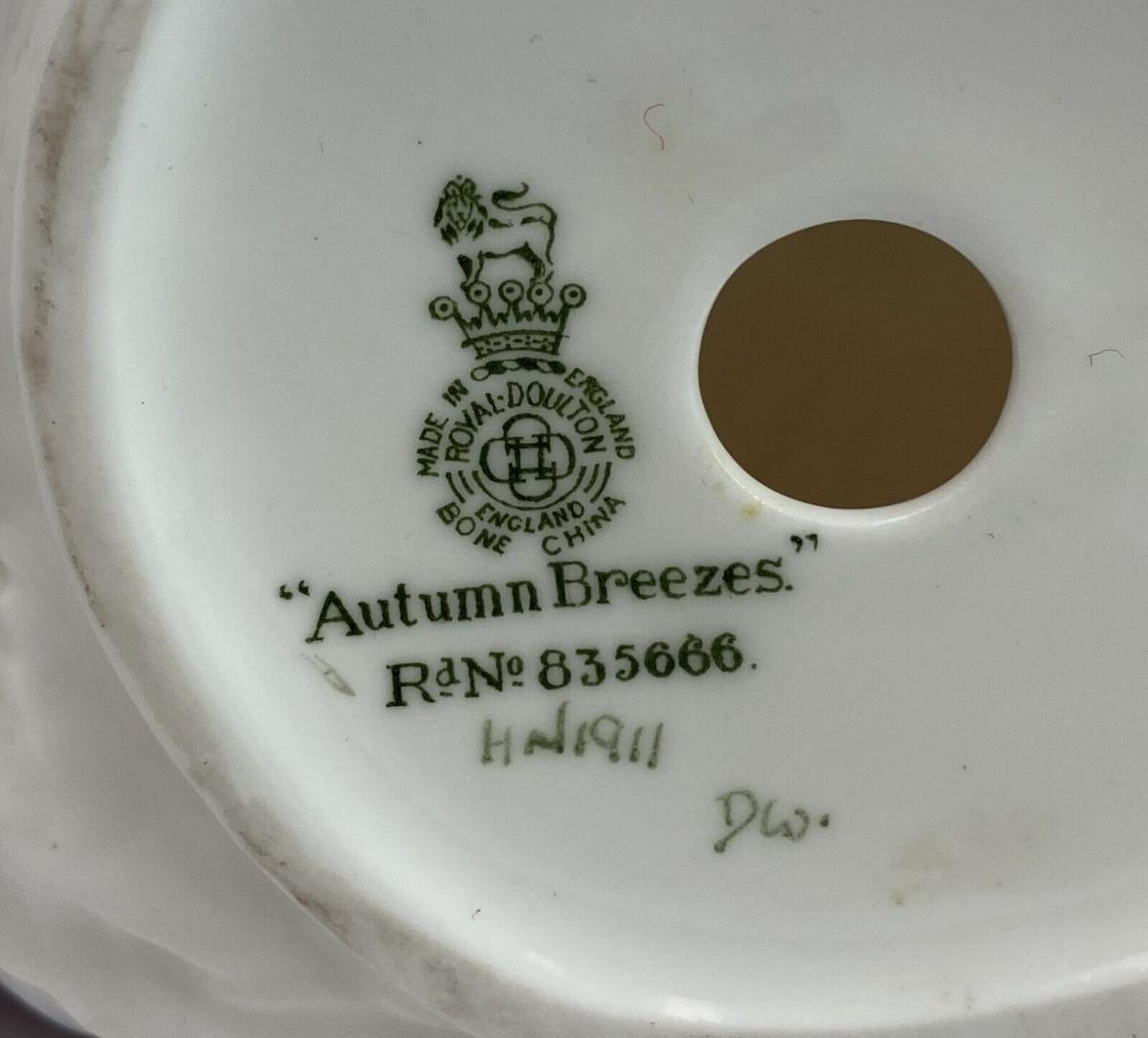 Excellent condition on this estate figurine..hand made bone china "Autumn Breezes" HN 1911 from Royal Doulton in England..Designed by Leslie Harradine and issued between 1939 and 1976...She stands 7 1/2" tall...Artist monogram DW....