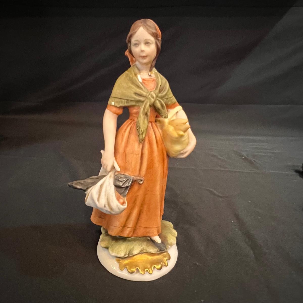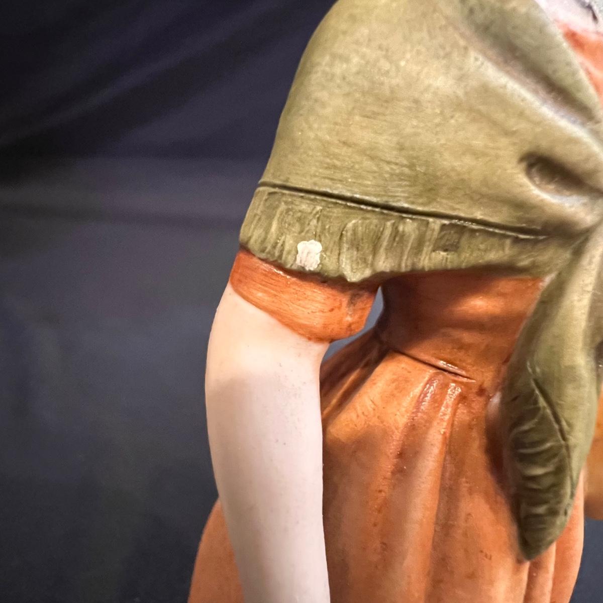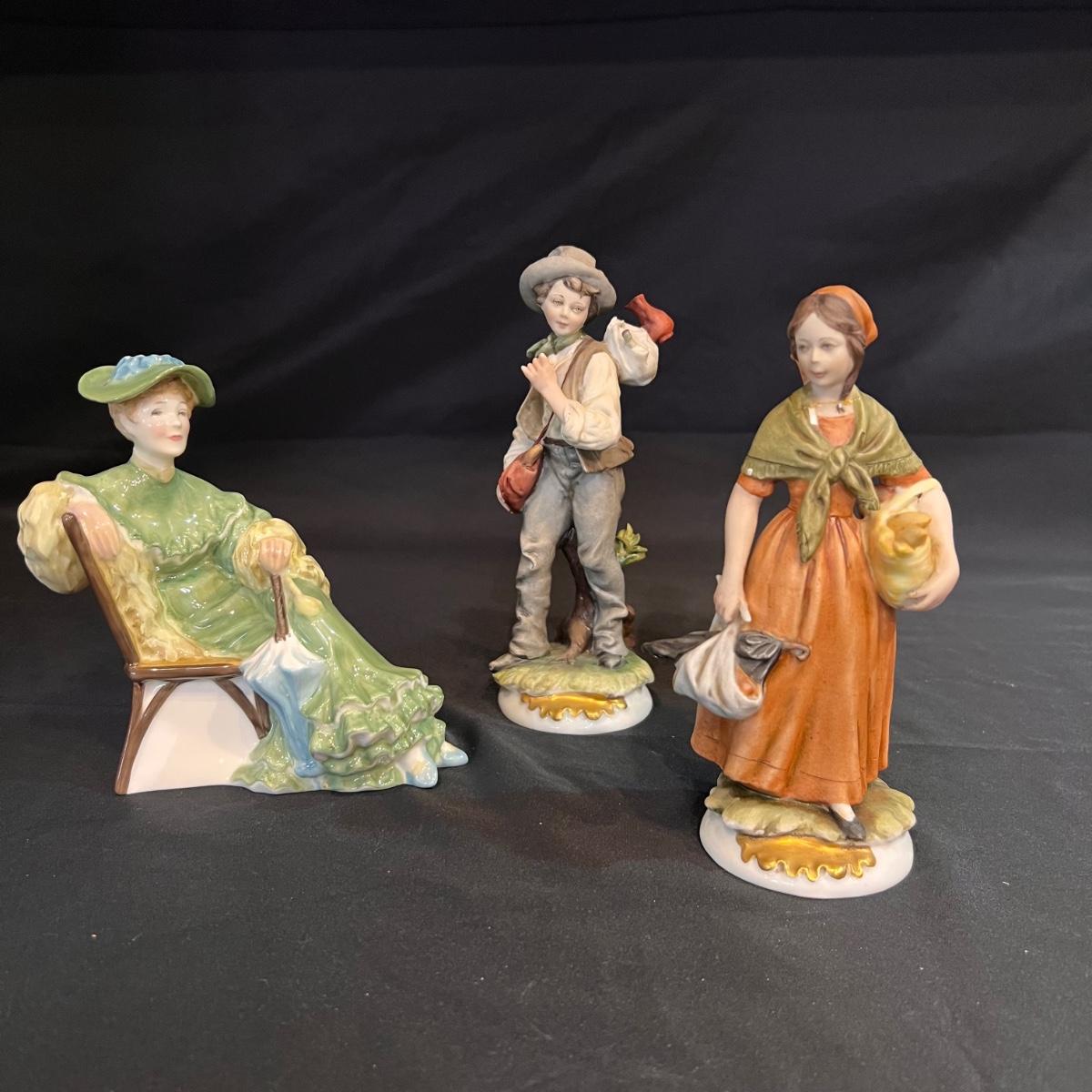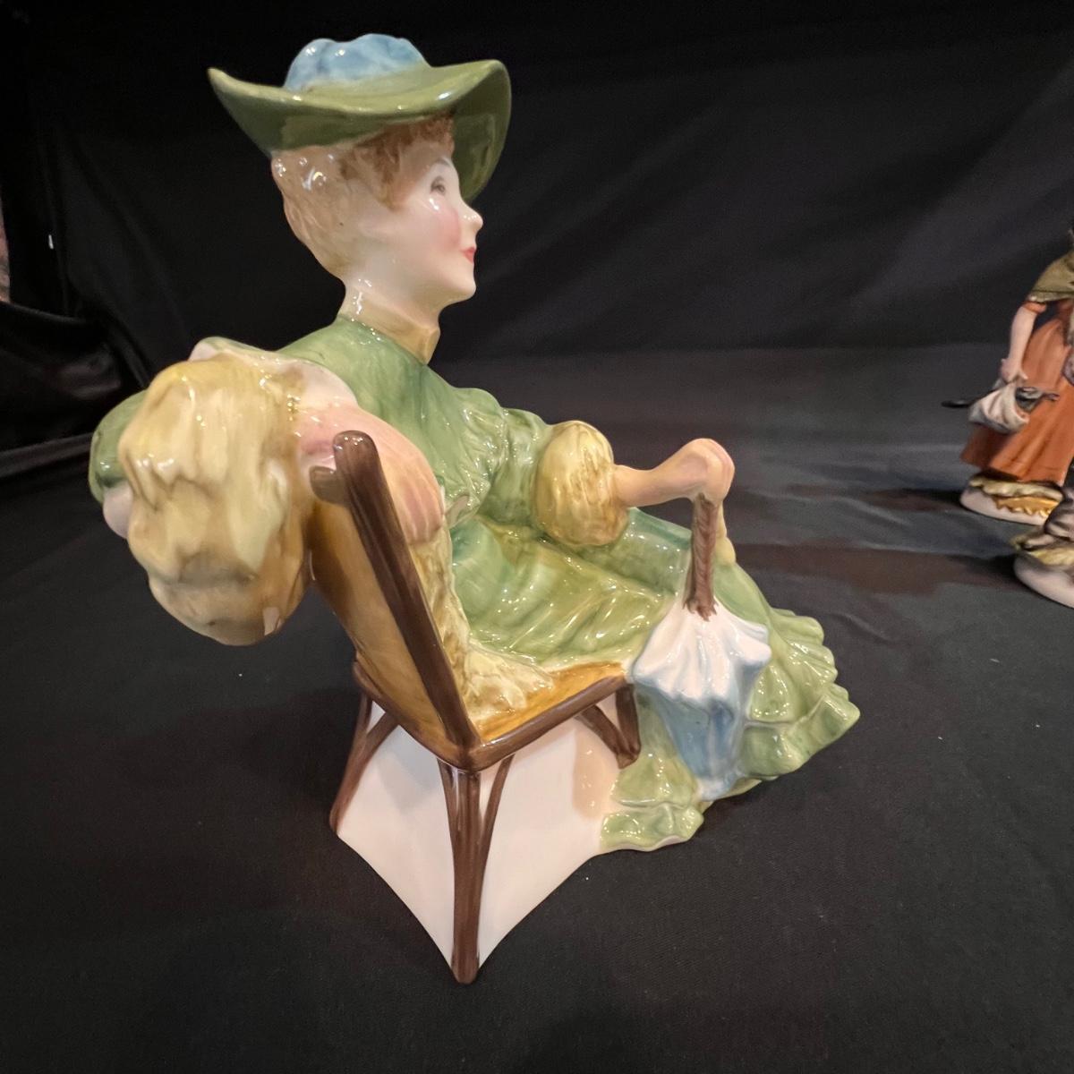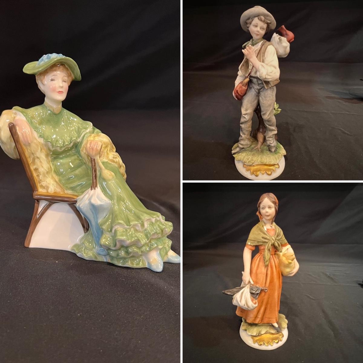 Three porcelain figurines in this lot. Includes a Royal Doulton ‘Ascot’ elegant lady sitting on a chair and a pair of B.Merli figurines. Note the tiny blemish on the shawl of the girl.