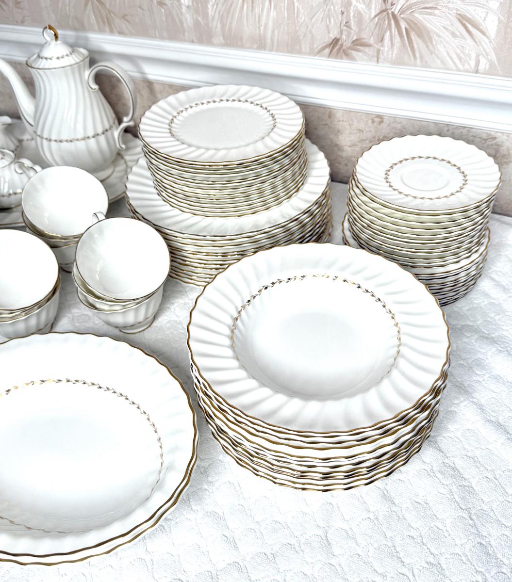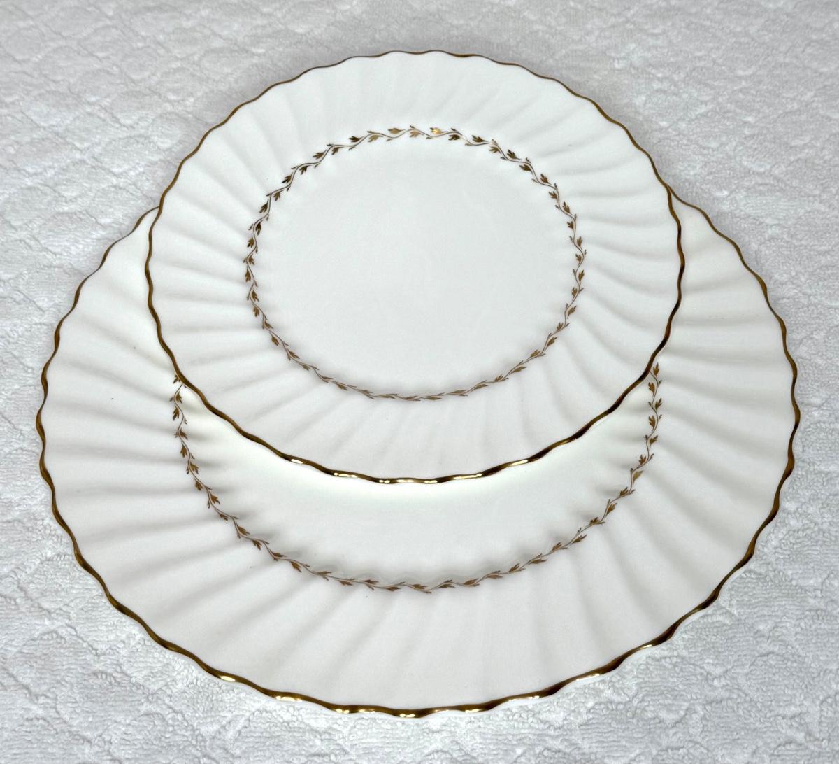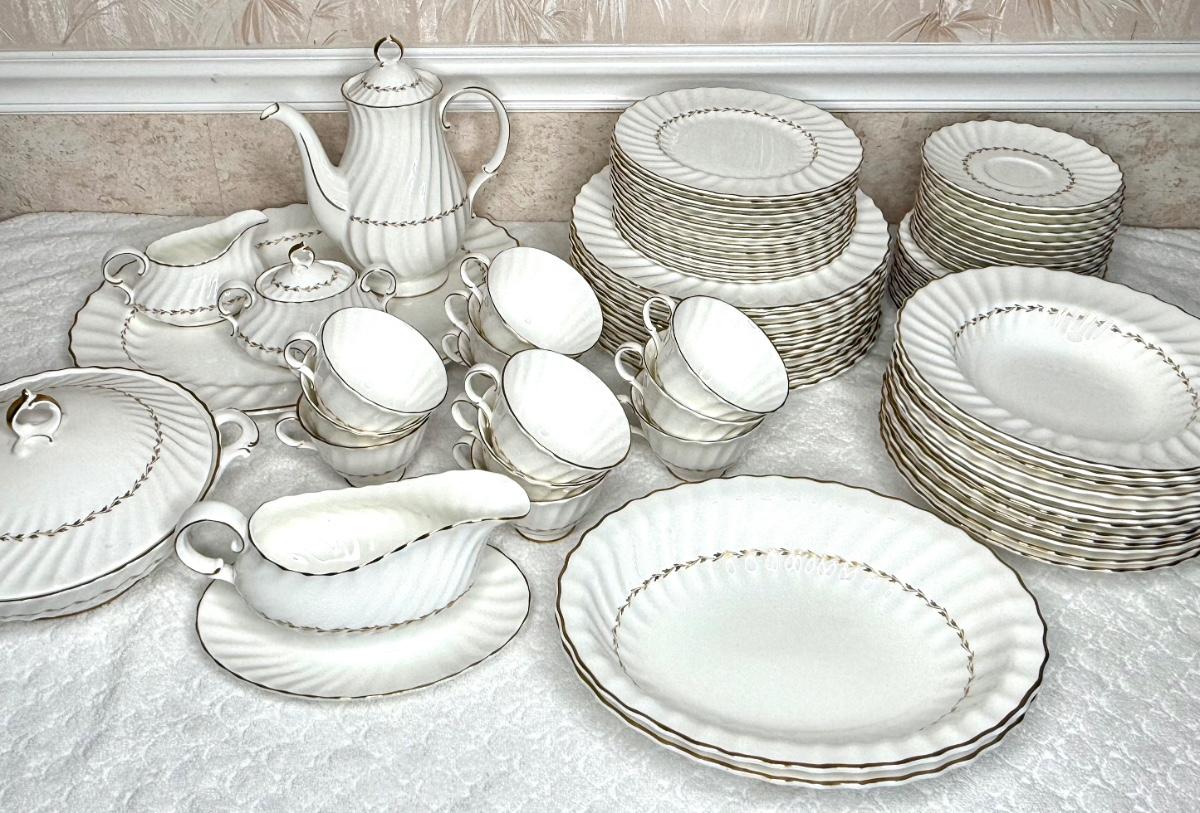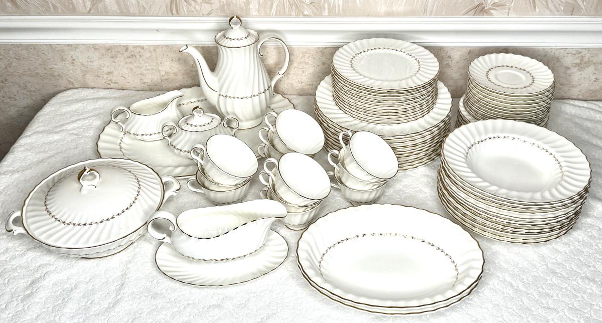 11 dessert plates (beneath saucers. 12 saucers. 13 Salad plates. 12 dinner plates. 12 soup bowls.