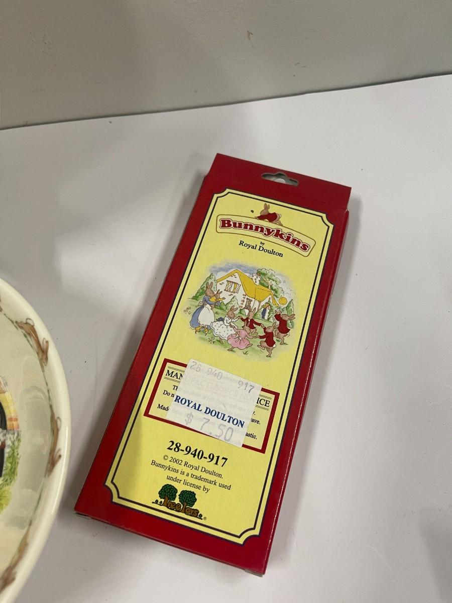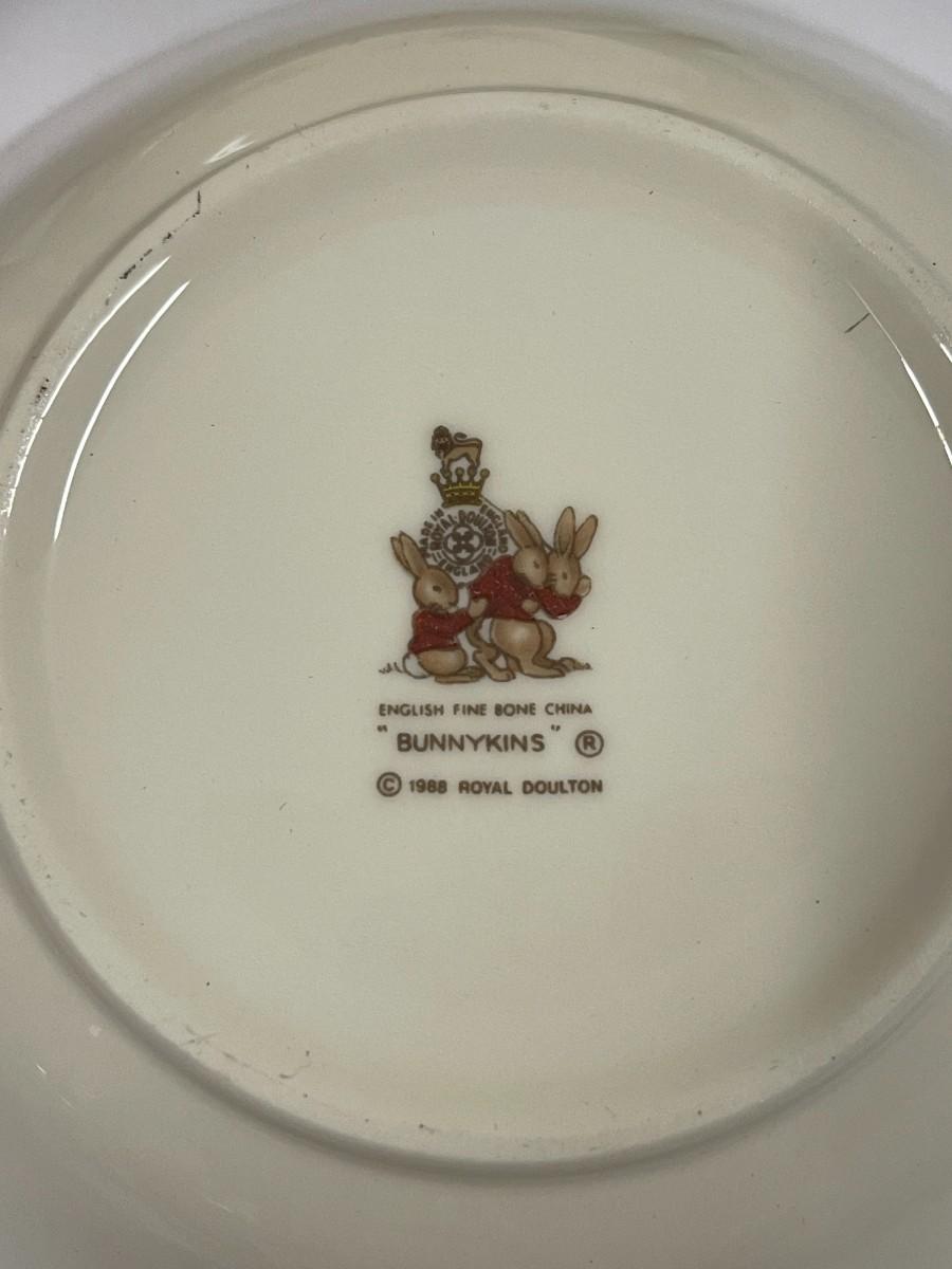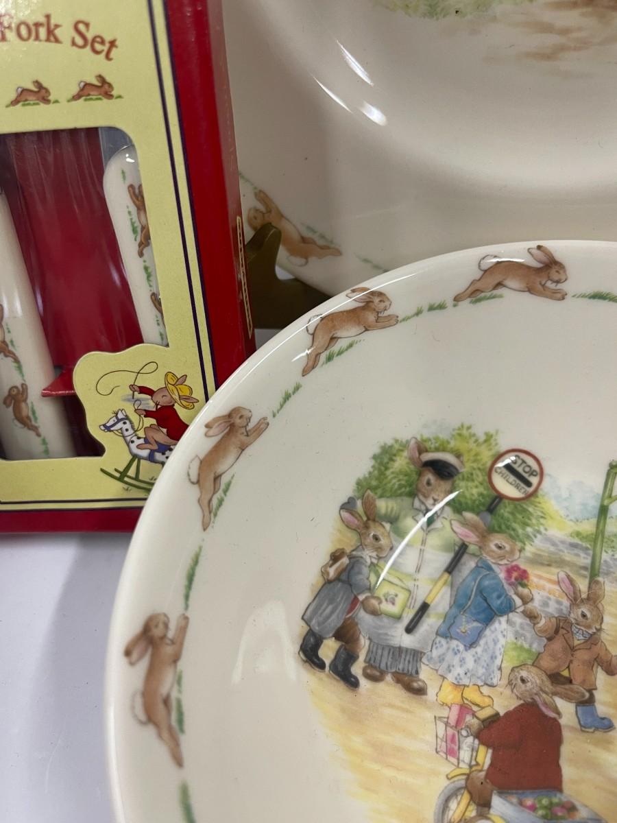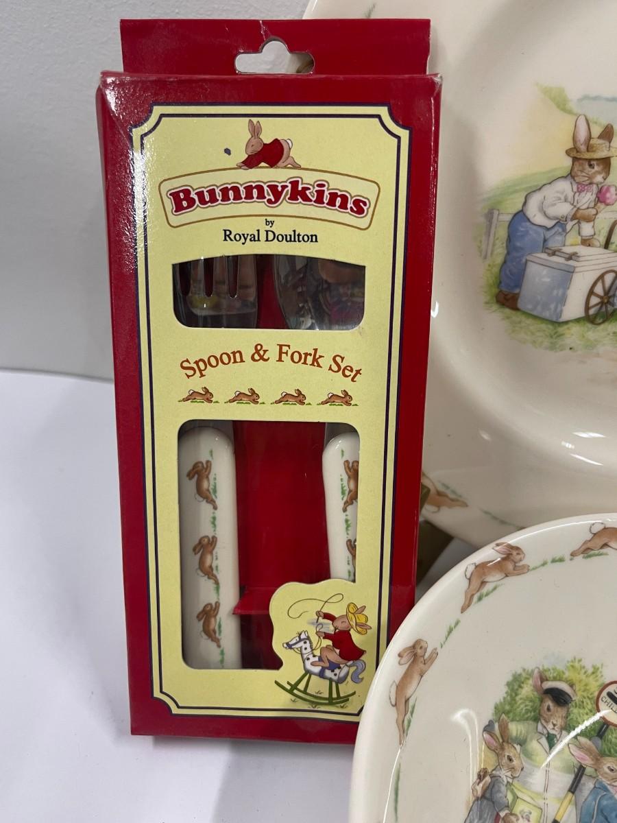 Royal Doulton English bone china Bunnykins children's dish set with coordinating fork and spoon set. Excellent condition. Includes 8" plate, 6" bowl and coordinating fork & spoon. China set does not have box. # 1159