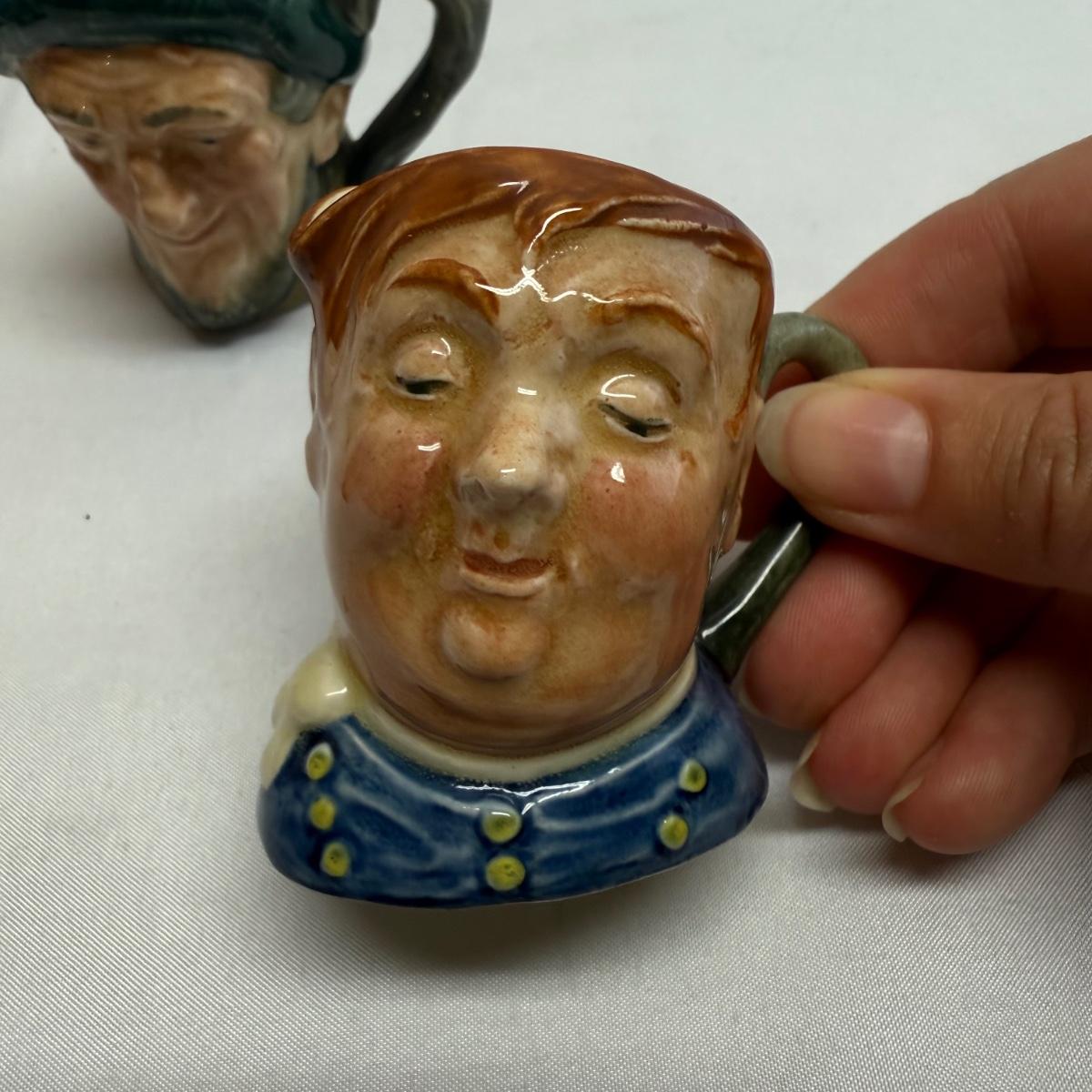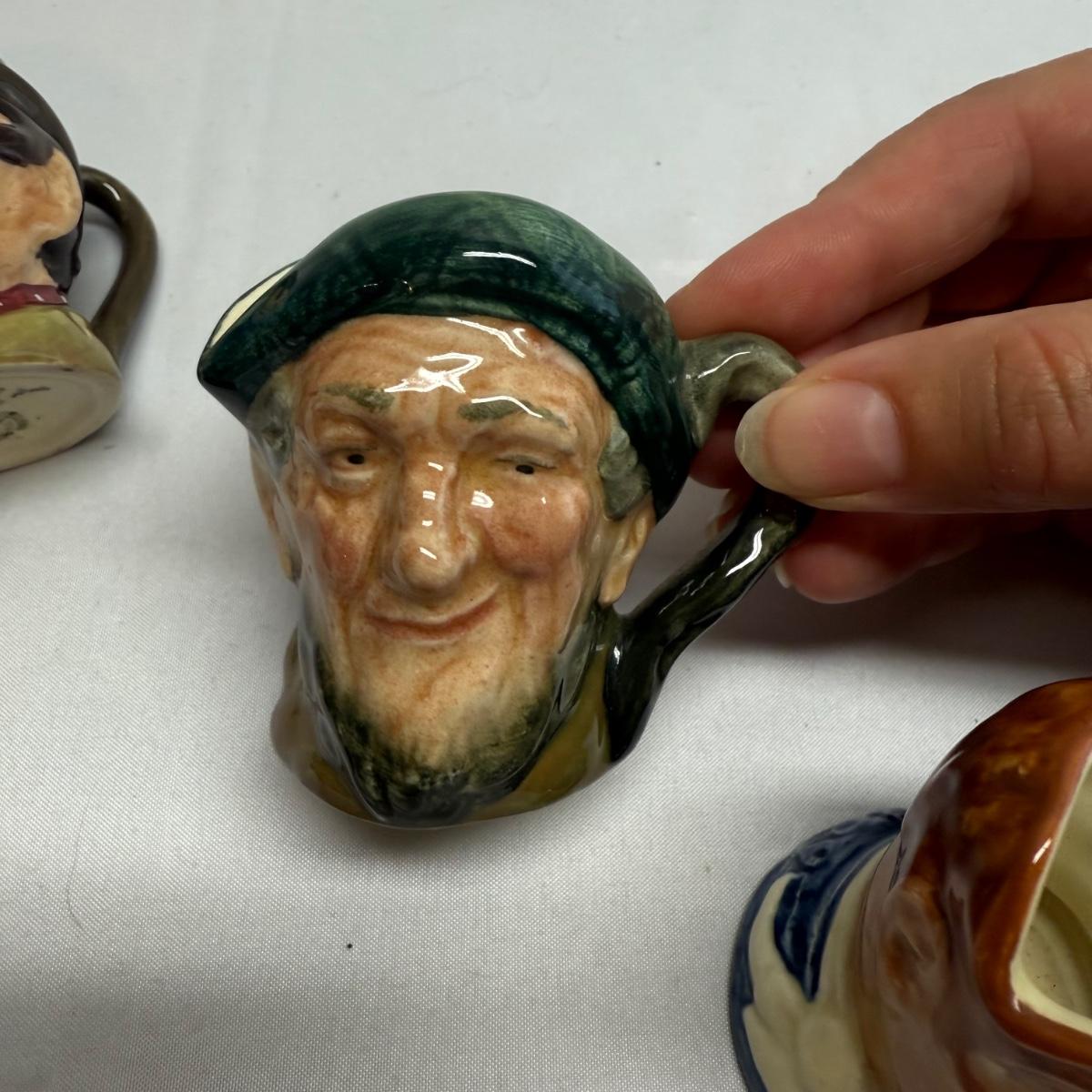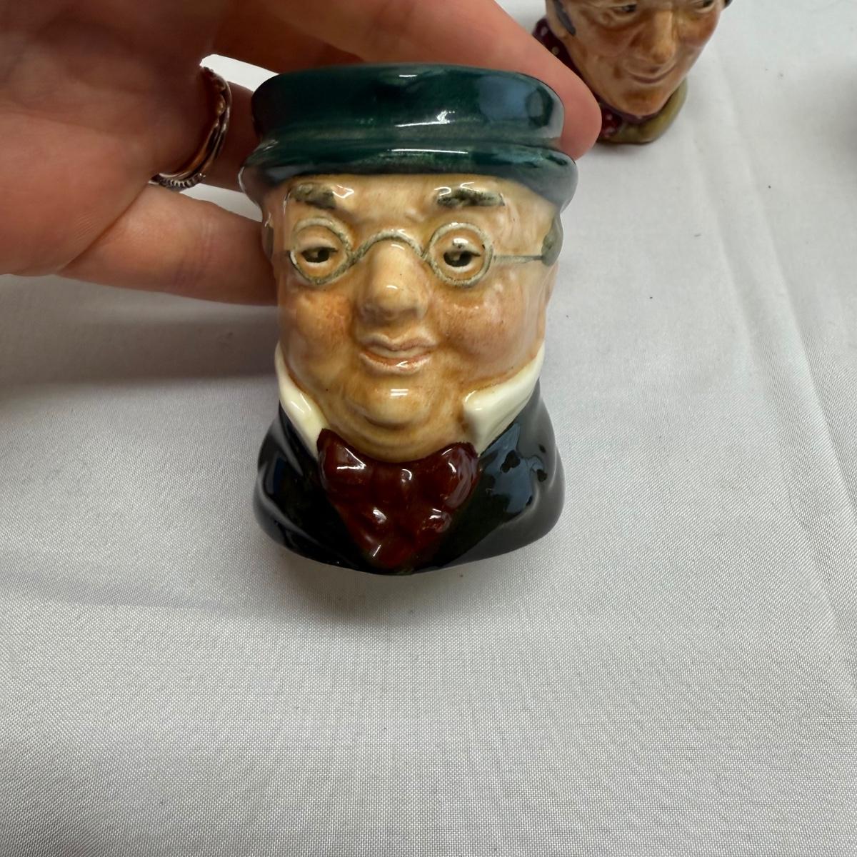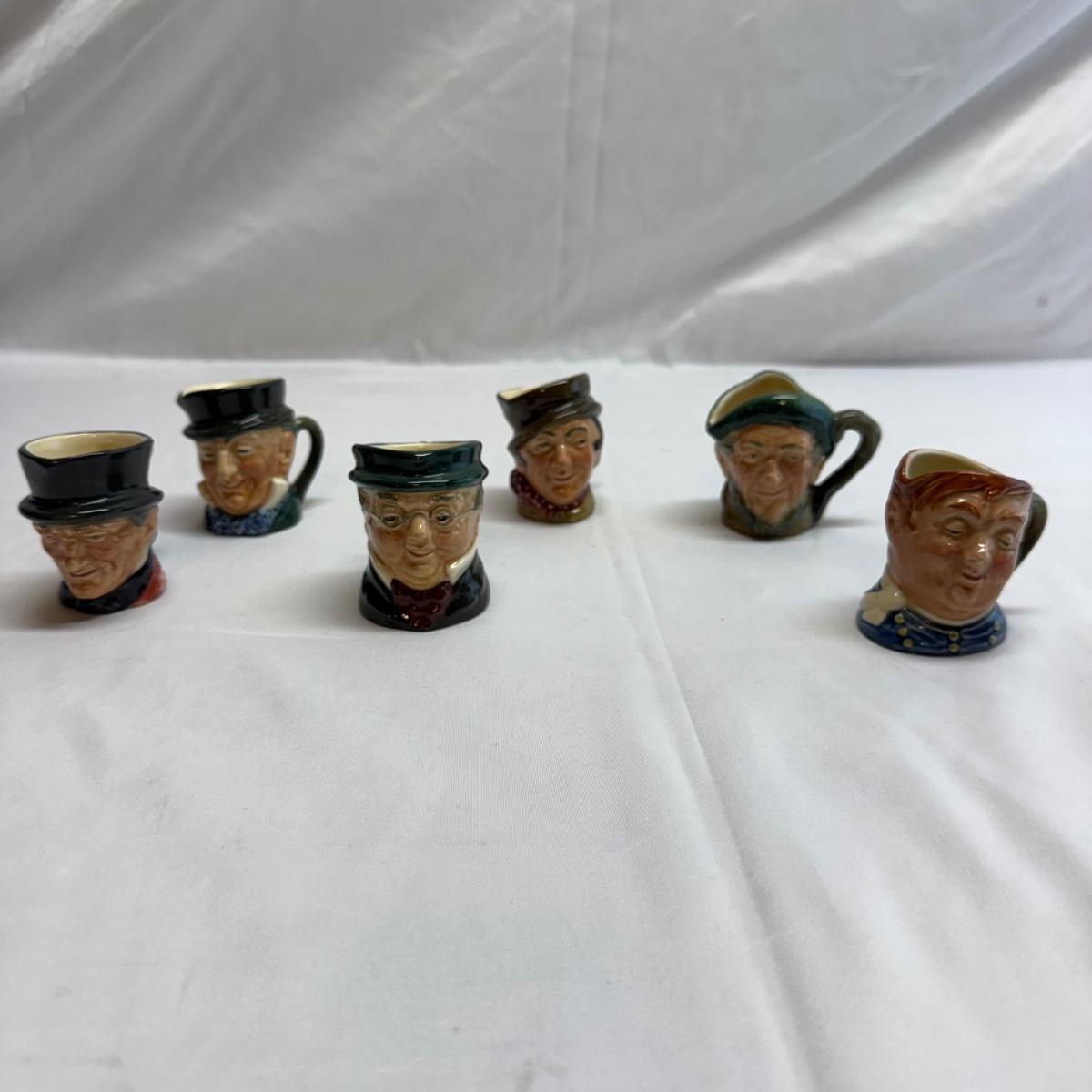 This lot contains six precious Royal Doulton miniature character jugs. The gentleman with the glasses measures 1.75” x 2.5” x 2.5”H. See pictures for details. Shipping available.