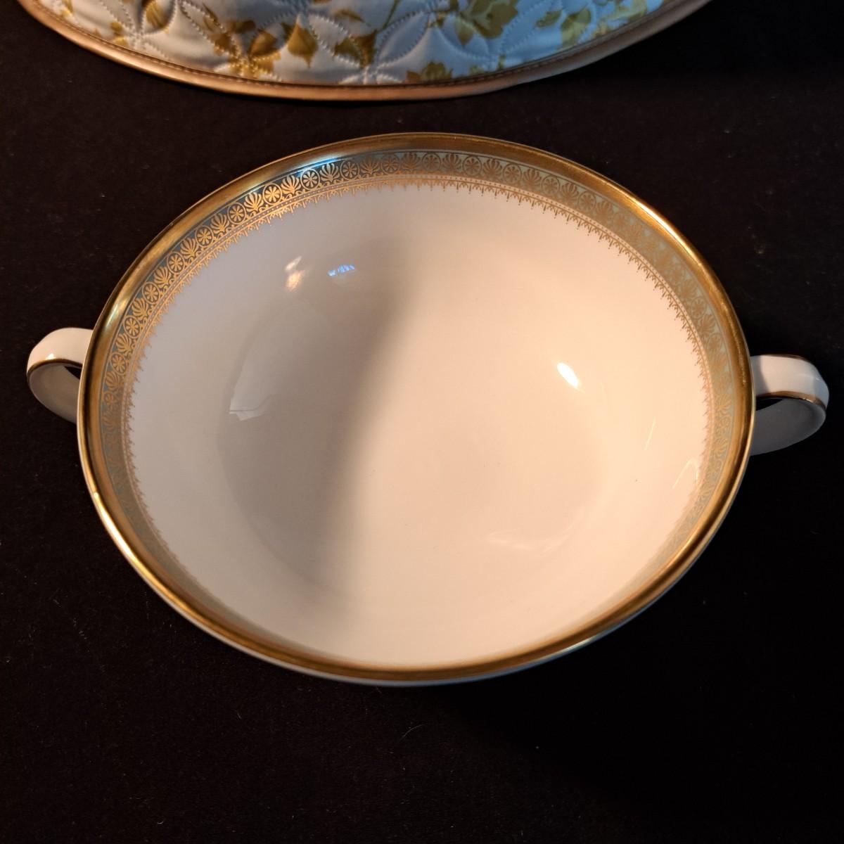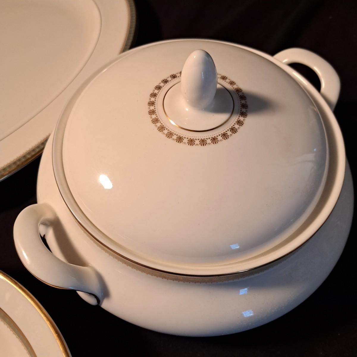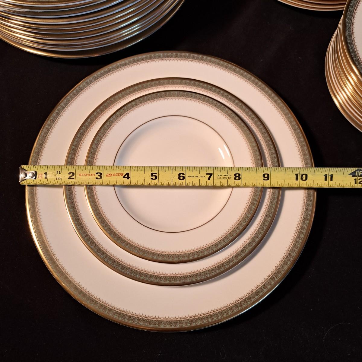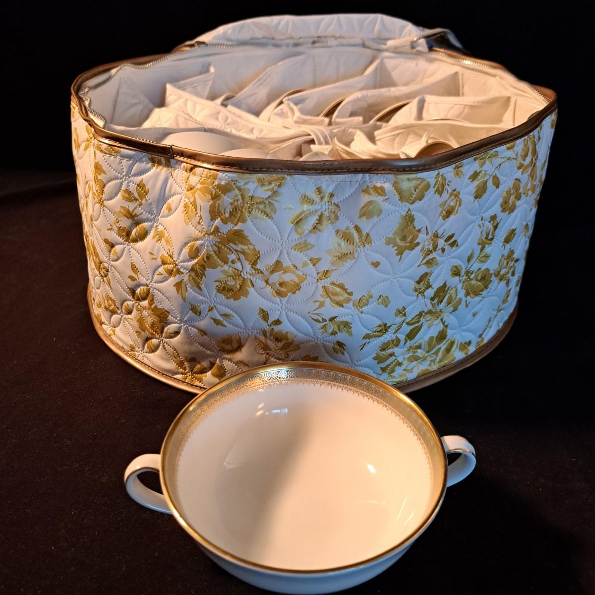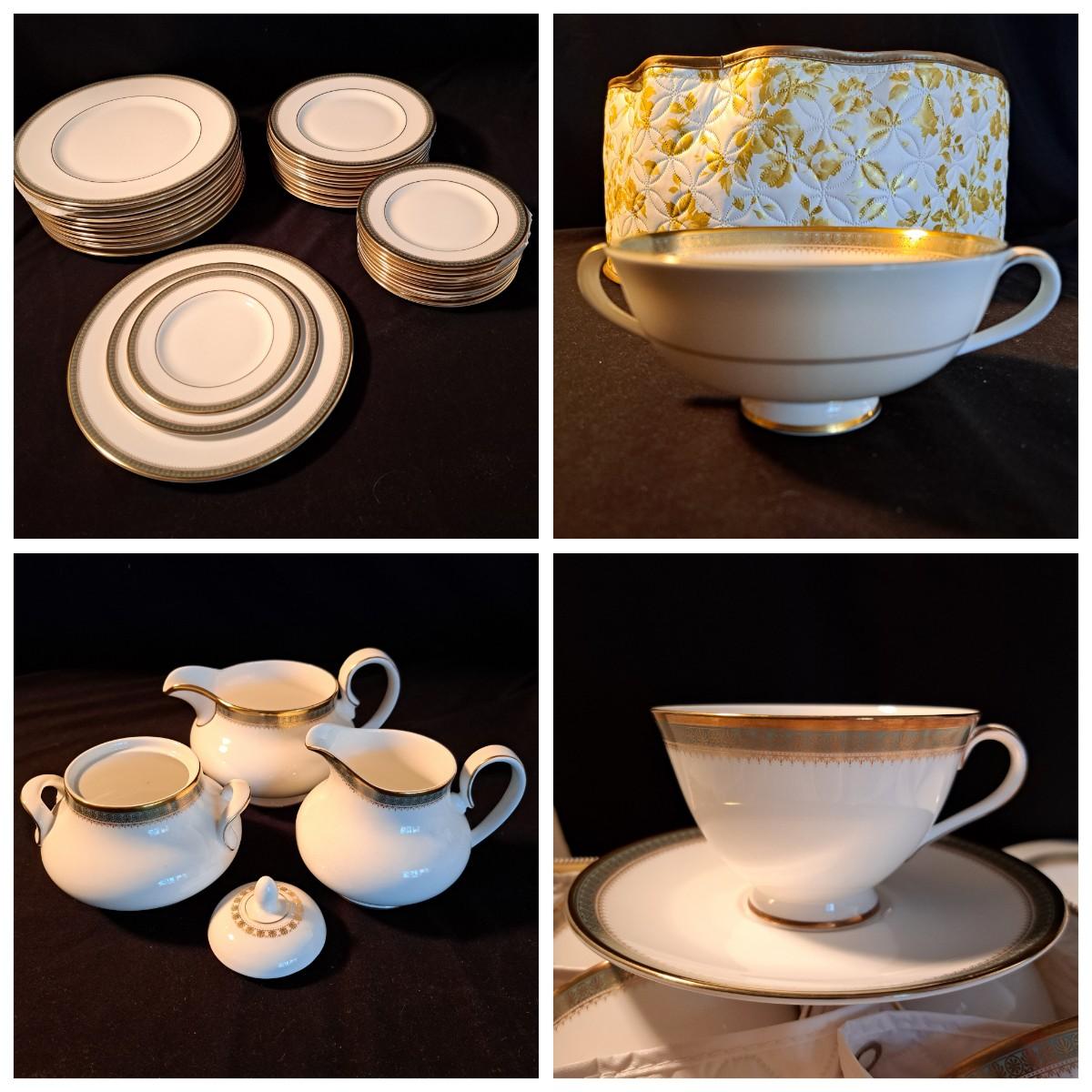 Lovely, well-cared for Royal Doulton 'Clarendon' china setting for 12, each piece rimmed with a gilt gold and turquoise filigree design. Includes extra saucers (*an additional 12) for teacups, 3 sizes of plates, two-handled soup bowls, large platter, lidded tureen, vegetable serving bowl, lidded sugar, creamer, gravy boat -- and more. See photos for measurements. Includes protective quilted care covers. Shipping available. Shipping can be costly. We suggest contacting our preferred local shipping provider, Postage Express, with dimensions and getting an estimate before bidding: (828) 255-9250 or shipping@postageexpressnc.com.