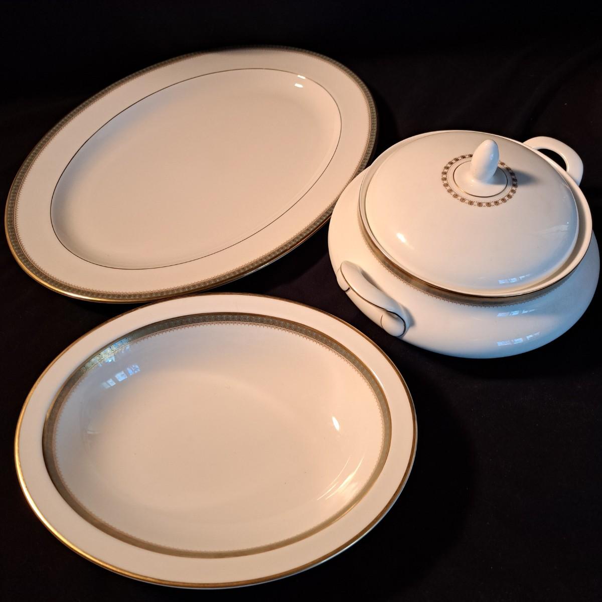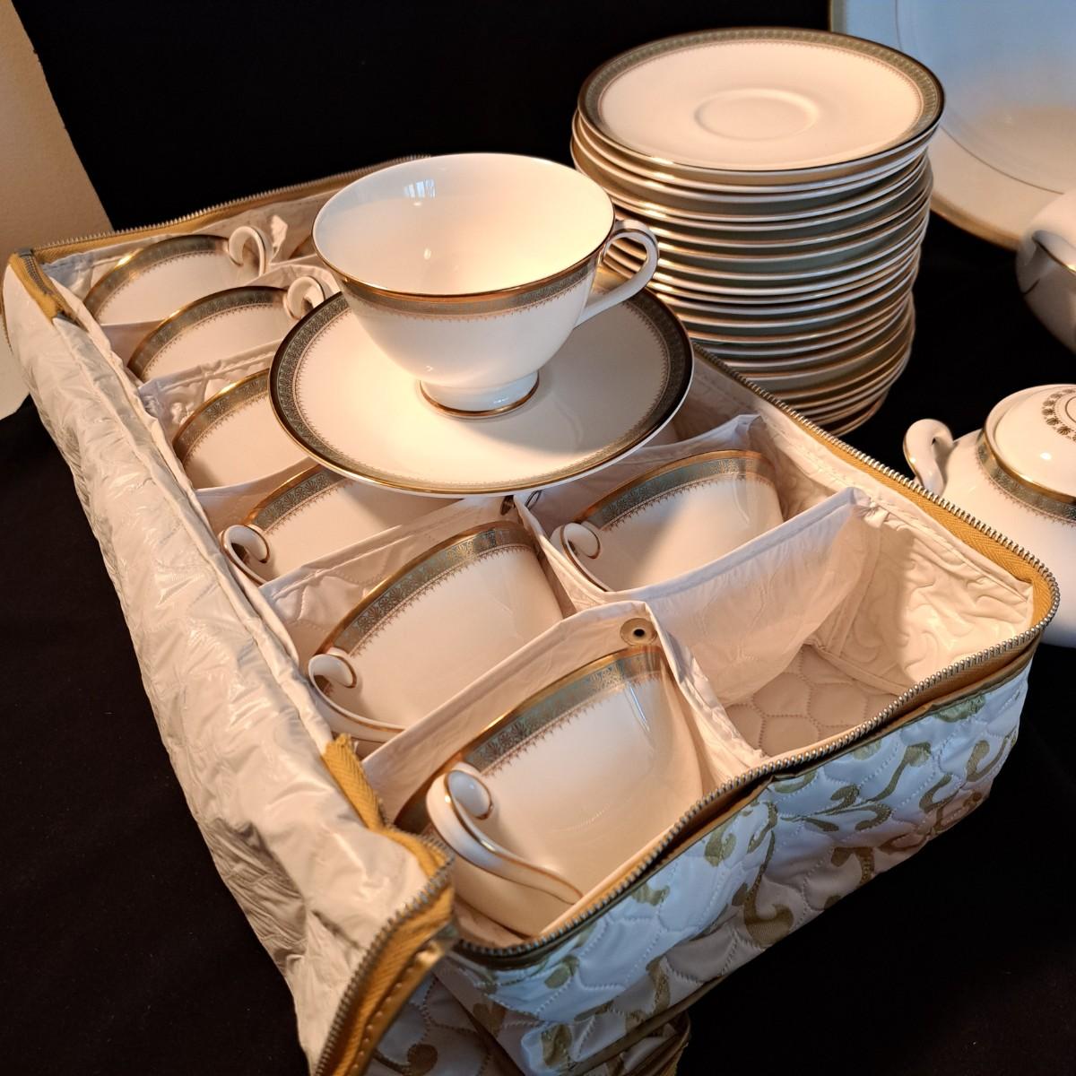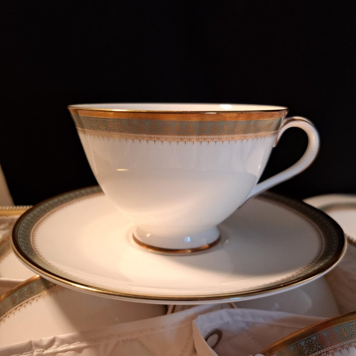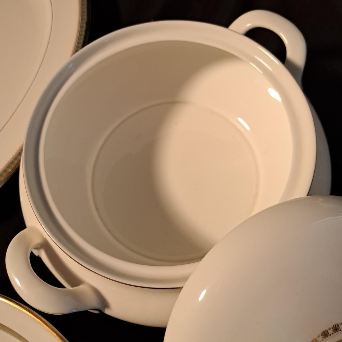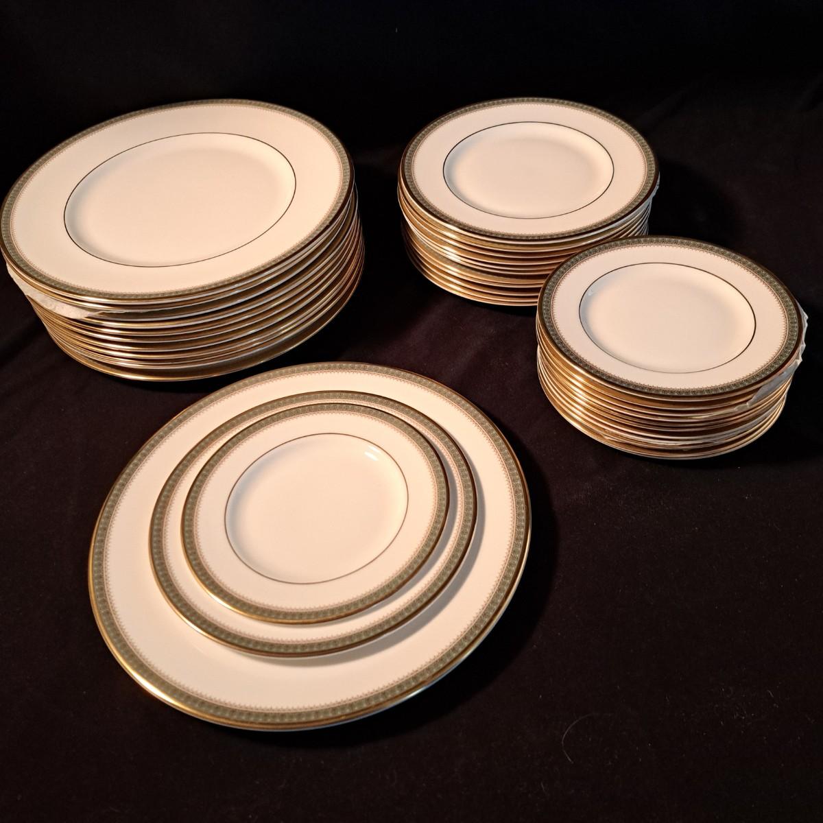 Lovely, well-cared for Royal Doulton 'Clarendon' china setting for 12, each piece rimmed with a gilt gold and turquoise filigree design. Includes extra saucers (*an additional 12) for teacups, 3 sizes of plates, two-handled soup bowls, large platter, lidded tureen, vegetable serving bowl, lidded sugar, creamer, gravy boat -- and more. See photos for measurements. Includes protective quilted care covers. Shipping available. Shipping can be costly. We suggest contacting our preferred local shipping provider, Postage Express, with dimensions and getting an estimate before bidding: (828) 255-9250 or shipping@postageexpressnc.com.