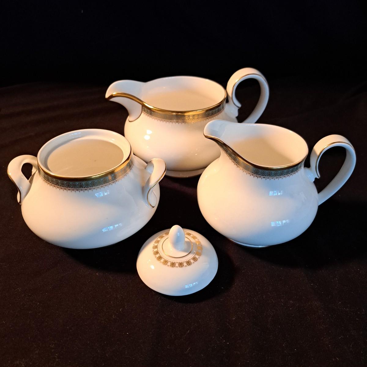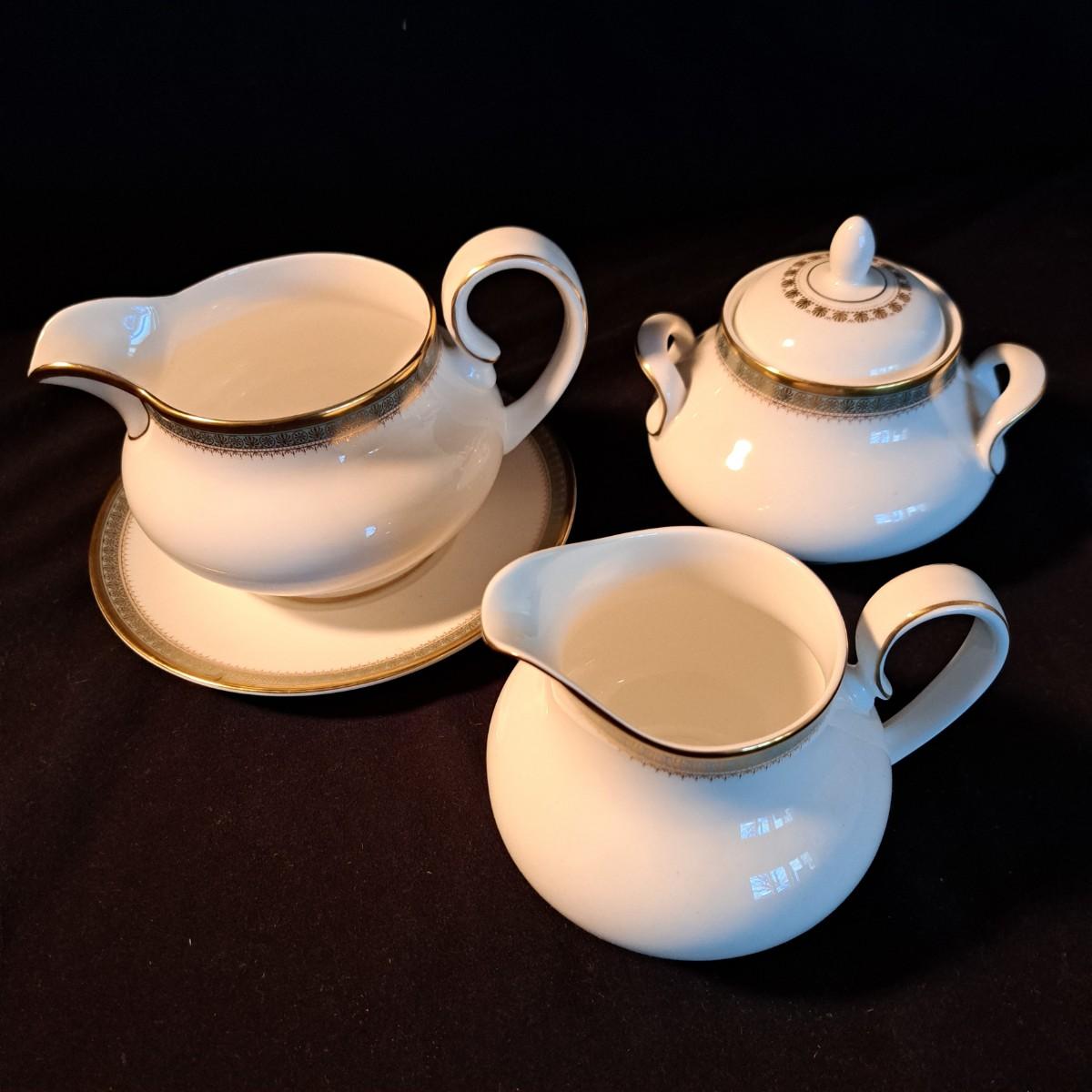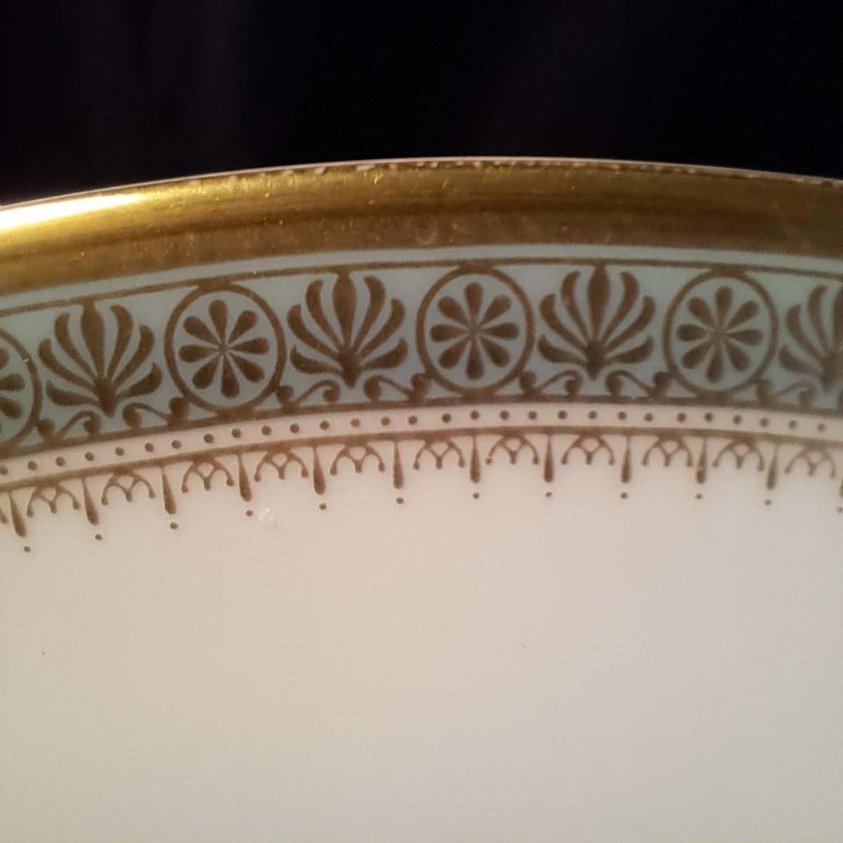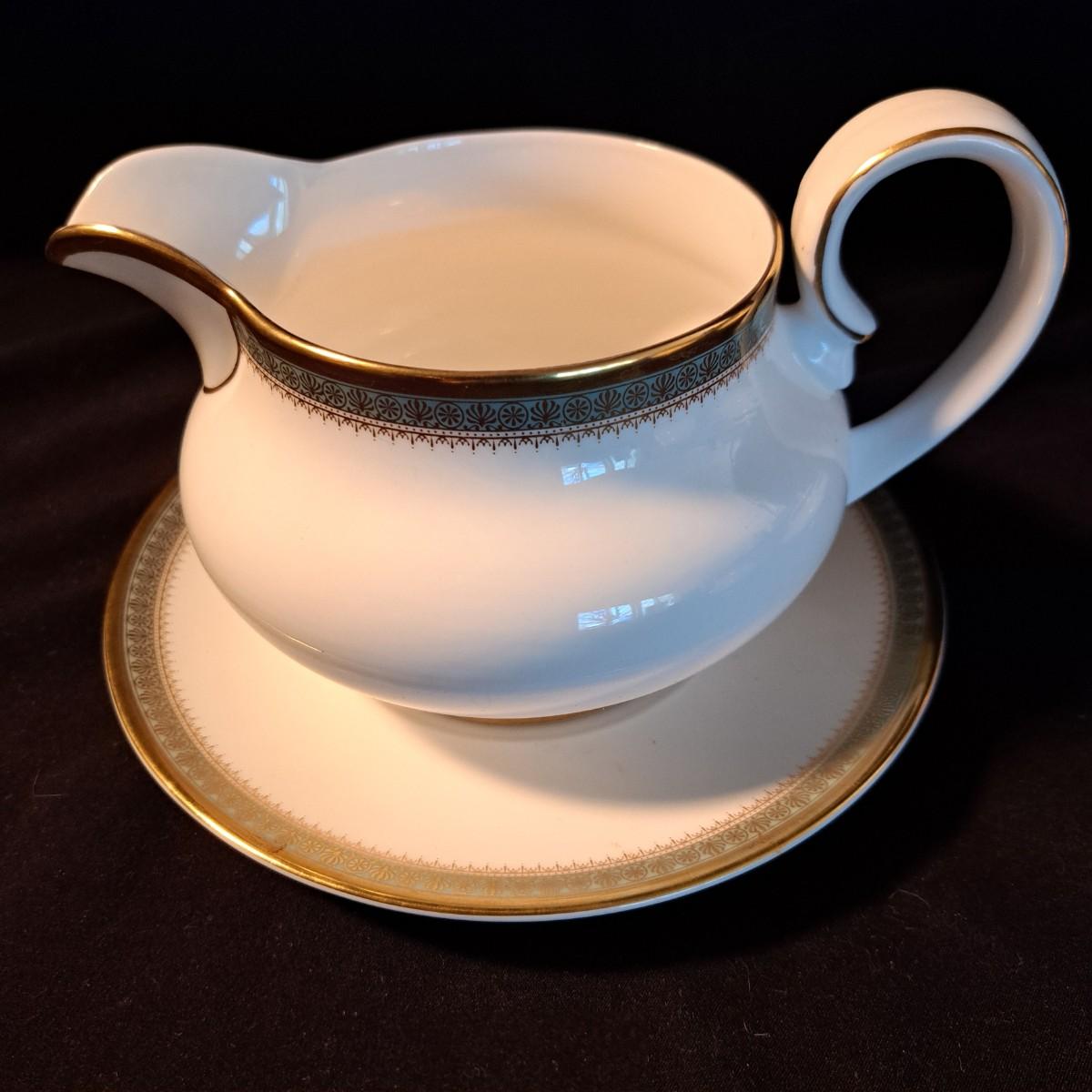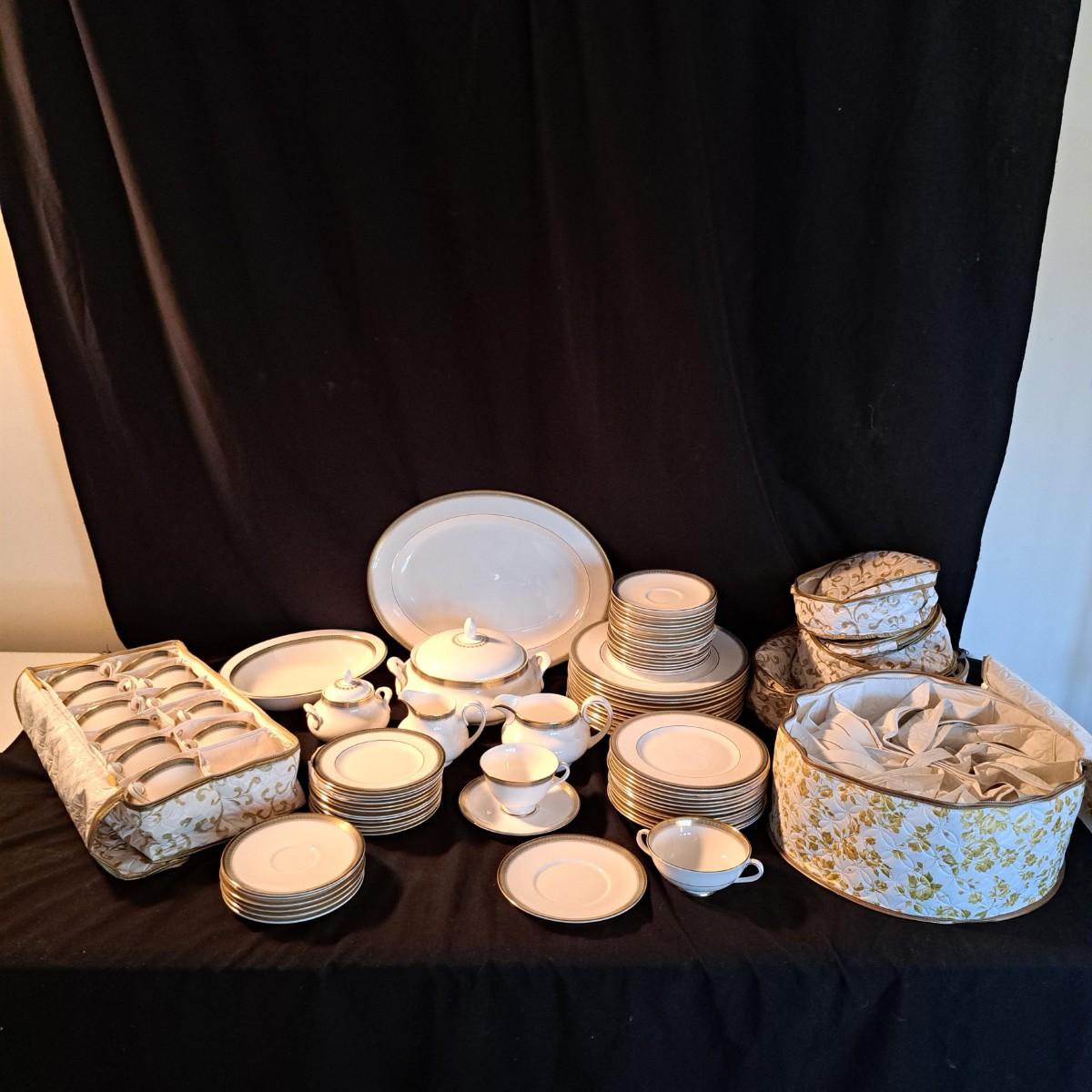 Lovely, well-cared for Royal Doulton 'Clarendon' china setting for 12, each piece rimmed with a gilt gold and turquoise filigree design. Includes extra saucers (*an additional 12) for teacups, 3 sizes of plates, two-handled soup bowls, large platter, lidded tureen, vegetable serving bowl, lidded sugar, creamer, gravy boat -- and more. See photos for measurements. Includes protective quilted care covers. Shipping available. Shipping can be costly. We suggest contacting our preferred local shipping provider, Postage Express, with dimensions and getting an estimate before bidding: (828) 255-9250 or shipping@postageexpressnc.com.